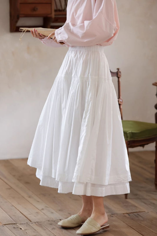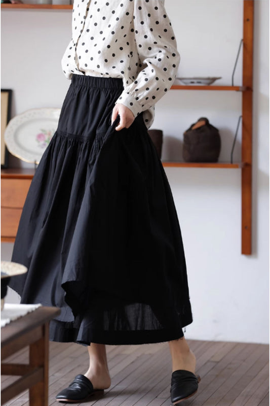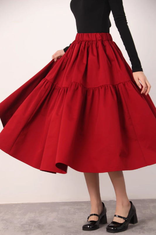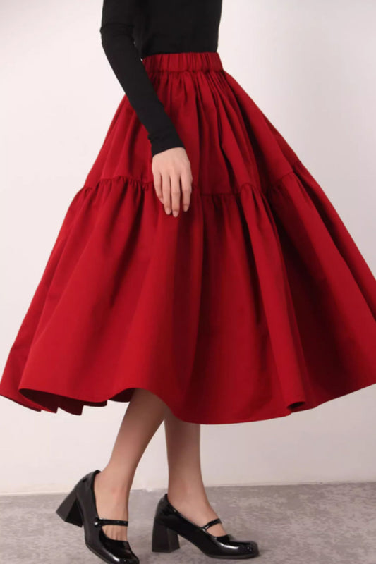 Red Linen Cotton Pleated Skirt with Irregular Hem and Pockets | Xiaolizi 0852