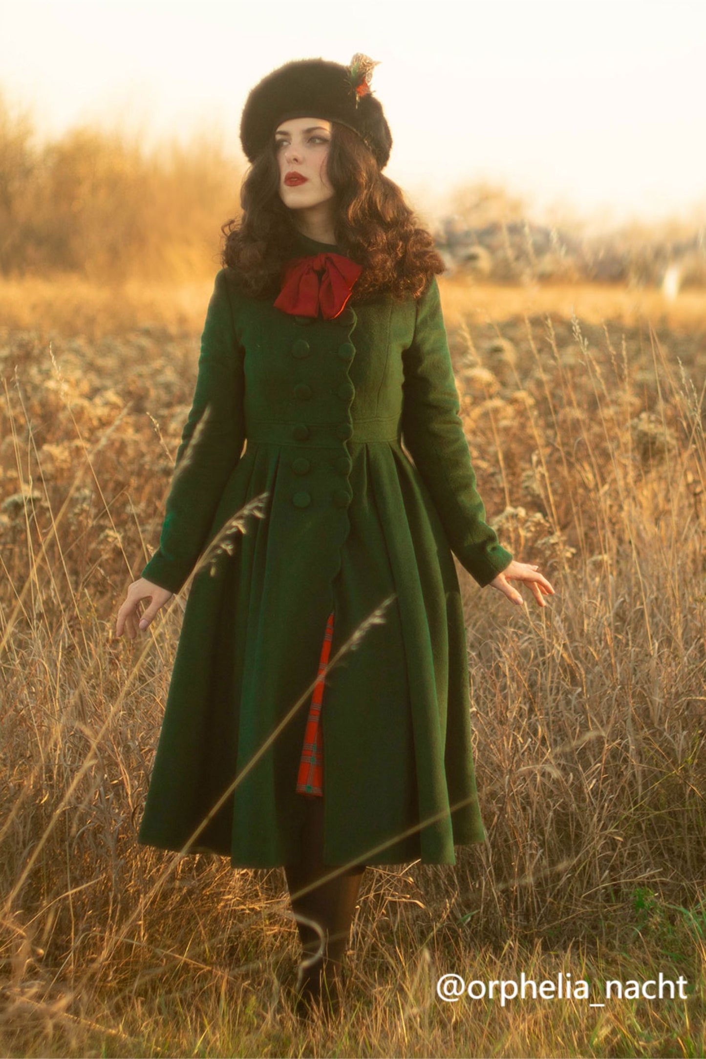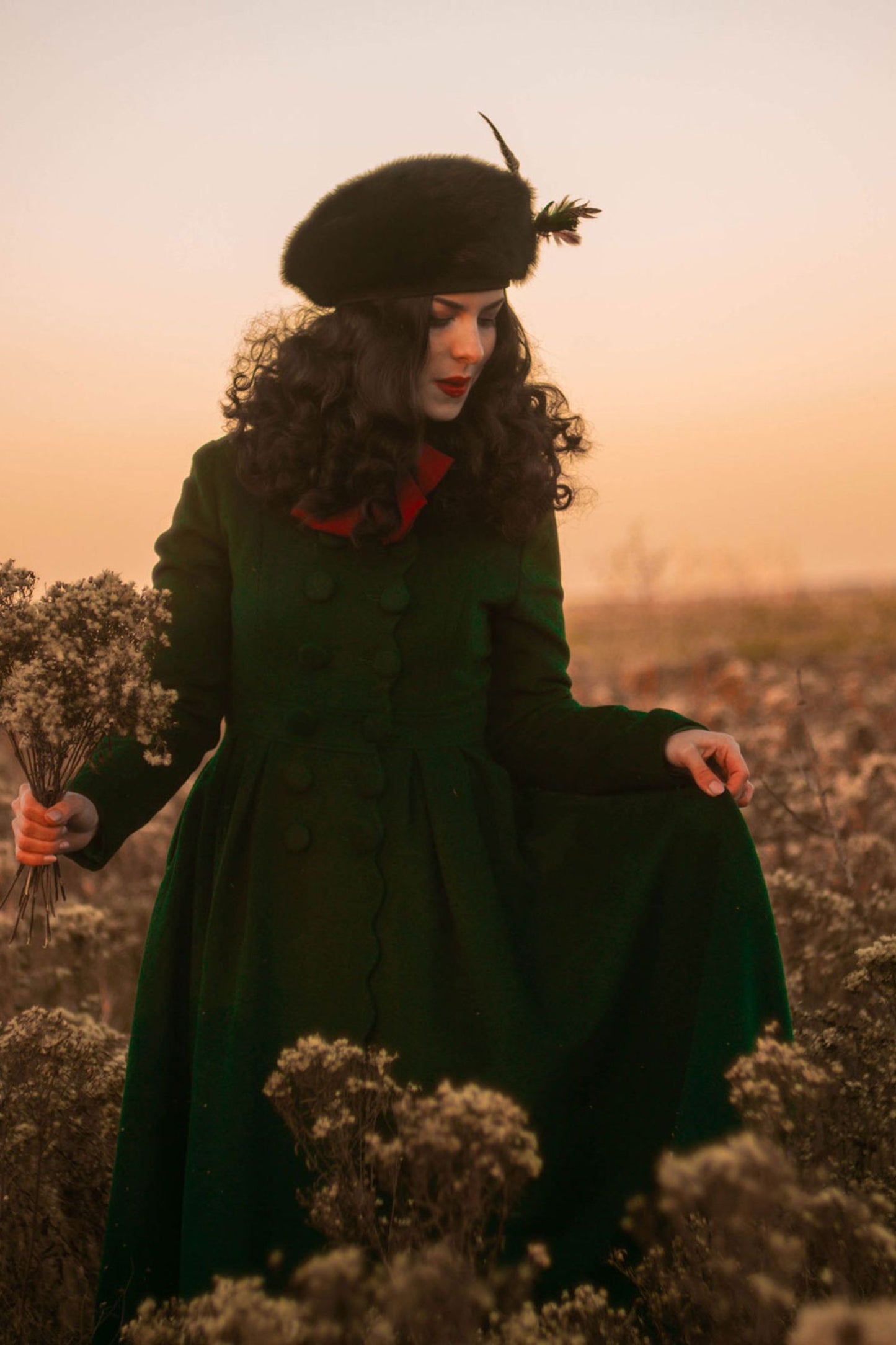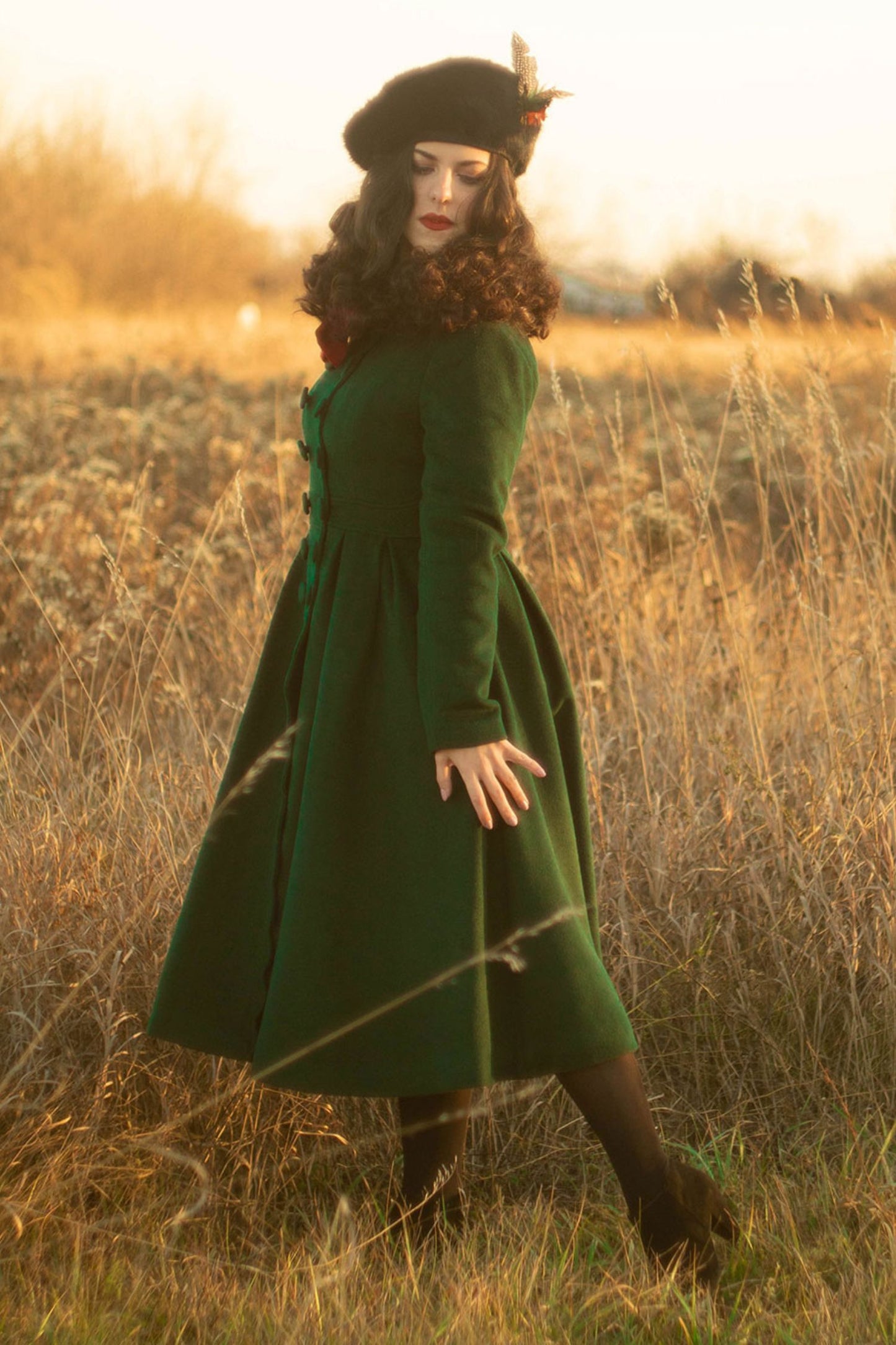 Inspired by the elegance of 1940s winter fashion, this forest green princess coat blends classic tailoring with timeless feminine charm. The structured pleating and fitted waist create a graceful silhouette, while the full skirt moves beautifully with each step. Crafted from a warm wool blend and fully lined for comfort, this coat brings vintage romance to modern winter days — a true statement piece for women who appreciate enduring style.