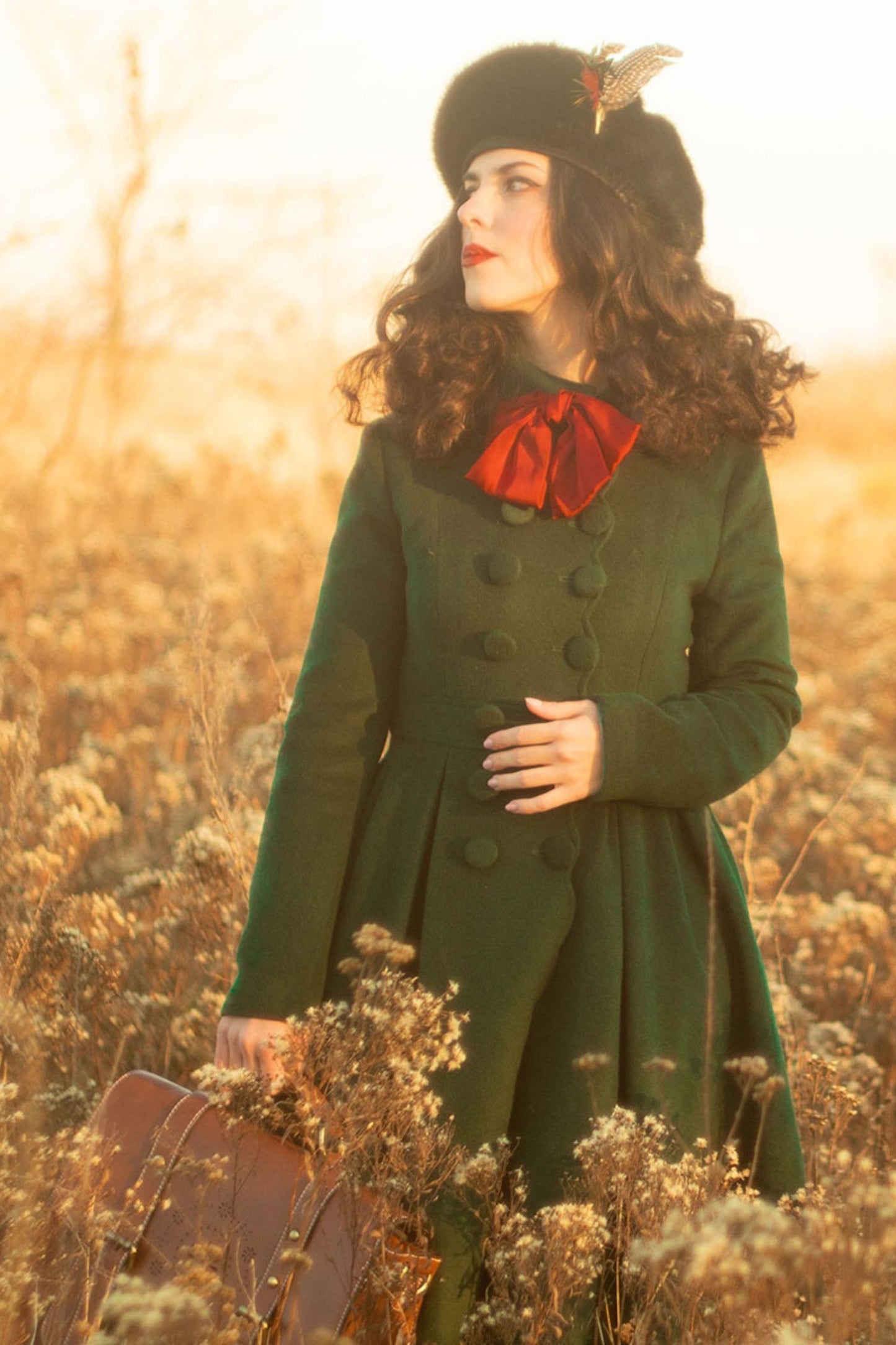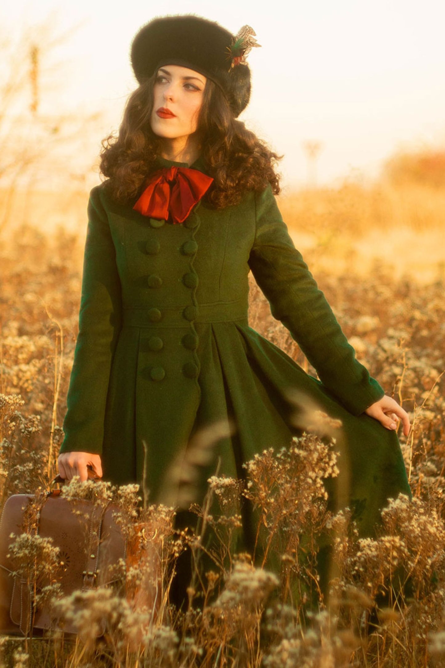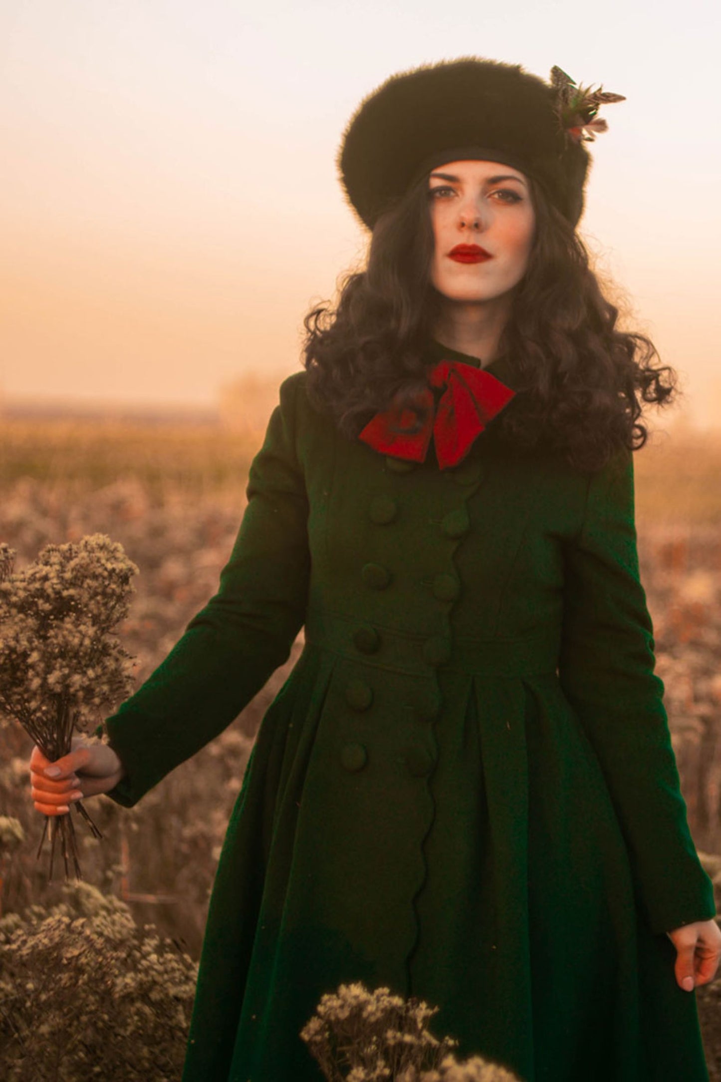 Inspired by the elegance of 1940s winter fashion, this forest green princess coat blends classic tailoring with timeless feminine charm. The structured pleating and fitted waist create a graceful silhouette, while the full skirt moves beautifully with each step. Crafted from a warm wool blend and fully lined for comfort, this coat brings vintage romance to modern winter days — a true statement piece for women who appreciate enduring style.