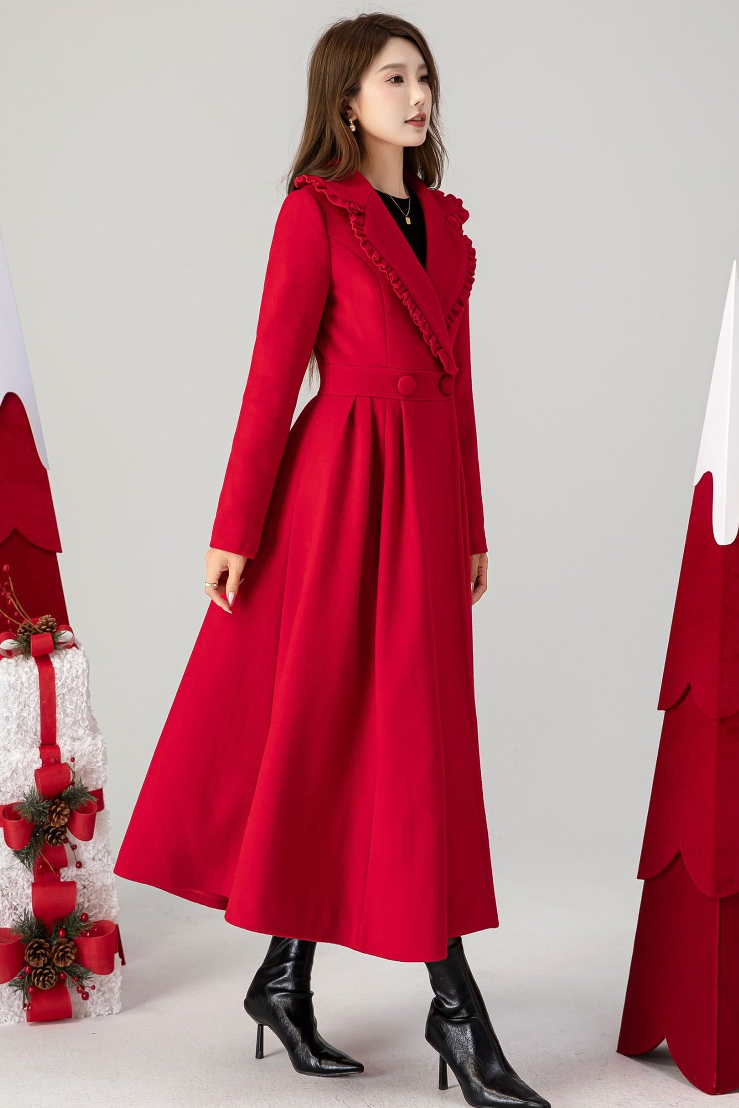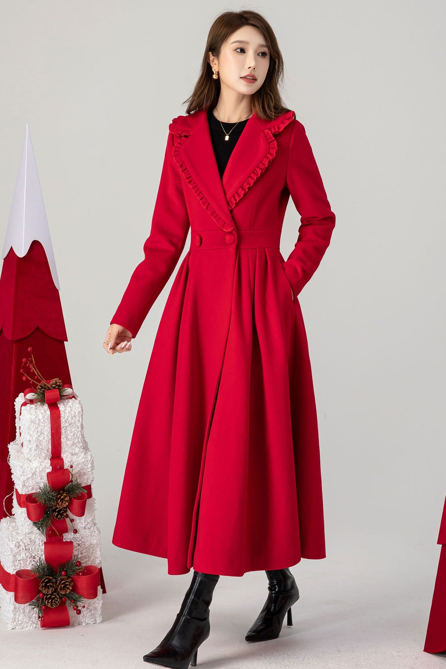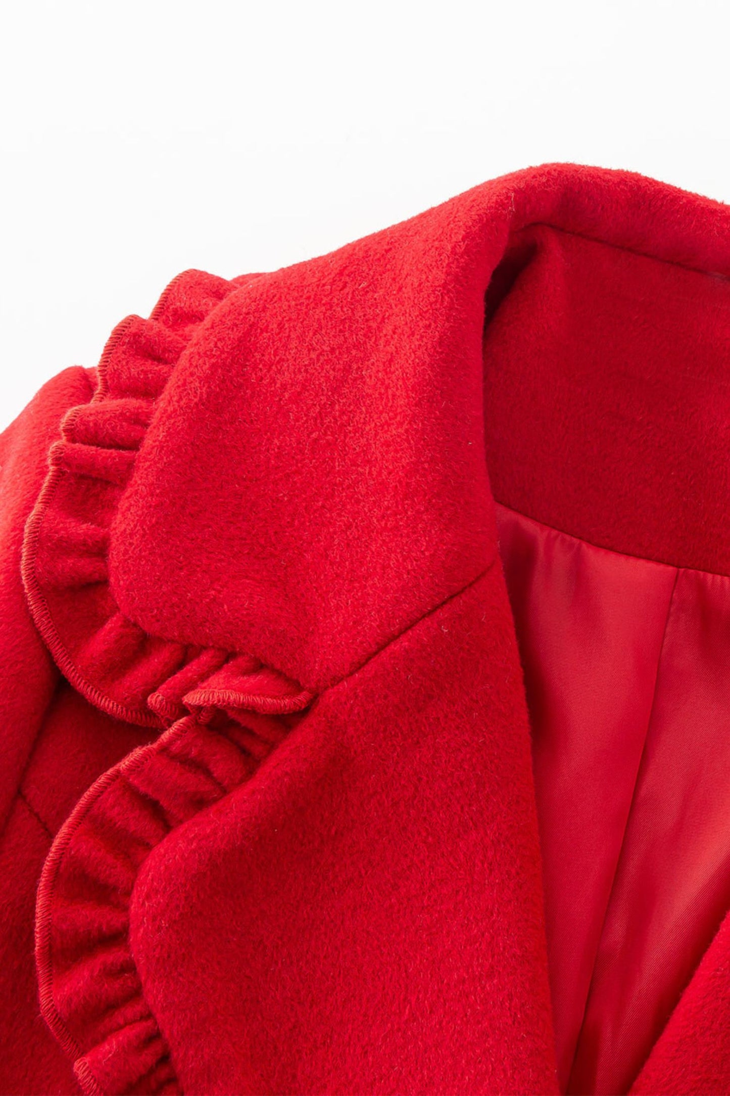 Red mid-length wool princess coat with delicate ruffle trim along the collar. This coat effortlessly blends elegance and style. The rich red hue adds a touch of sophistication, while the charming ruffle detail at the collar makes a statement. Crafted from premium wool, it promises both warmth and comfort. Ideal for various occasions, from formal gatherings to everyday chic.