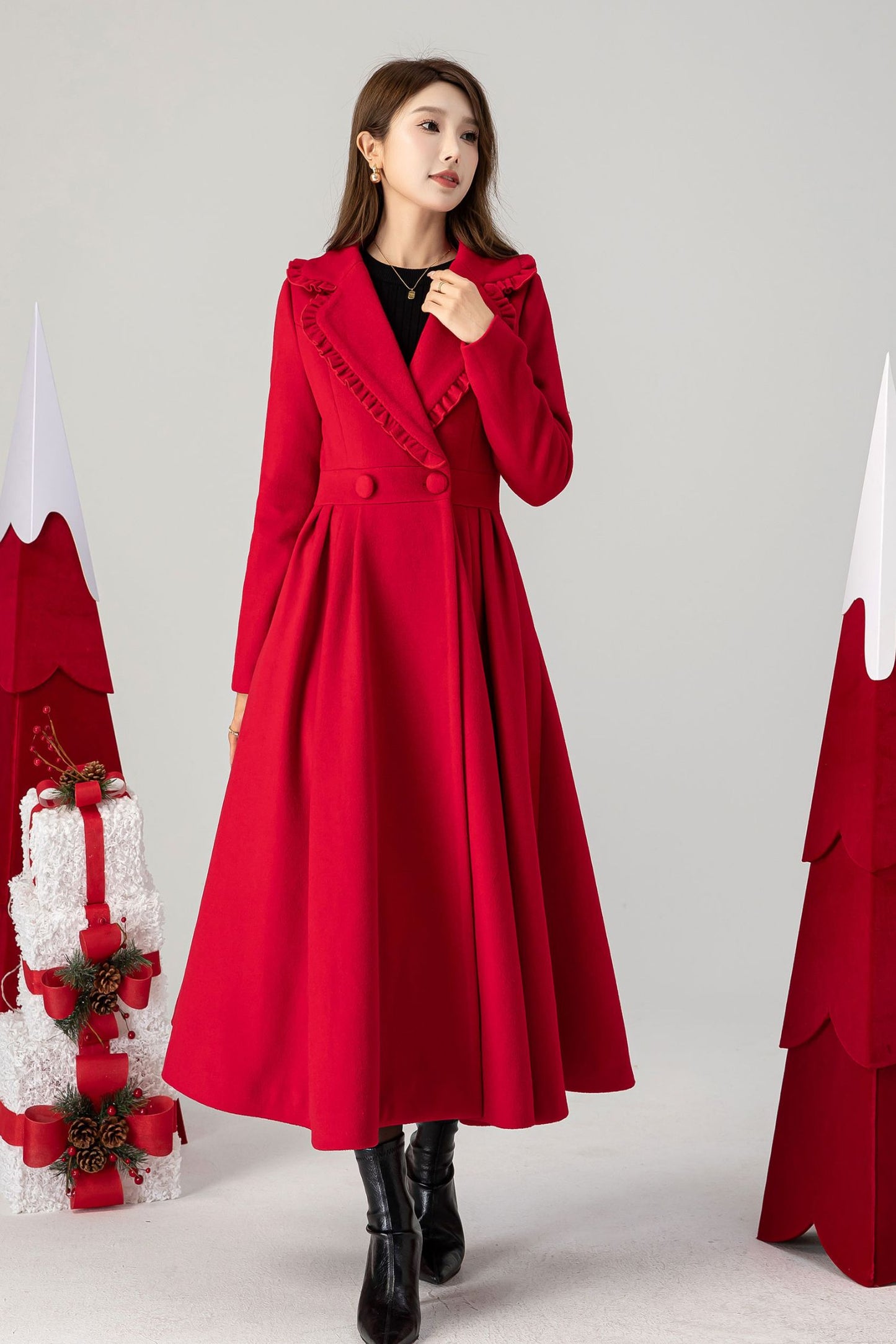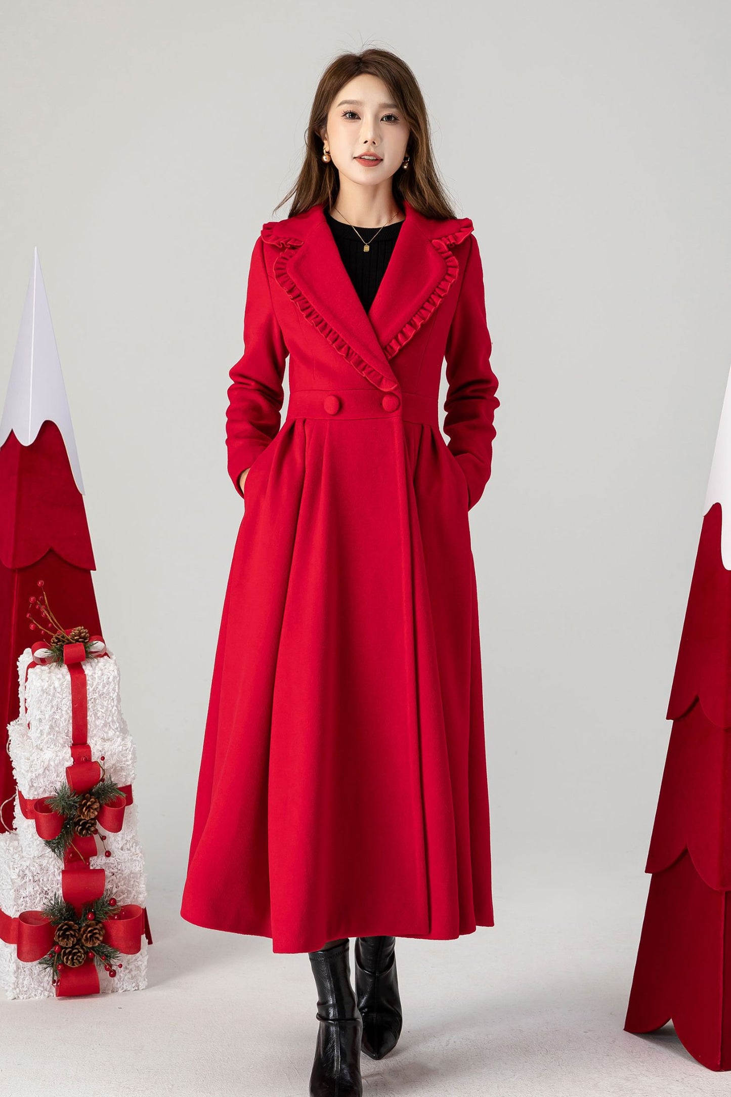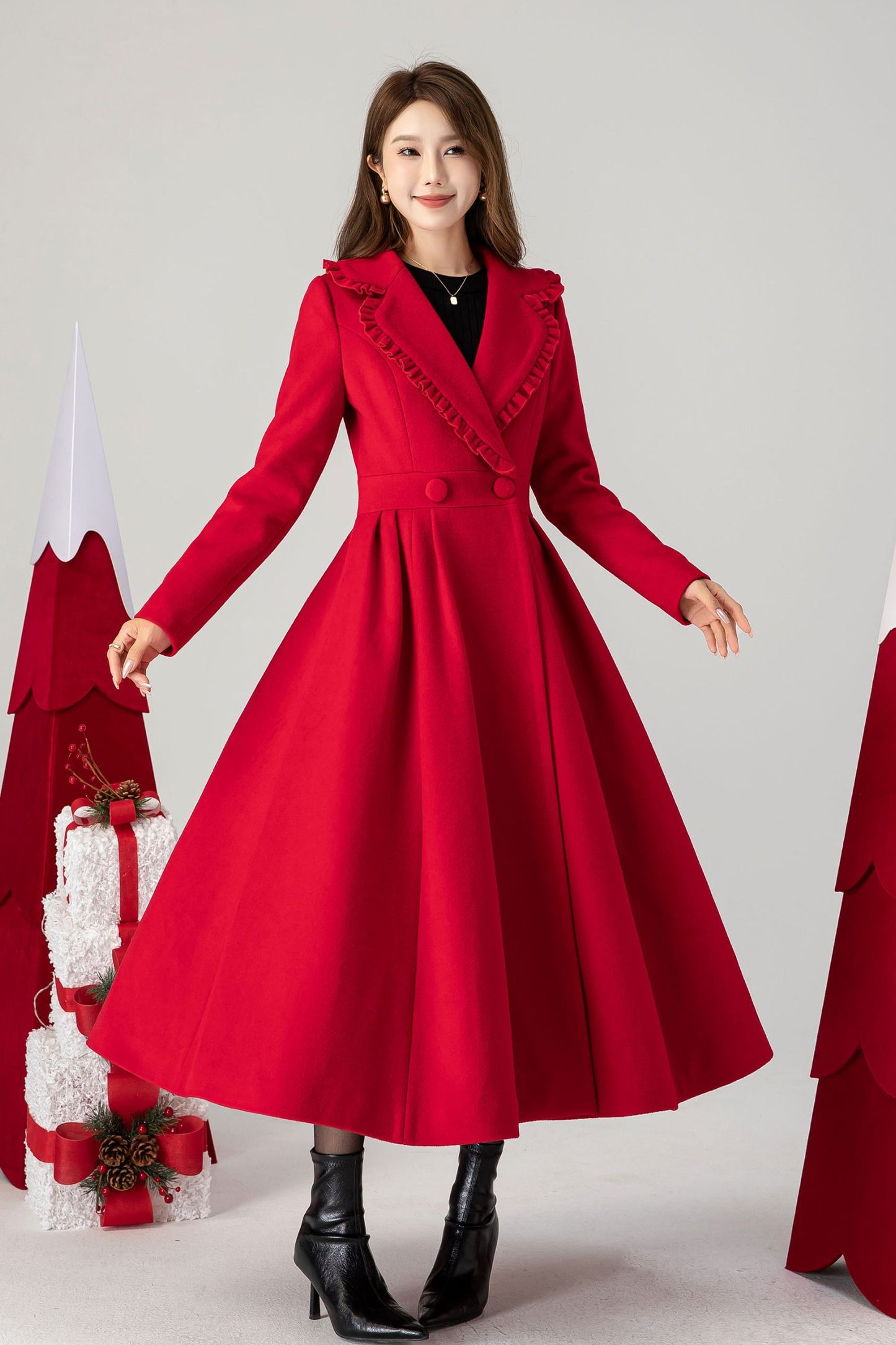 Red mid-length wool princess coat with delicate ruffle trim along the collar. This coat effortlessly blends elegance and style. The rich red hue adds a touch of sophistication, while the charming ruffle detail at the collar makes a statement. Crafted from premium wool, it promises both warmth and comfort. Ideal for various occasions, from formal gatherings to everyday chic.