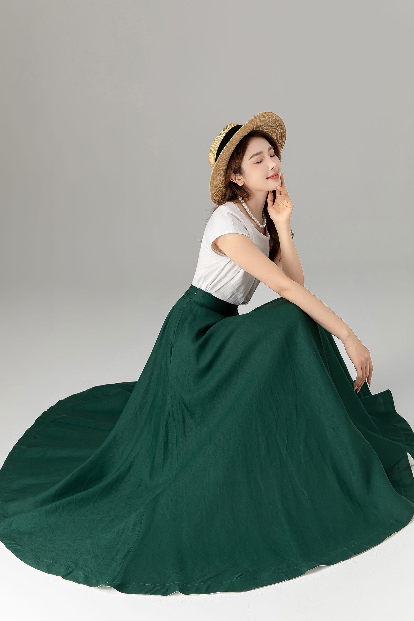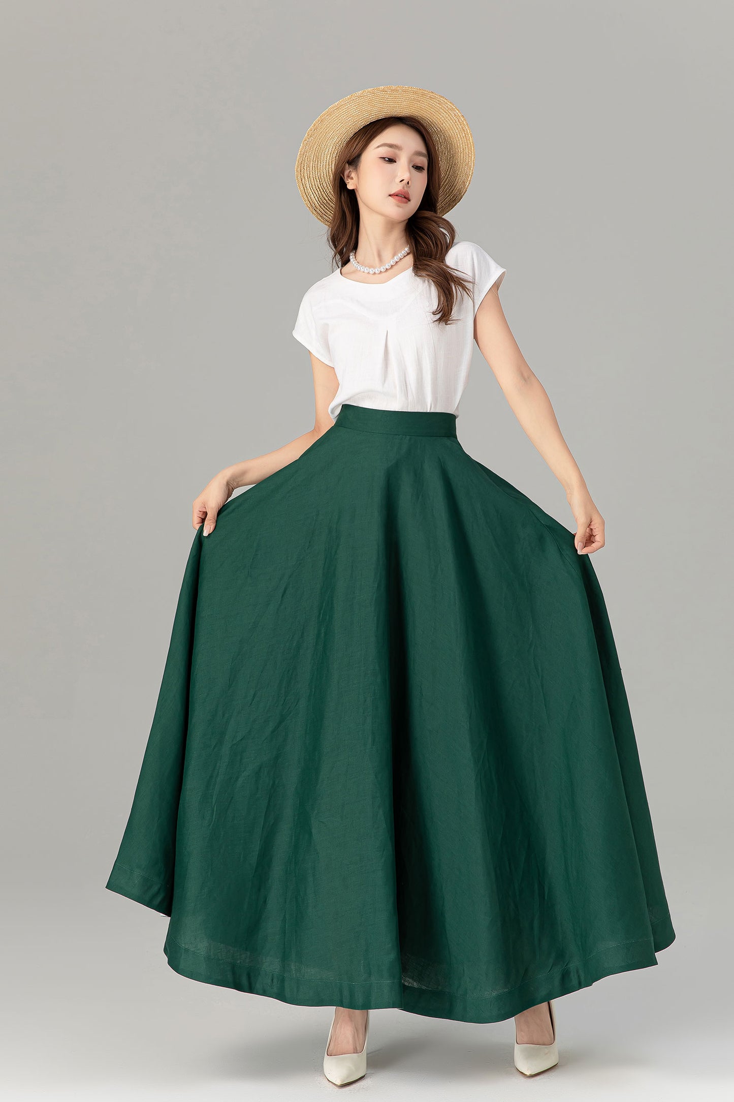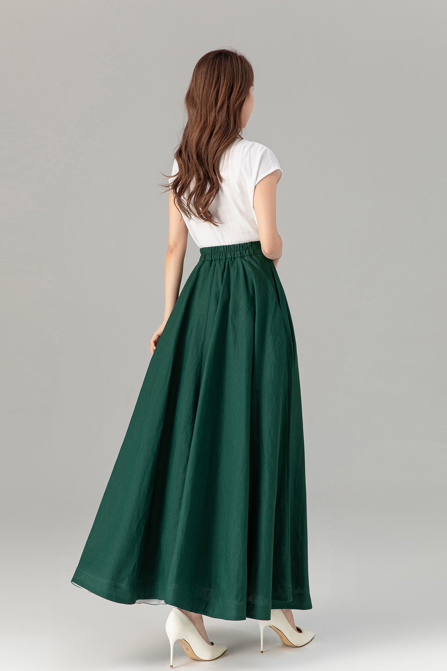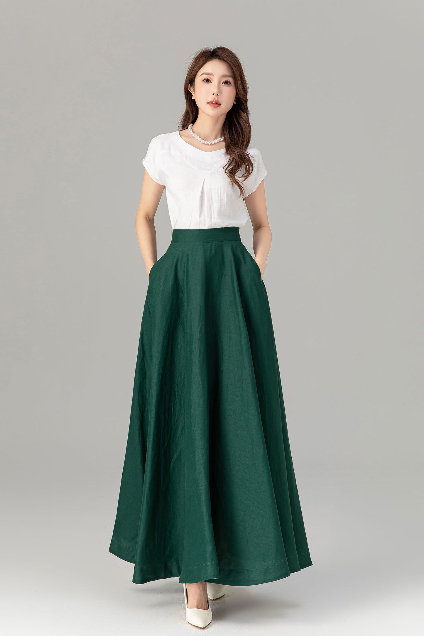 Indulge in pure elegance with our A line maxi green linen skirt. Crafted for women, this skirt features pockets for convenience and a flowy silhouette that flatters all figures.