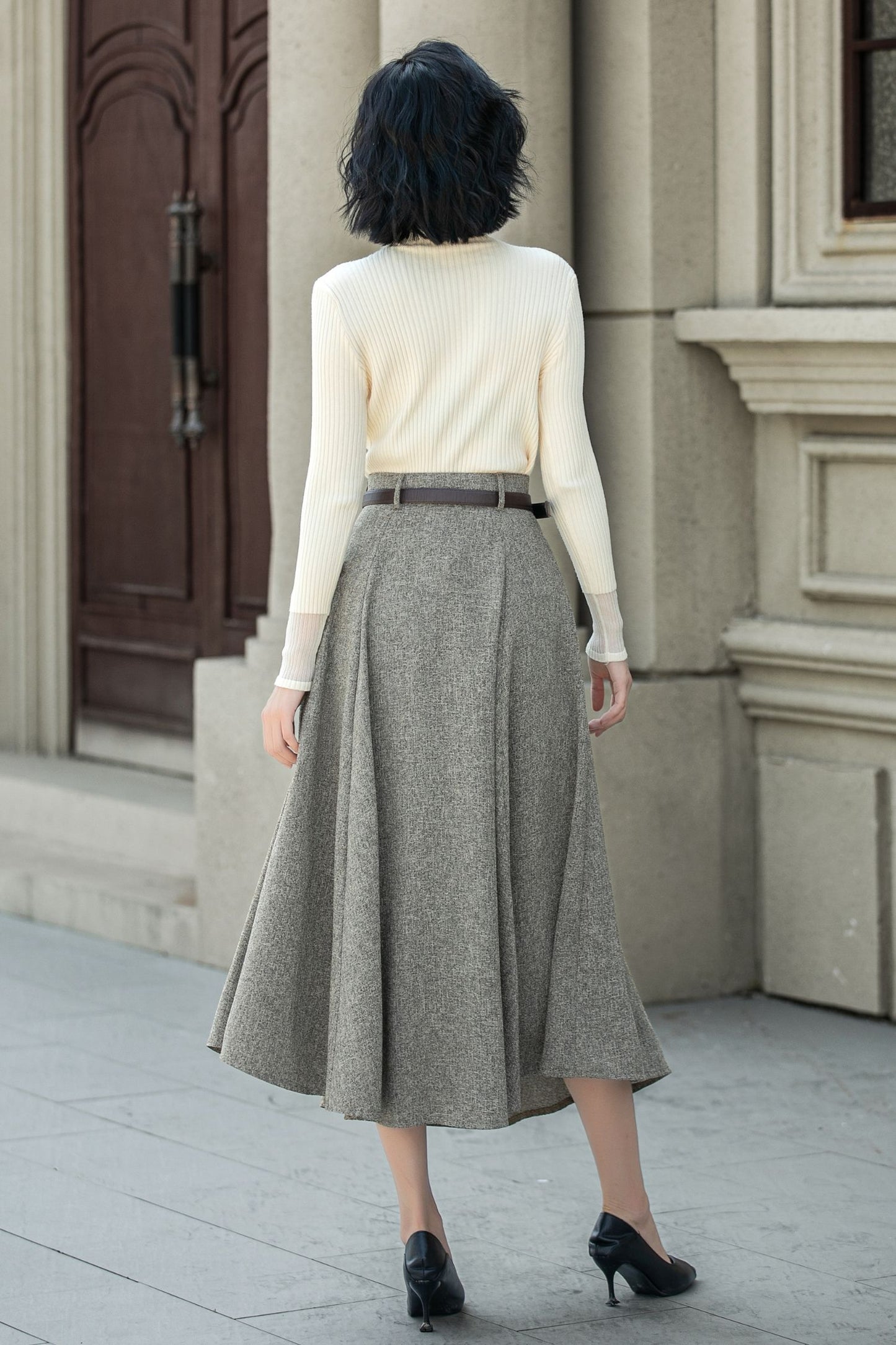 Spice up your wardrobe with this chic wool skirt featuring a high waist and belt loops. Embrace your boldness by pairing it with a belt like the model, or create a daring look with boots and a coat during the colder season.