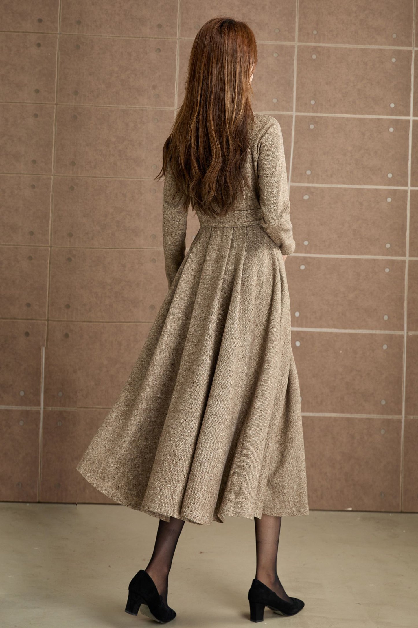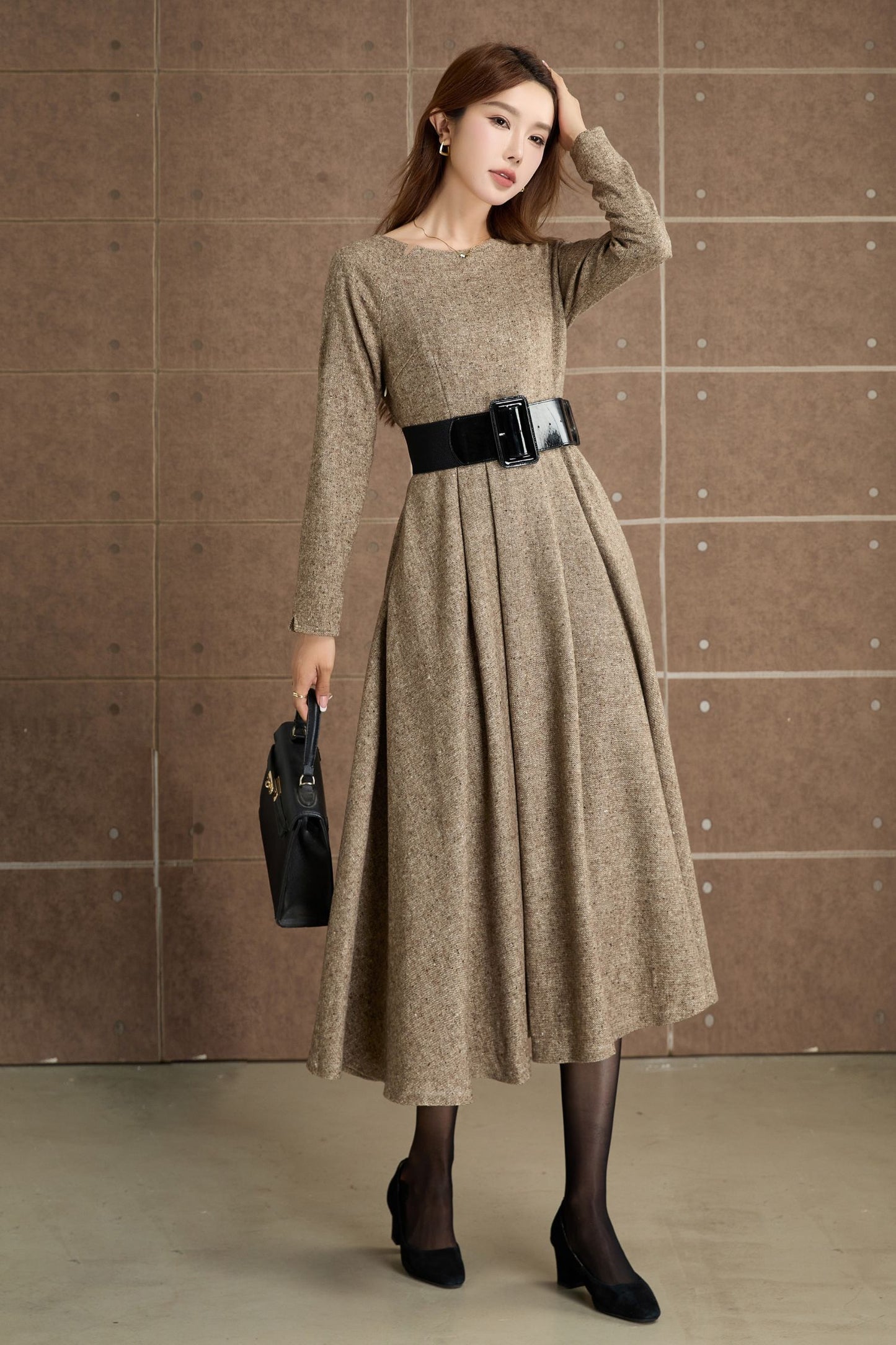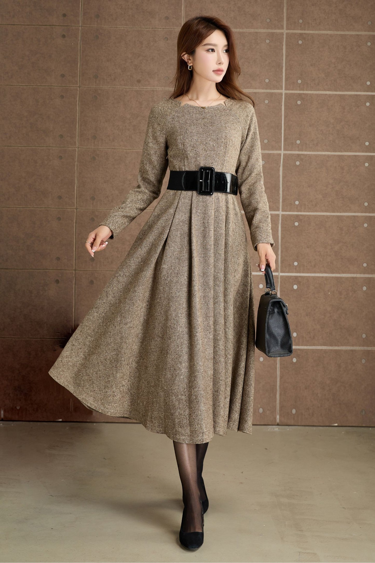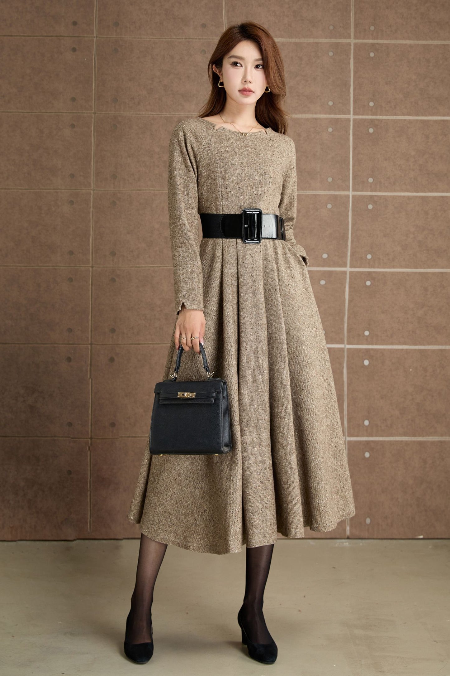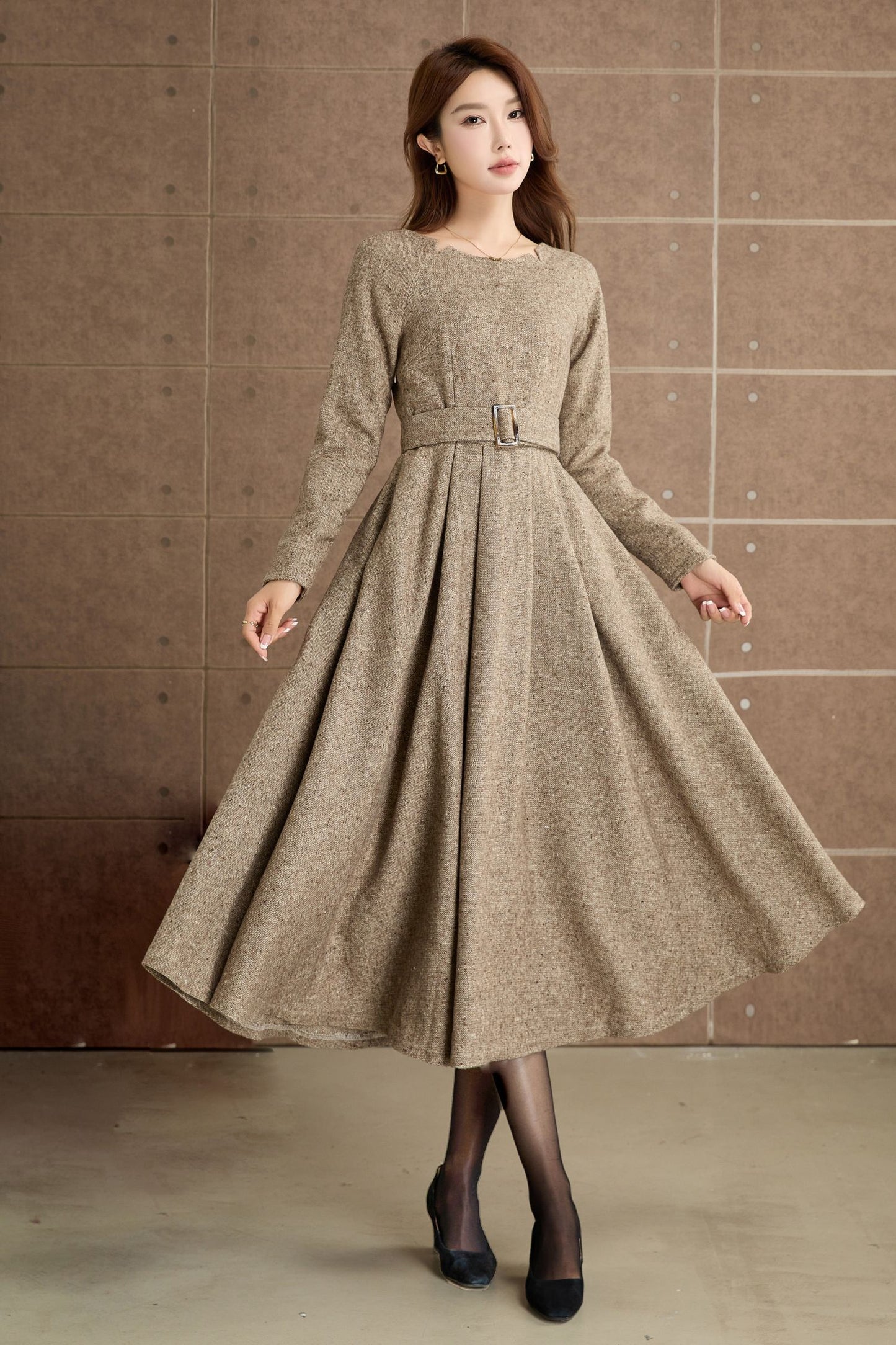 Embrace effortless elegance with this handmade camel wool dress. Designed with a flattering fit-and-flare silhouette, midi length, and matching belt, it creates a timeless vintage look. With long sleeves, soft lining, and hidden pockets, this dress is as practical as it is beautiful—perfect for autumn days, winter gatherings, or sophisticated daily wear.