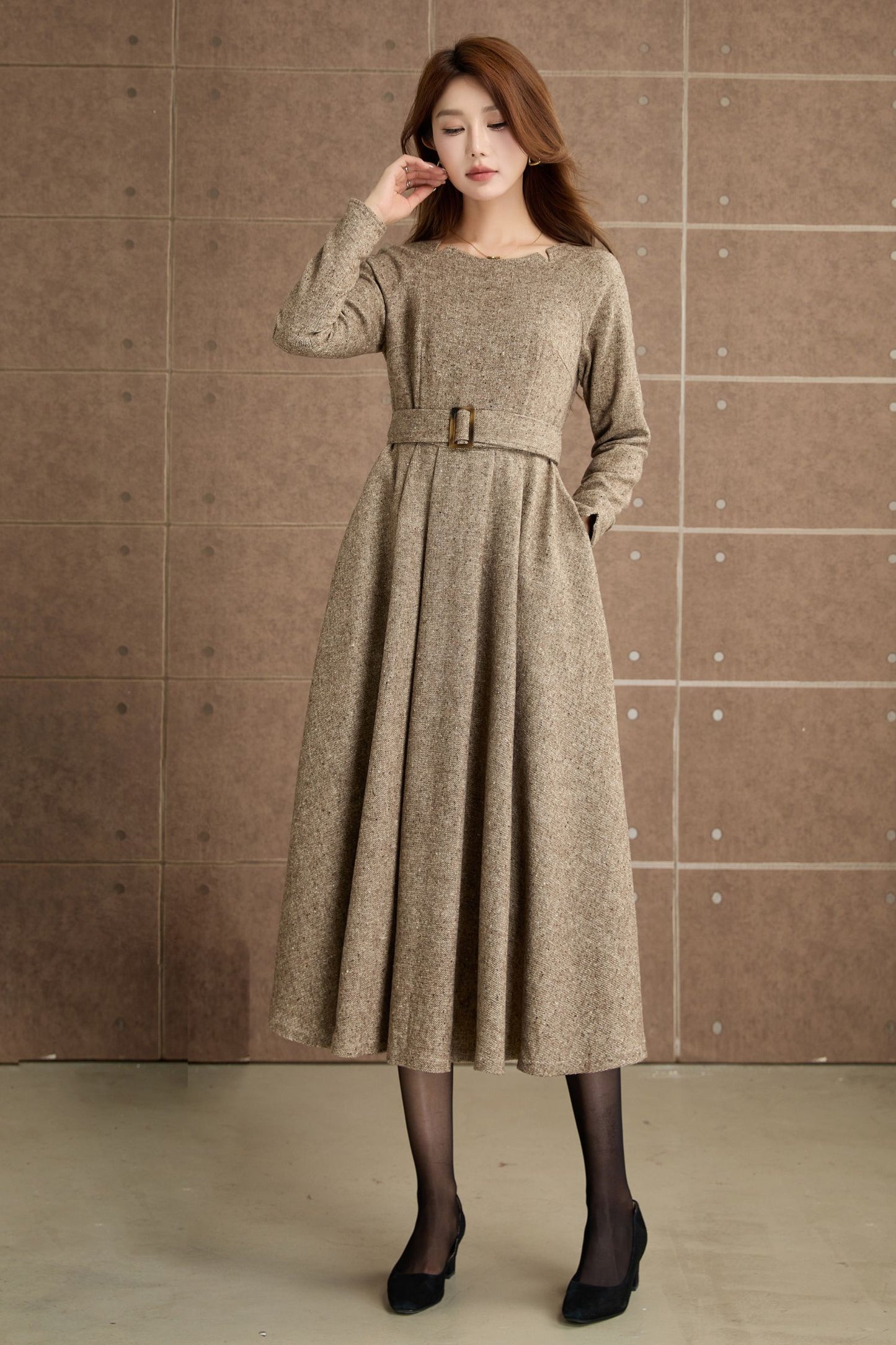 Handmade Wool Blend Dress – Elegant Camel Midi with Pockets 5361