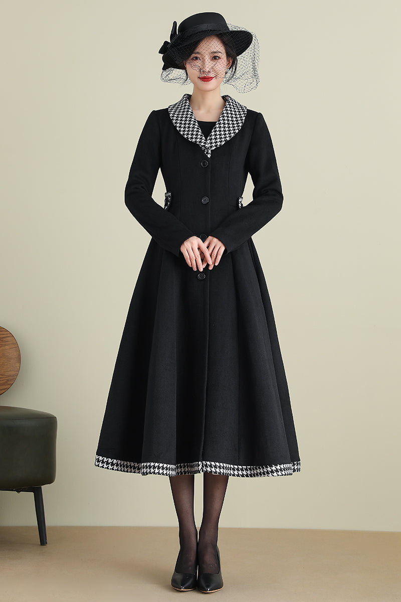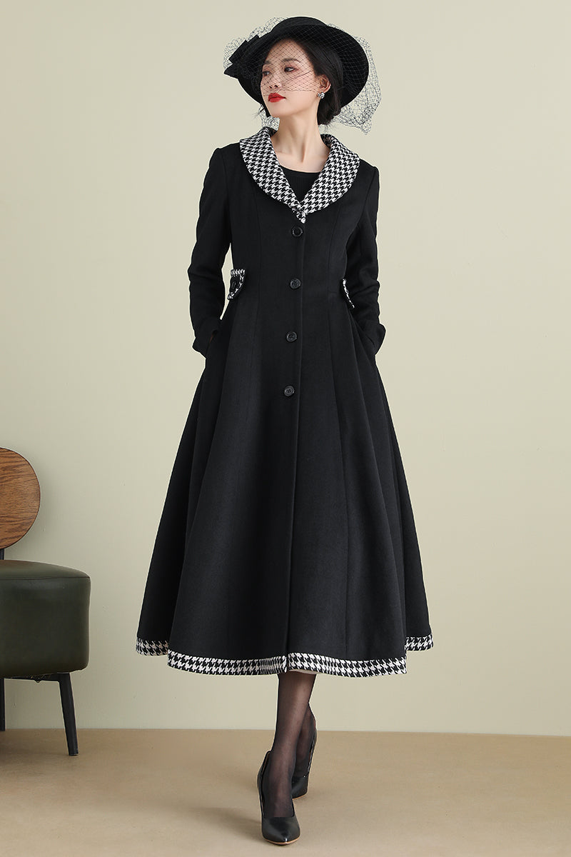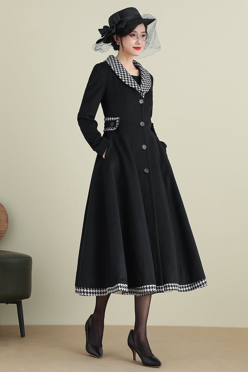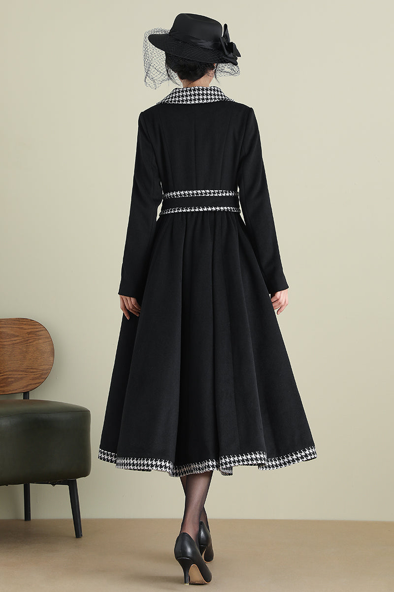 Black Wool Coat with Houndstooth Trim – Vintage Fit & Flare Long Winter Coat 3897