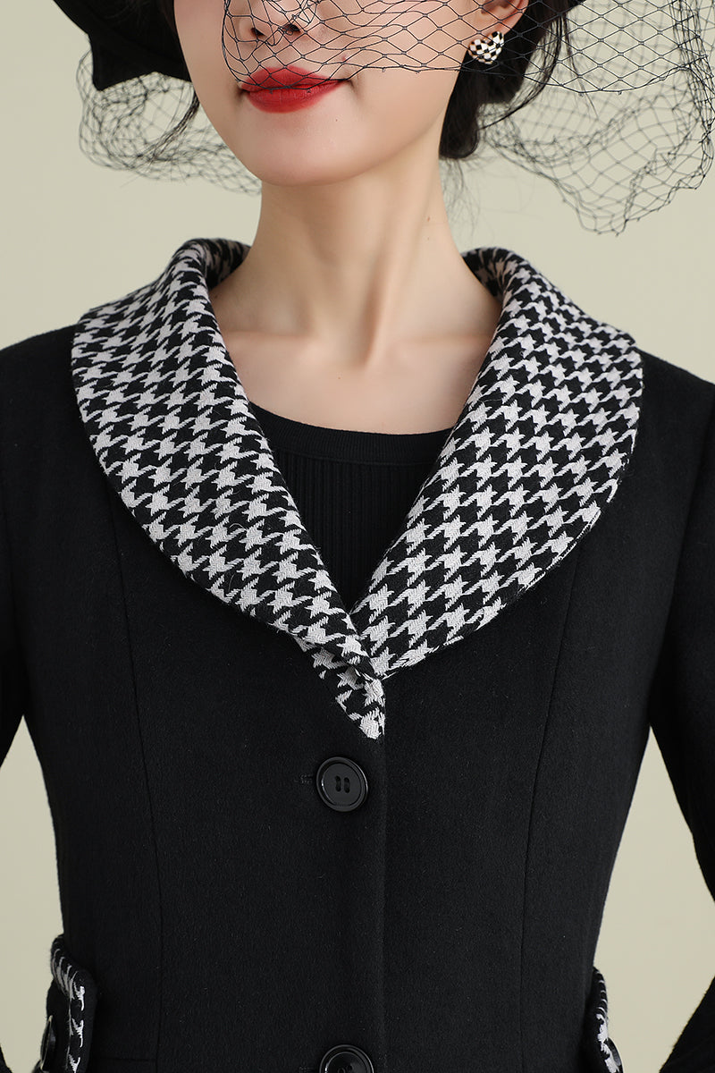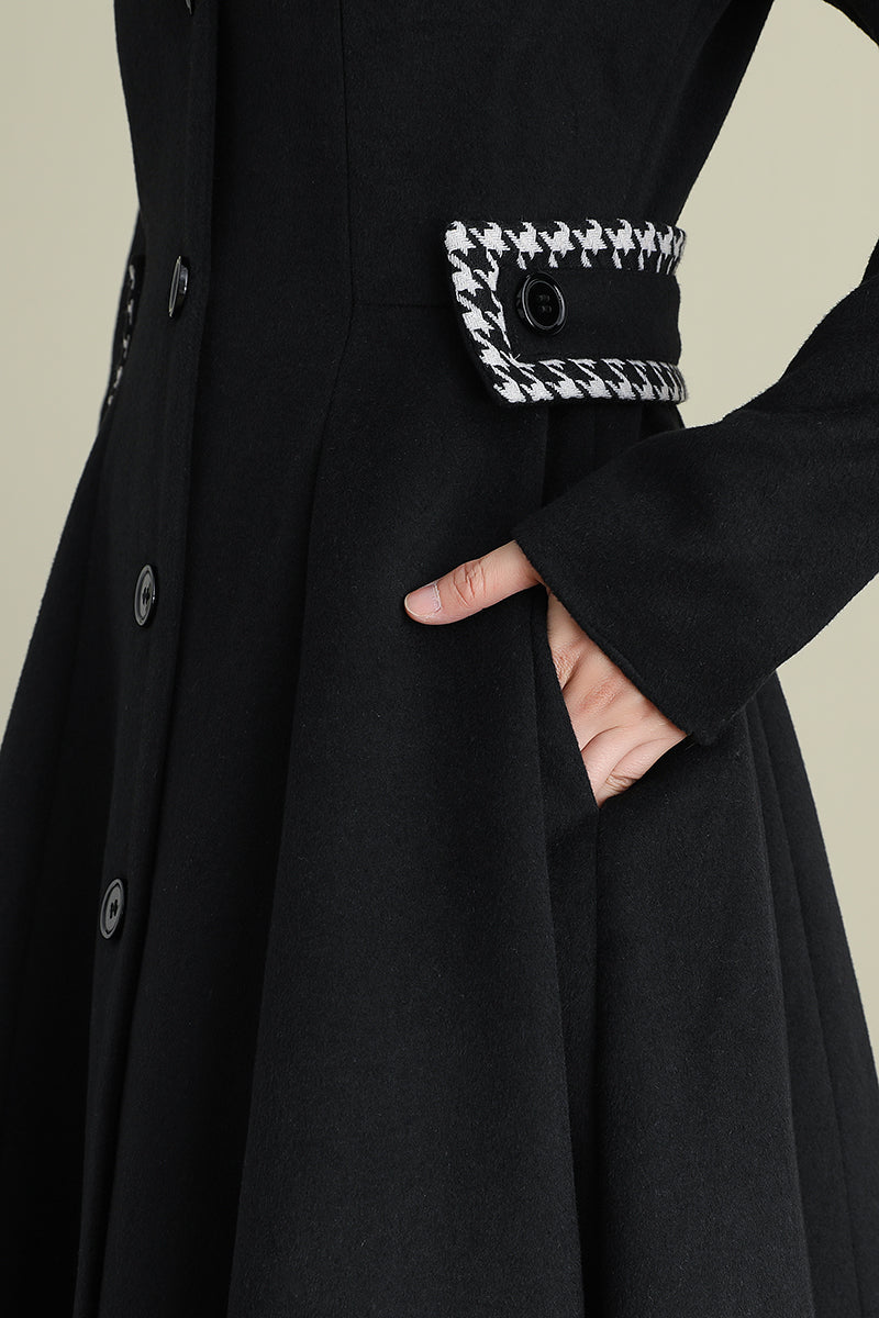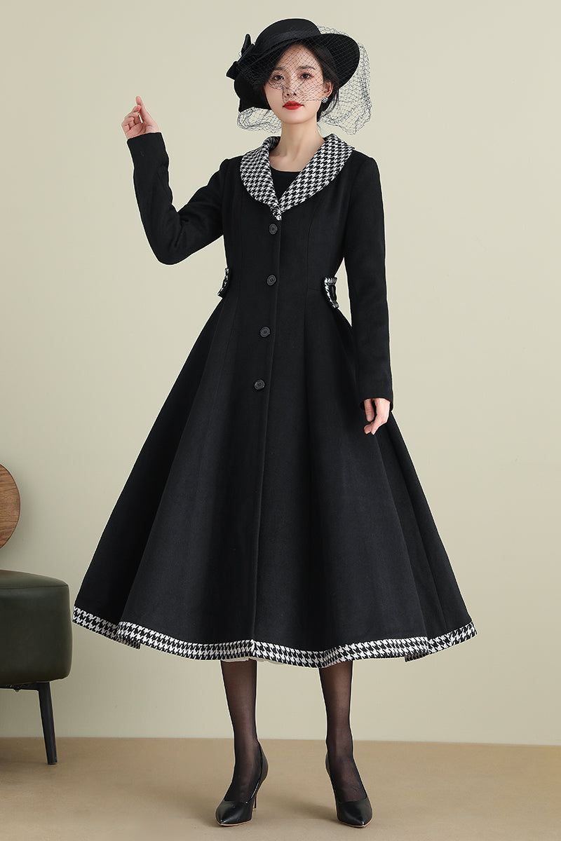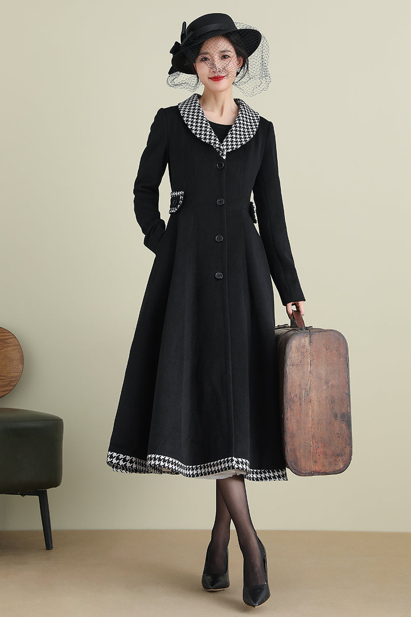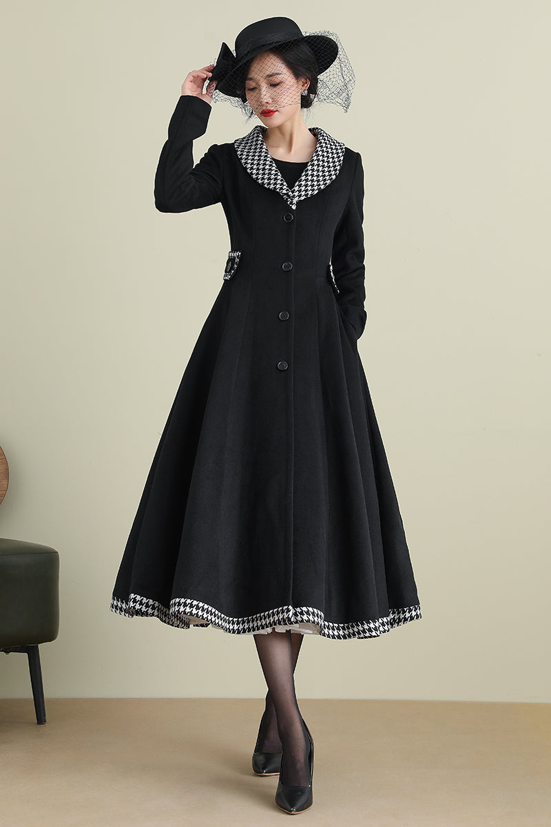 Black Wool Coat with Houndstooth Trim – Vintage Fit & Flare Long Winter Coat 3897