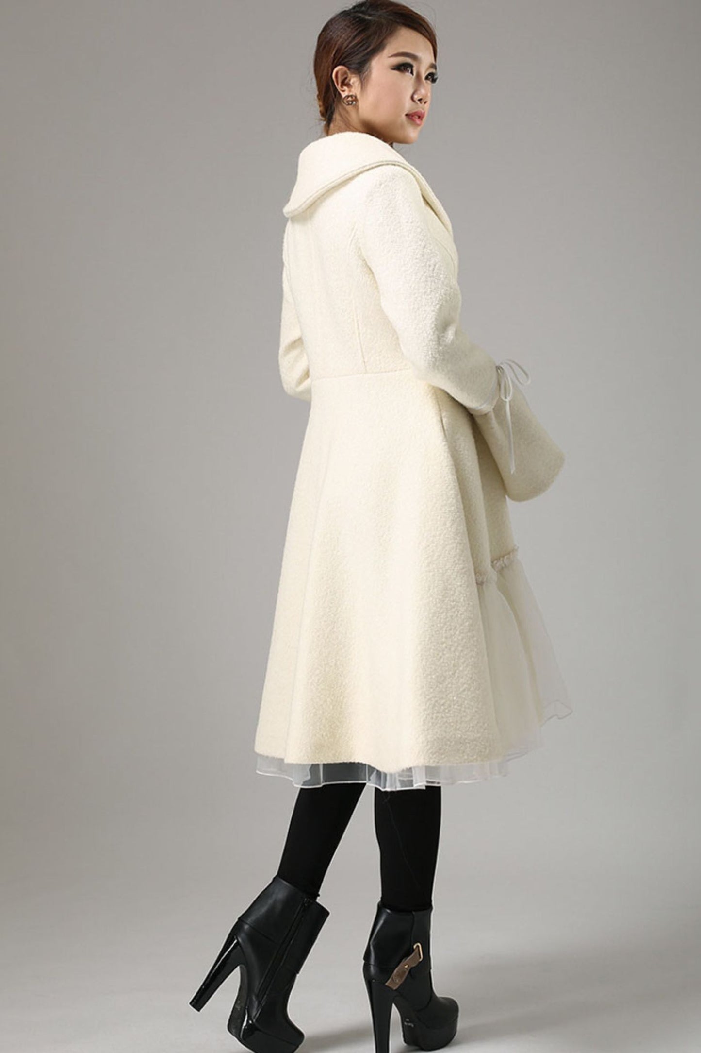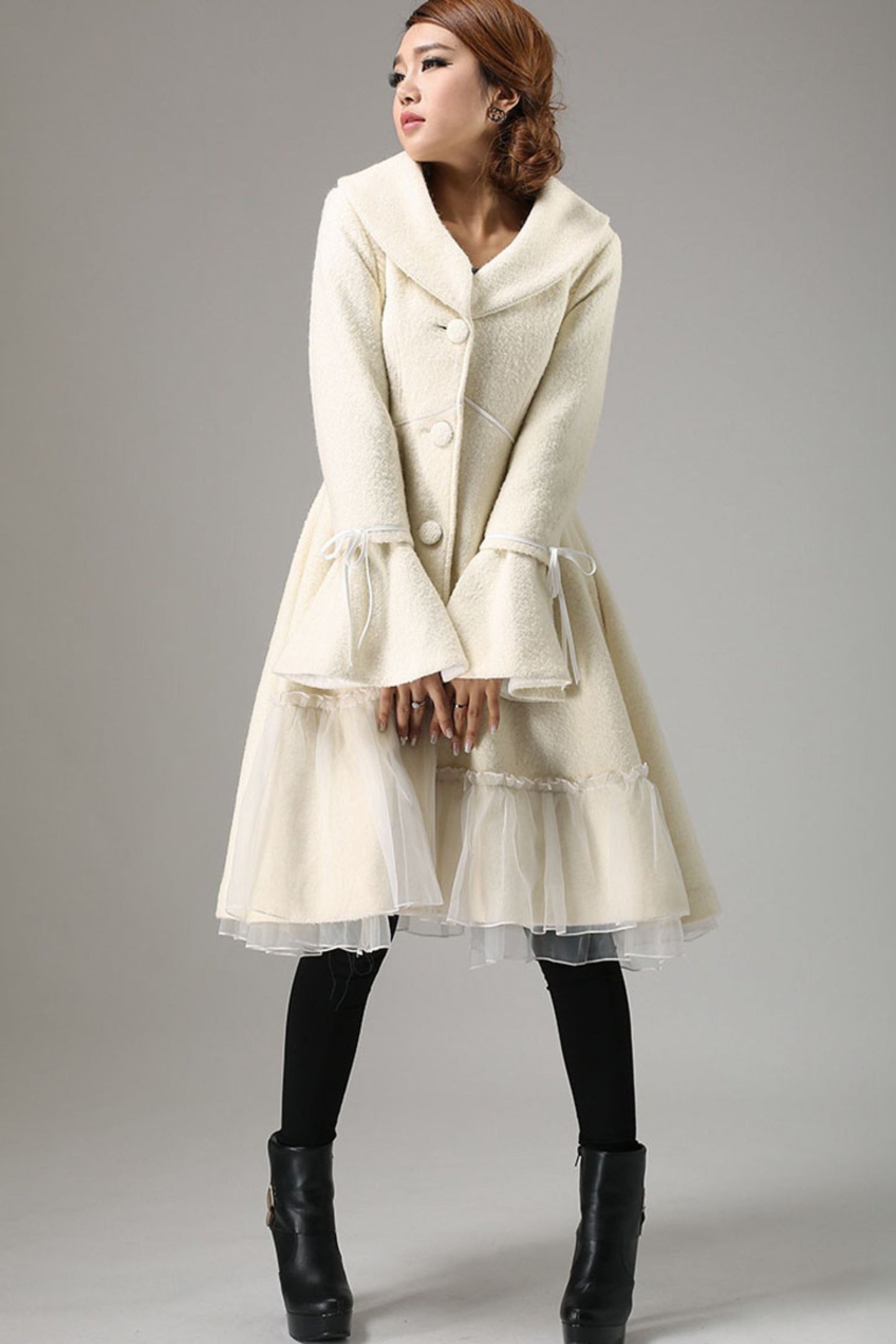 This white wool coat is made of wool blend , with white lace details on the cuffs and hem, it is a dress wool coat designed for women. You can wear this warm coat as a party coat in winter. the fashion coat has a lapel collar, two side pockets and button closure. With the flare cuffs and a big hem , seamed waist with contrast Trim, make the coat more lovely and romantic.