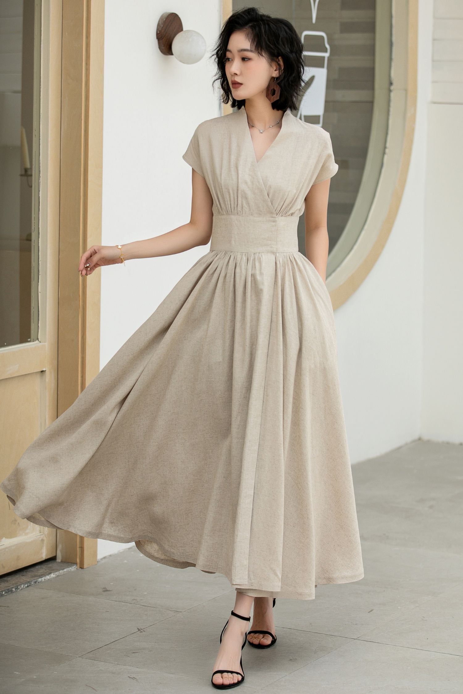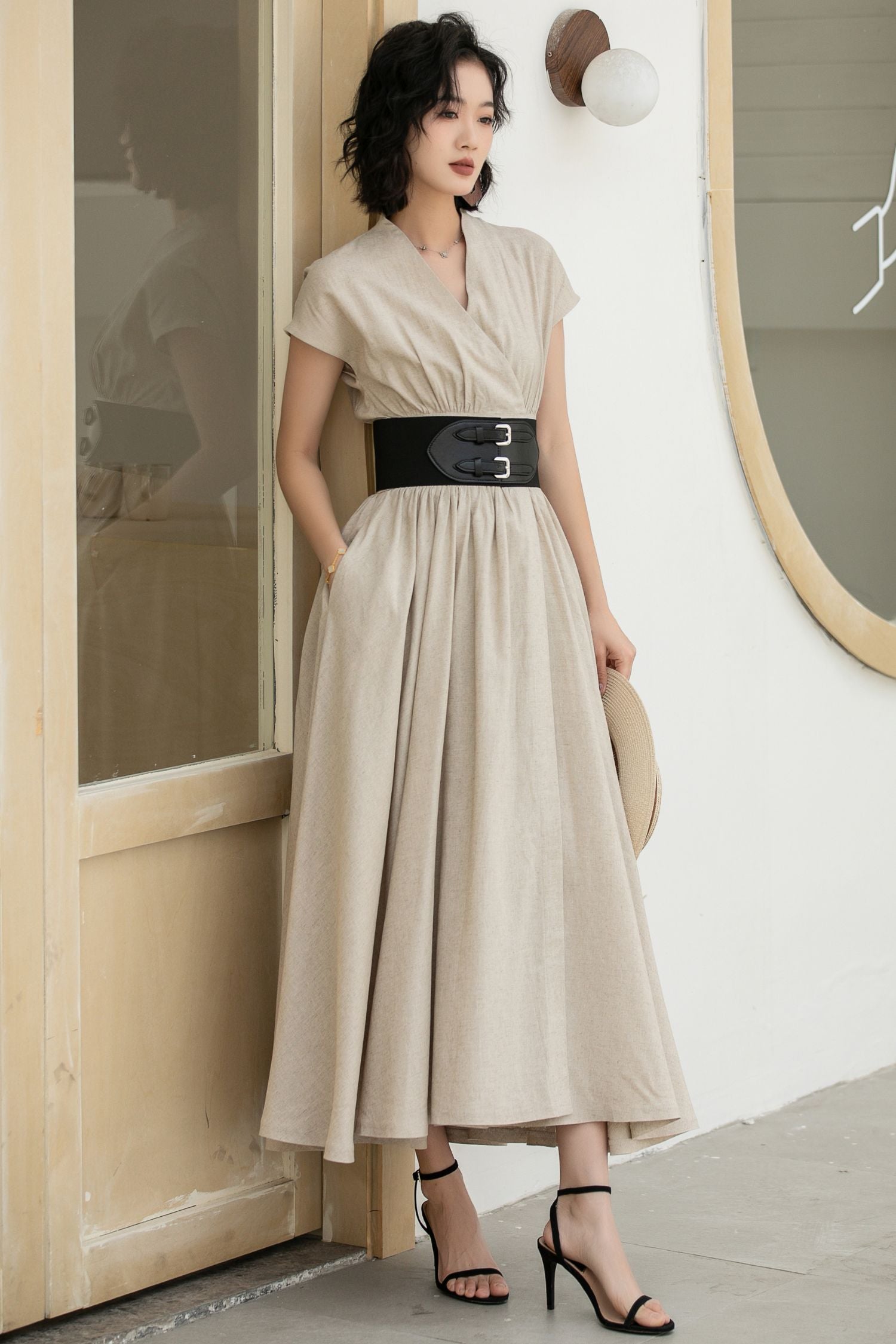 Stay effortlessly chic in this beige linen wrap dress, crafted from 100% breathable linen for natural comfort. Designed with a V-neckline, pleated waist, and A-line silhouette, it offers a flattering fit while the contrasting black belt defines the waist for added elegance. Functional side seam pockets bring practicality, making it perfect for both casual summer days and refined occasions. With its flowy swing hem, this dress captures the essence of timeless sophistication.