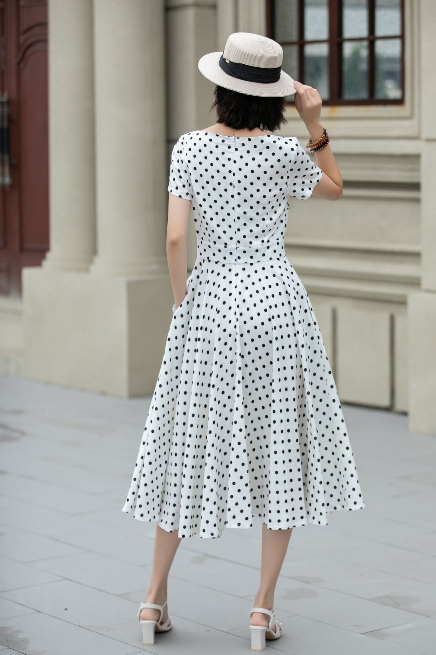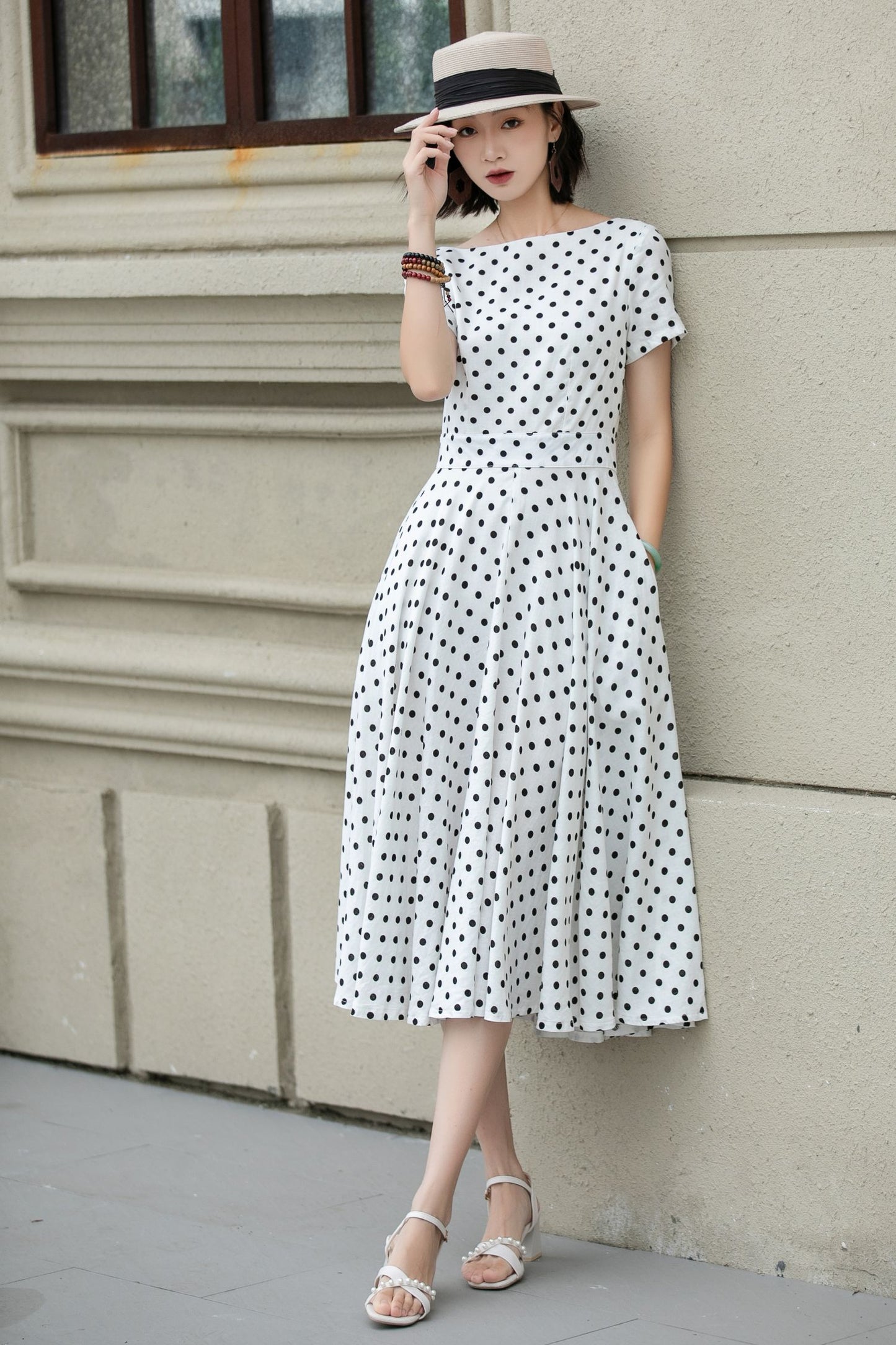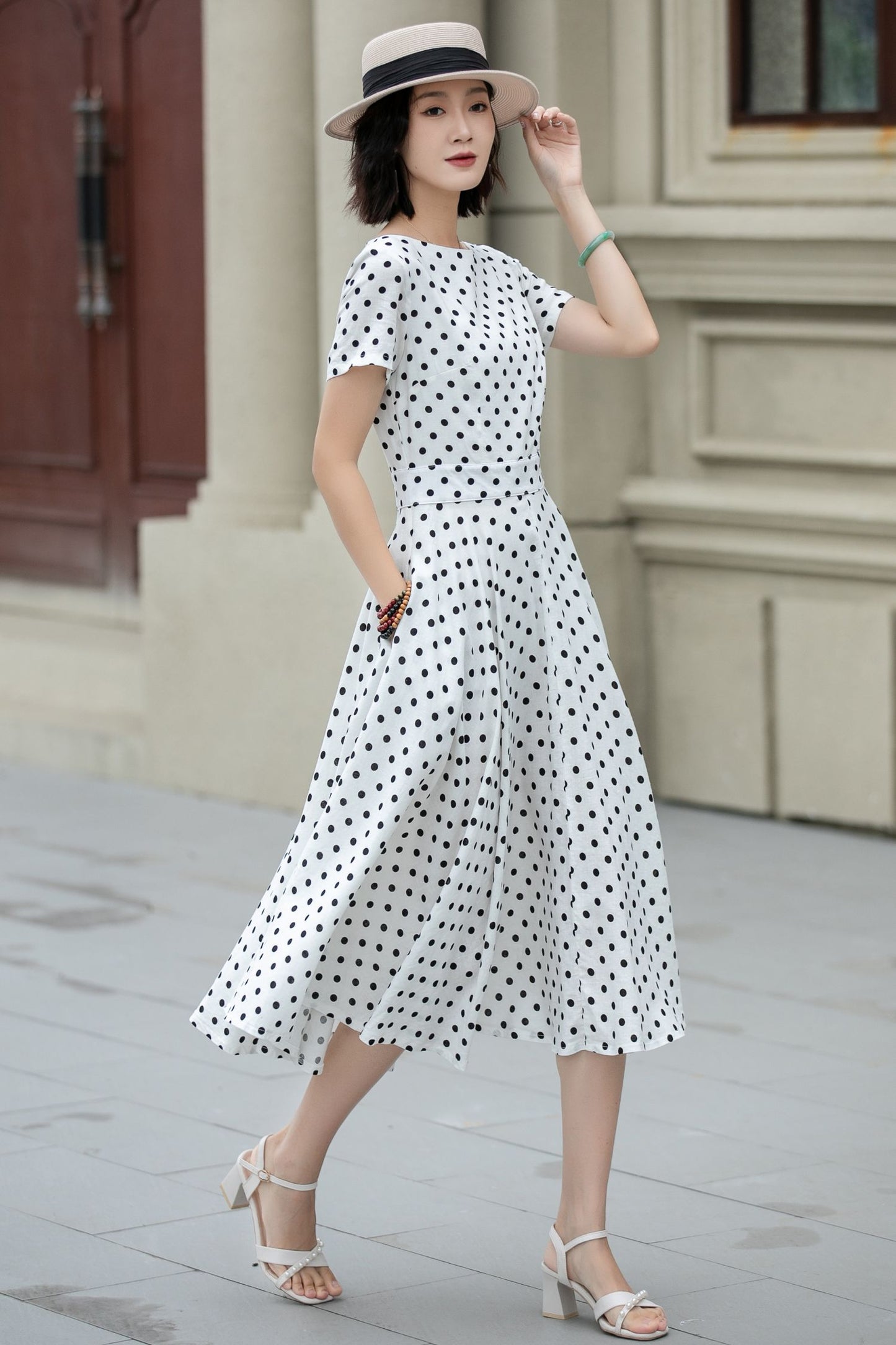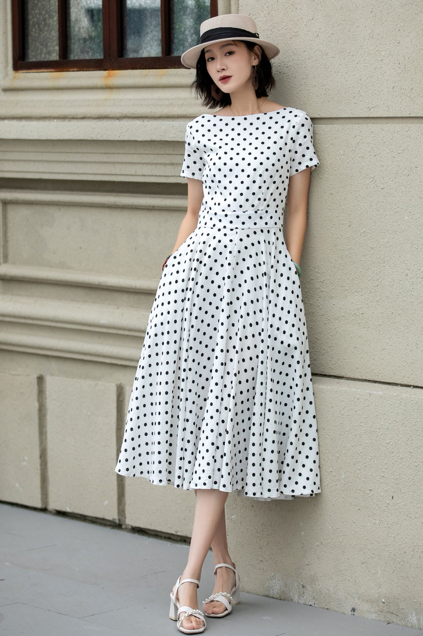 This black and white polka dot summer linen dress is perfect for warm weather occasions. Made from breathable linen material, it provides all-day comfort while adding a touch of fun and elegance with its classic polka dot design. Stay stylish and cool this summer with this must-have dress.