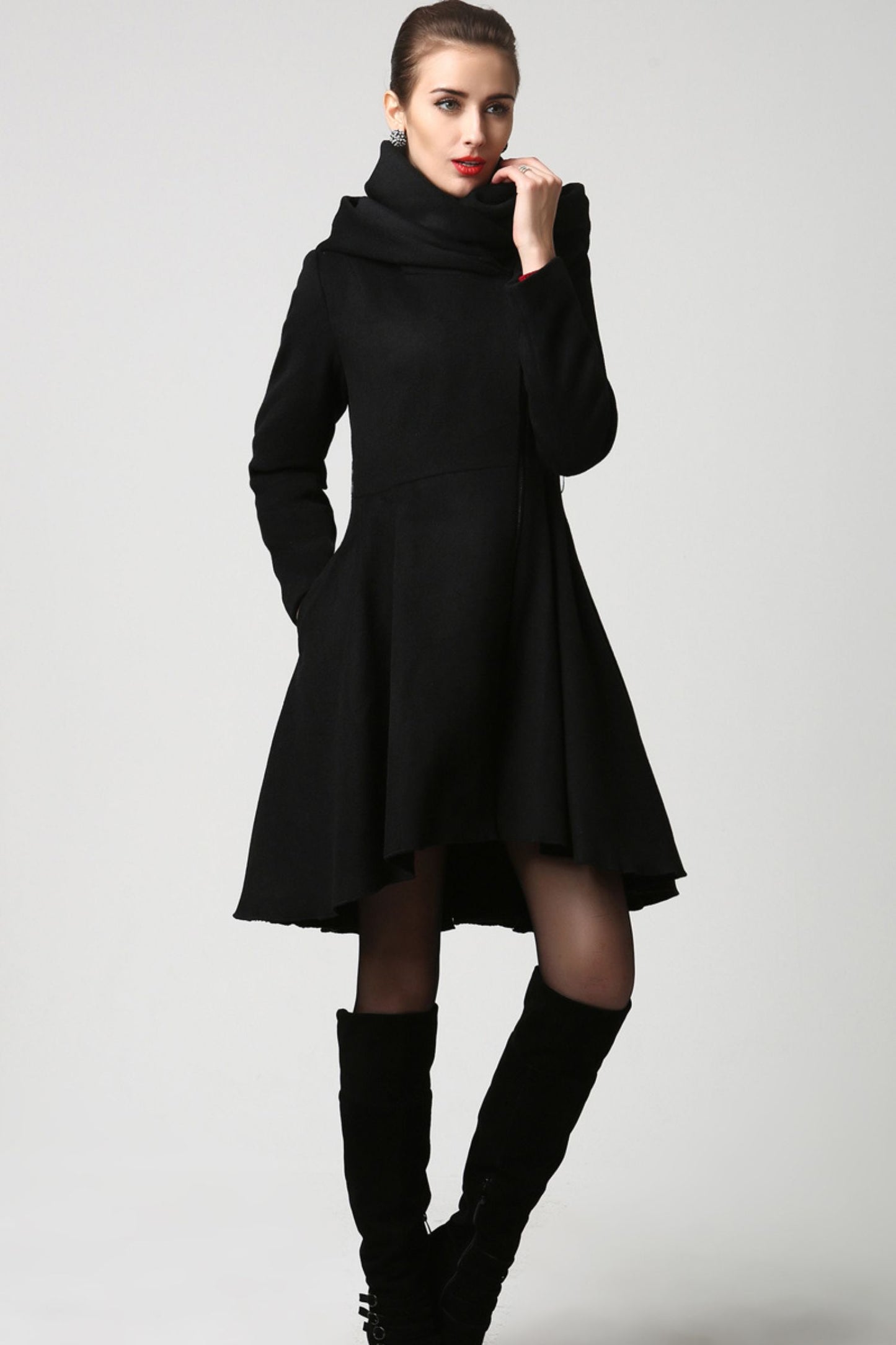Step into winter with confidence and elegance in this Black Hooded Wool Coat. Crafted from a premium wool blend, this coat combines warmth, durability, and a chic asymmetrical silhouette. The unique hood doubles as a scarf when fully zipped, making it both stylish and functional. Whether strolling through snowy streets or attending evening gatherings, this coat ensures timeless sophistication and cozy comfort.