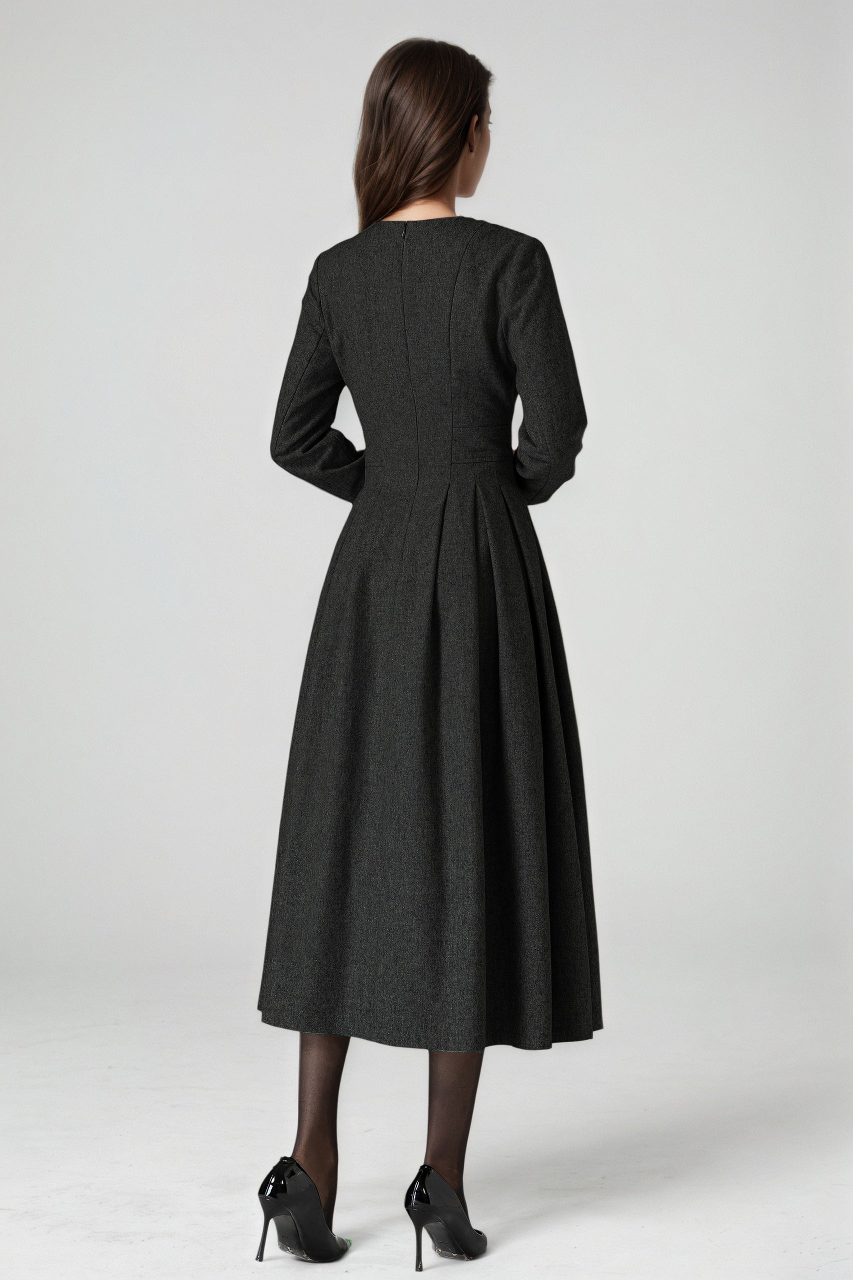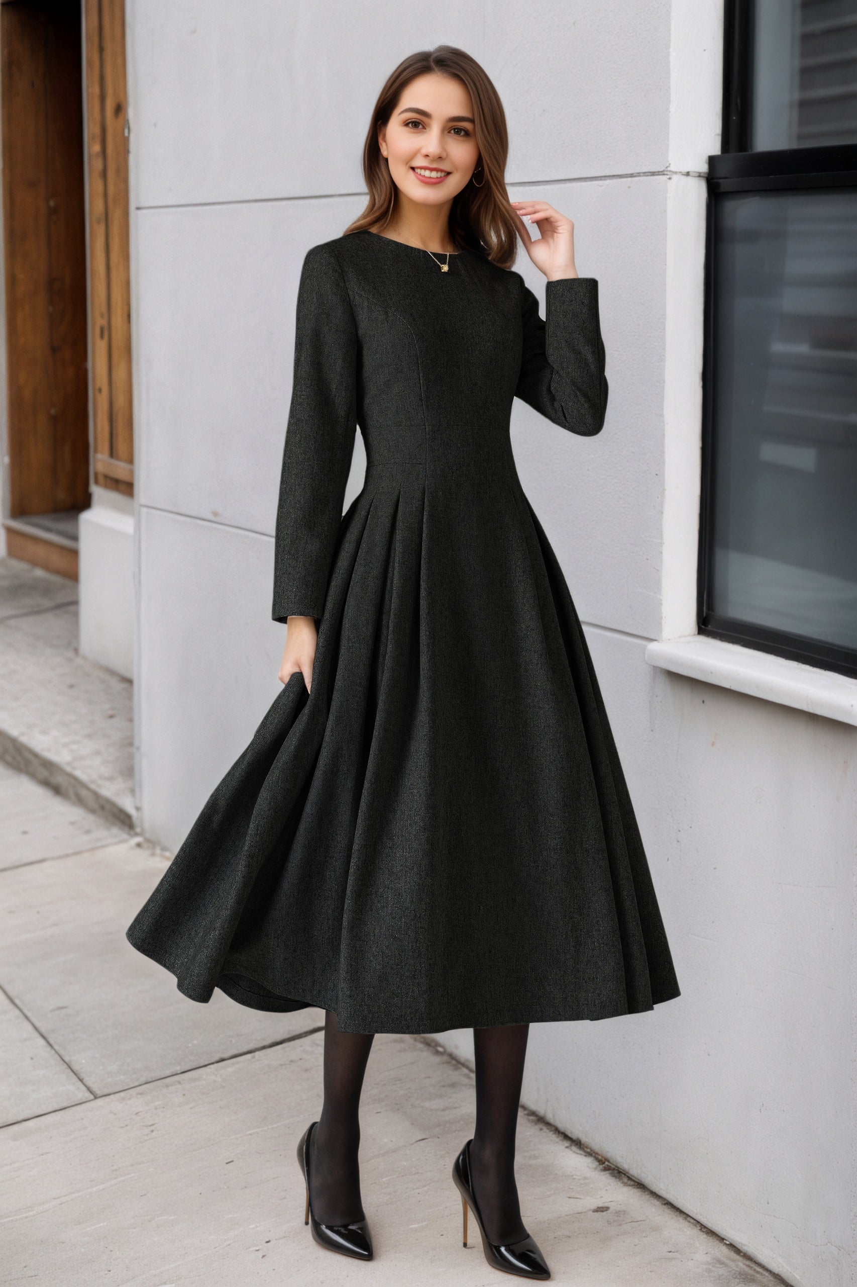 Capture the allure of timeless sophistication with this handmade black wool blend midi dress. Its classic fit-and-flare design highlights the waist and flows gracefully with pleated detail, creating a silhouette that feels both powerful and feminine. Crafted in a warm wool blend with smooth lining, this dress is perfect for elegant evenings, winter gatherings, or as a refined everyday statement. A true wardrobe essential for women who appreciate vintage-inspired artistry.