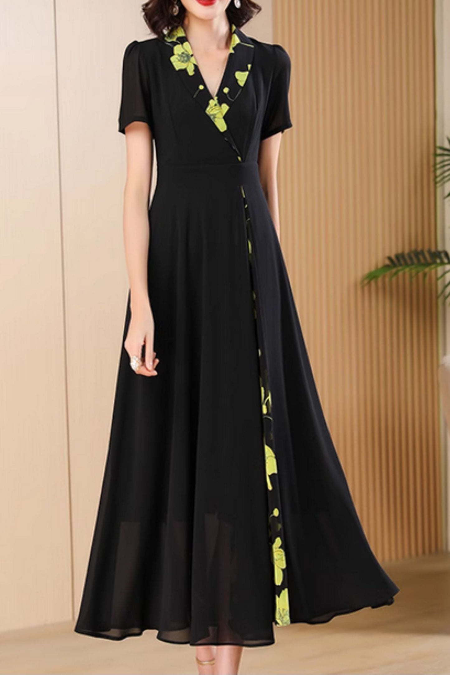 Elevate your style with our block color chiffon dress! Perfect for the summer, this dress features a flattering lapel collar and bold, contrasting colors. Make a statement while staying cool and comfortable. Dare to stand out and turn heads in this adventurous dress!