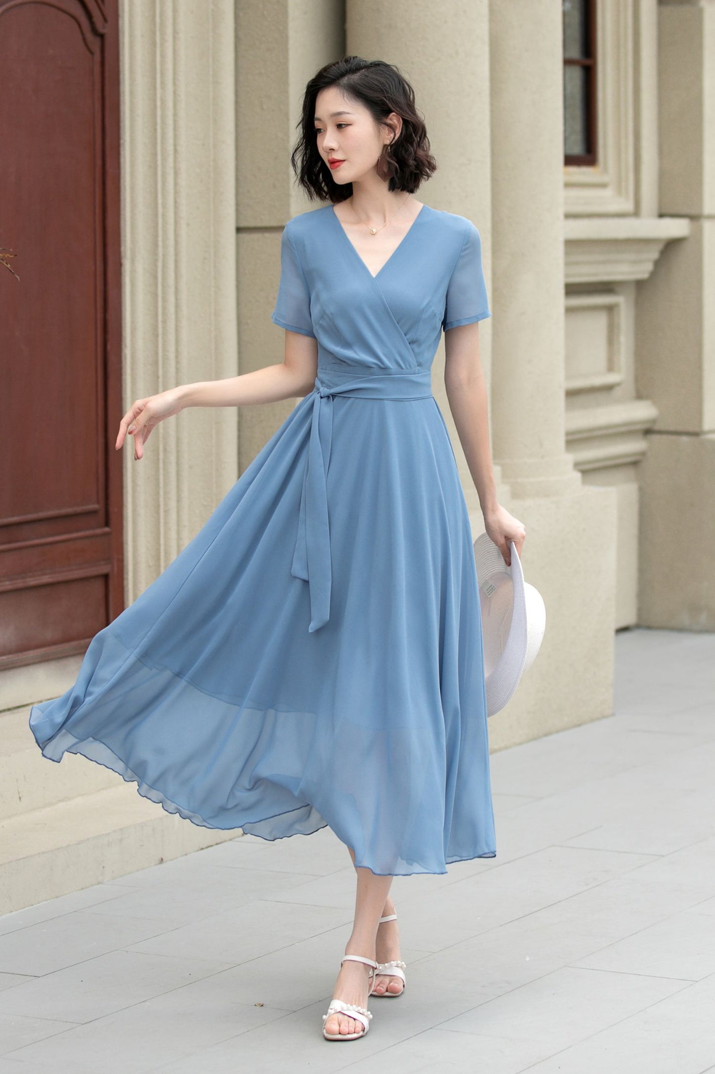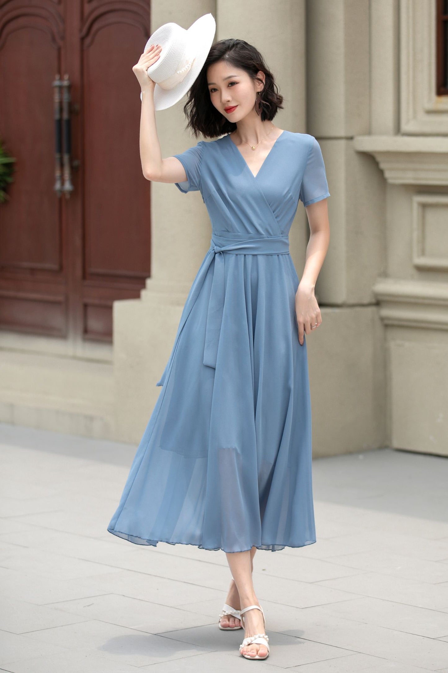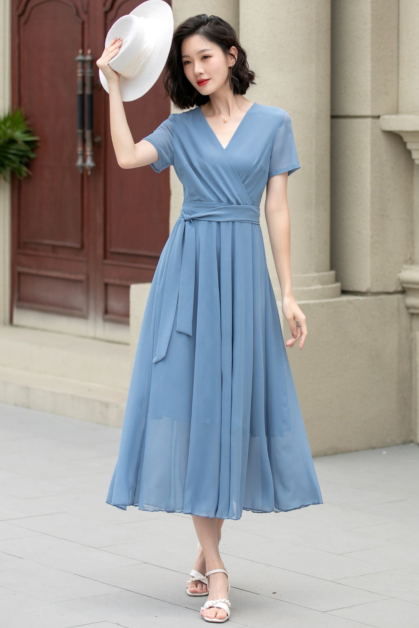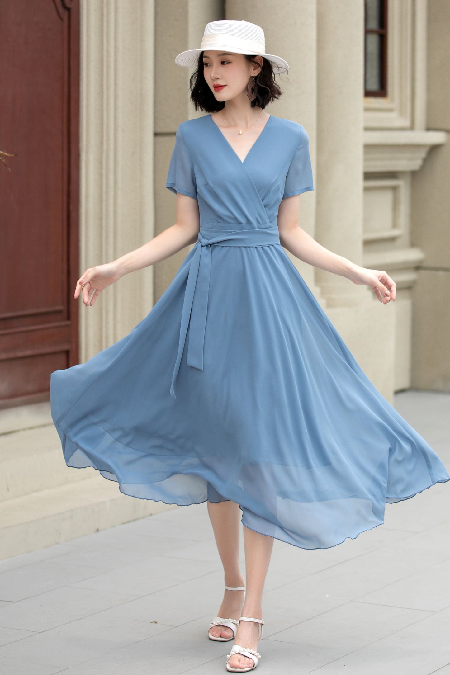 Light Blue Chiffon Dress – Fit & Flare Summer Swing Midi | Xiaolizi 5206