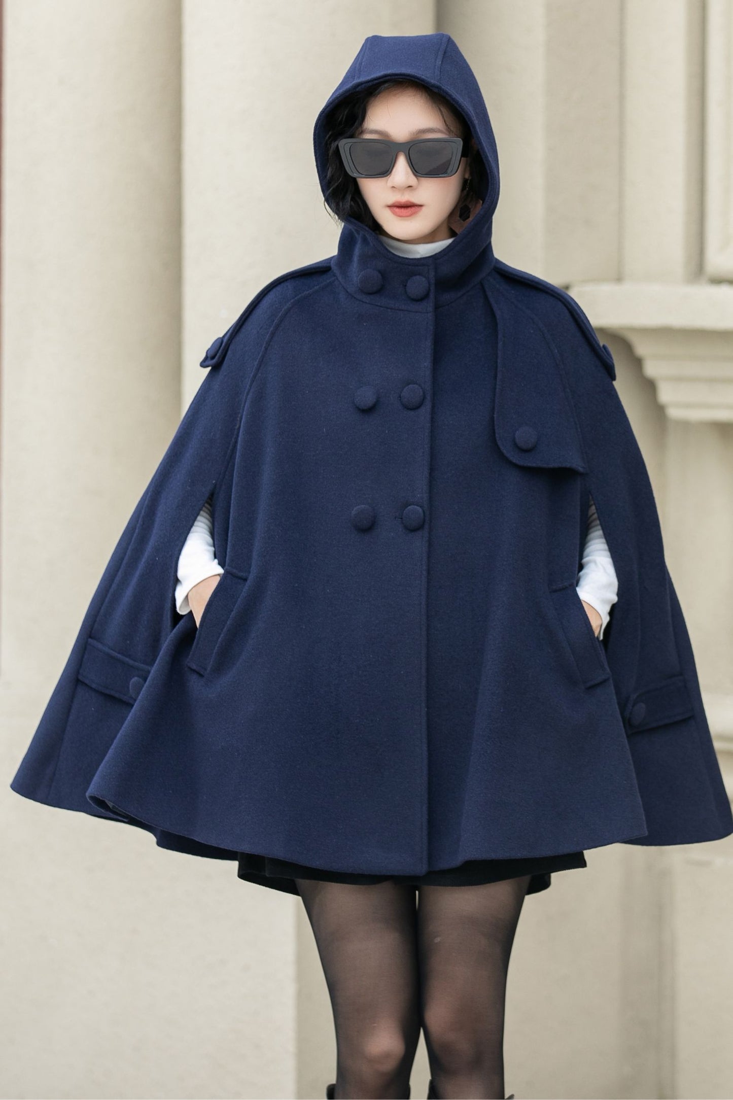 Vintage Blue Wool Cape – Hooded Double-Breasted Winter Coat | Xiaolizi 5353