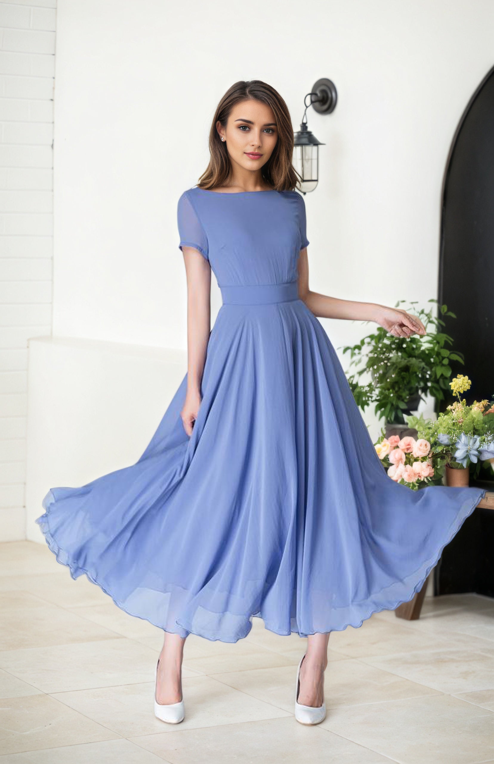 *The model is 168 cm (5ā²6ā³) tall with a 80 cm (31.5") bust, 66 cm (26") waist. She is wearing the blue dress in size XS.