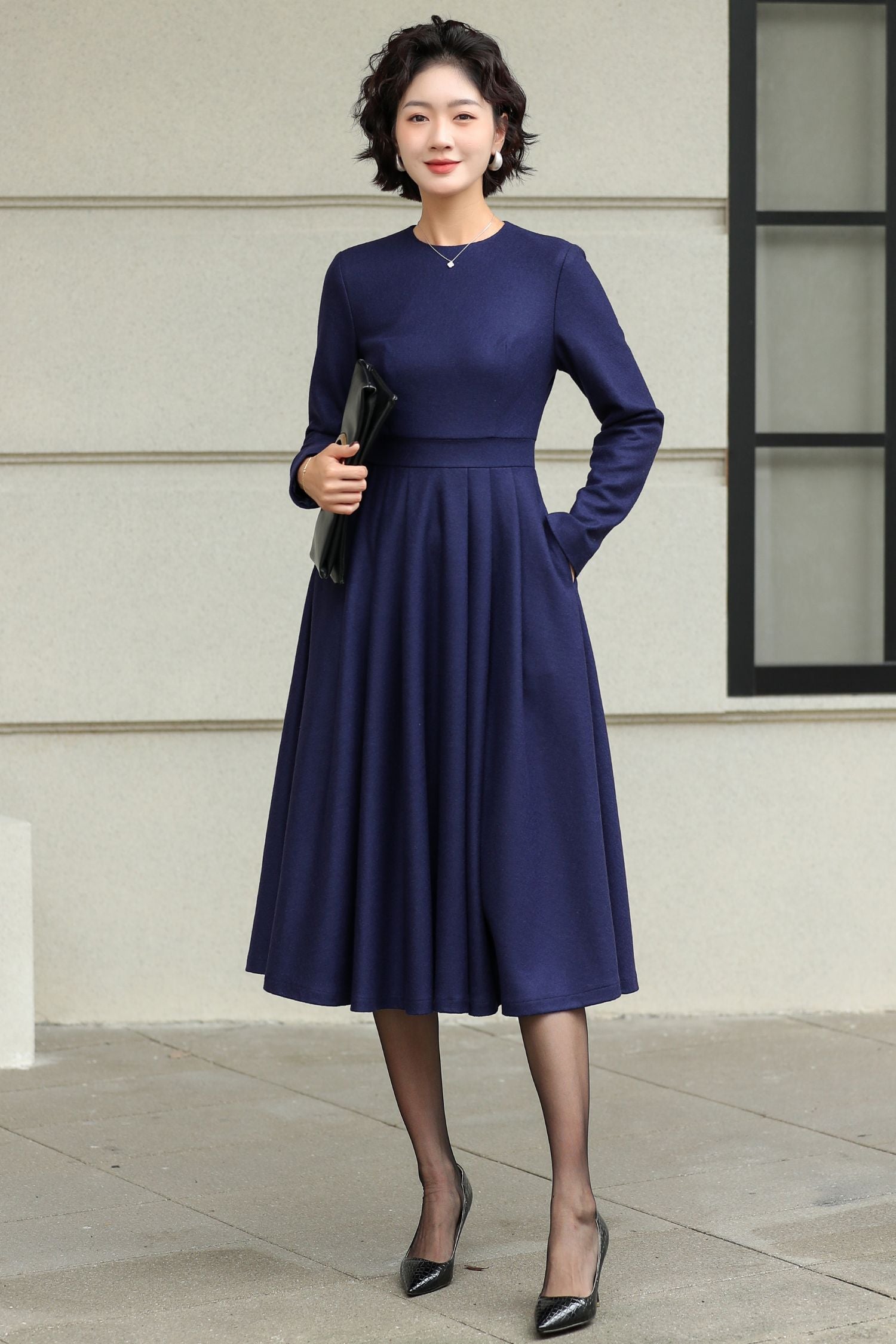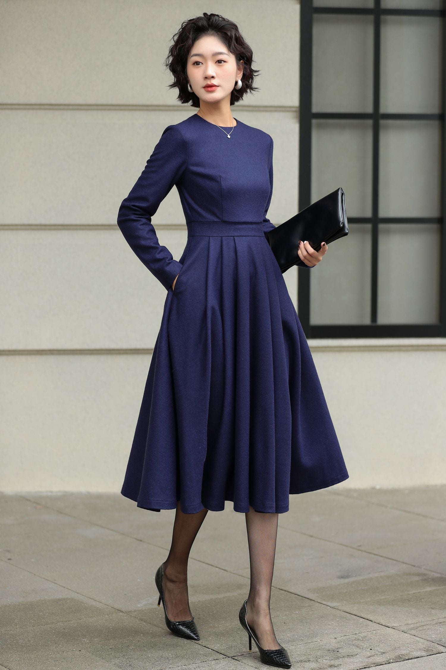 This blue swing winter dress is crafted from warm wool, designed to provide comfort and insulation during colder months. Its fluid swing silhouette allows for easy movement while maintaining a flattering fit. Ideal for layering or wearing alone, this dress combines style and practicality for winter wardrobes.