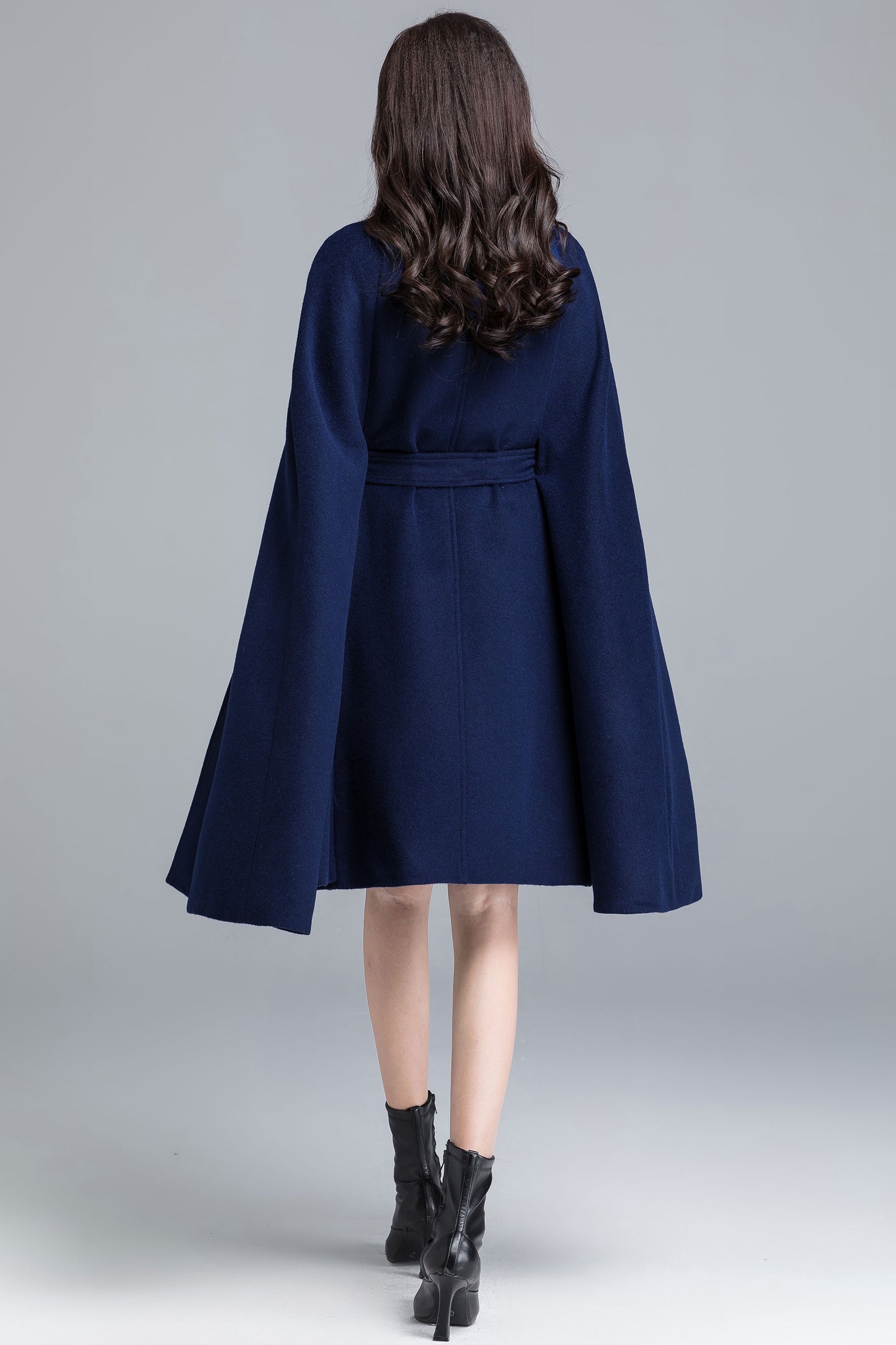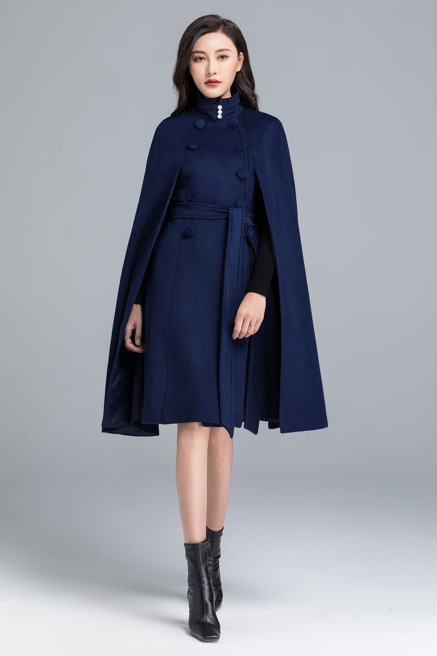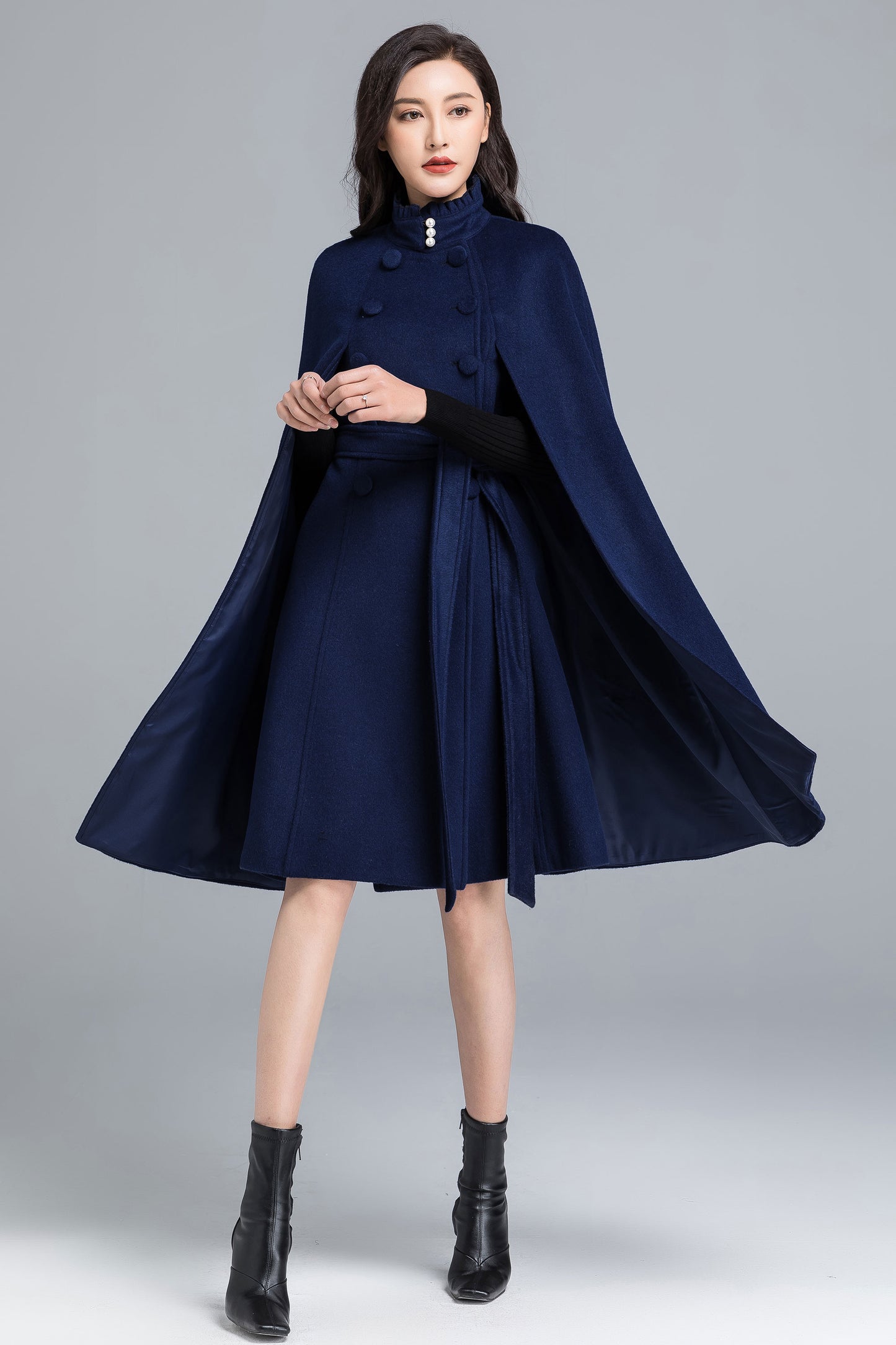 Blue Wool Cape Coat – Women’s Elegant Stand Collar Winter Cloak 2487