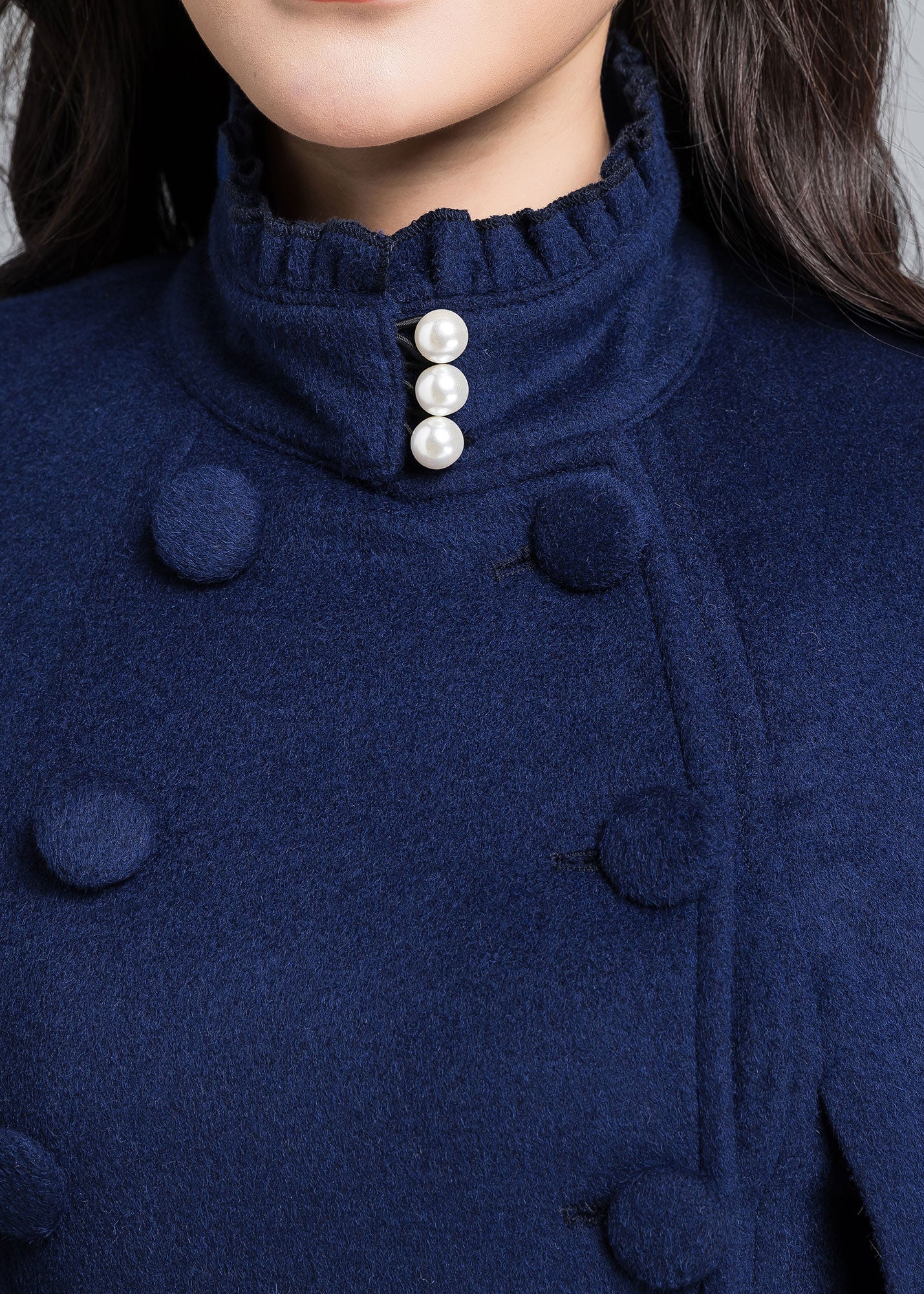 Timeless and sophisticated, this blue wool cape coat is crafted in a flowing silhouette with a stand-up collar and subtle ruffle detail. The elegant double-breasted design and waist tie create a flattering shape, while the soft wool blend keeps you warm through autumn and winter. A versatile outerwear piece you’ll wear for years to come.