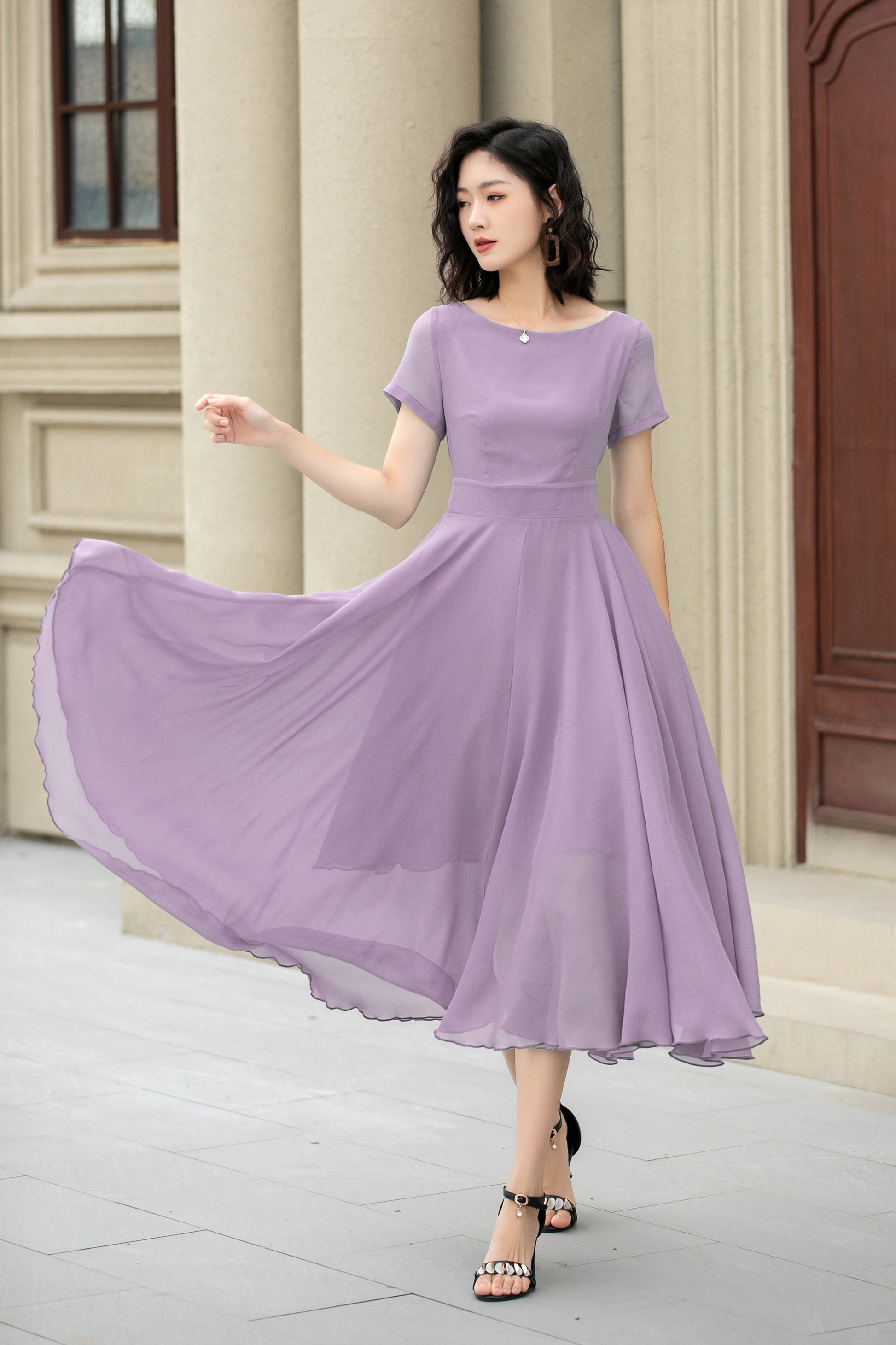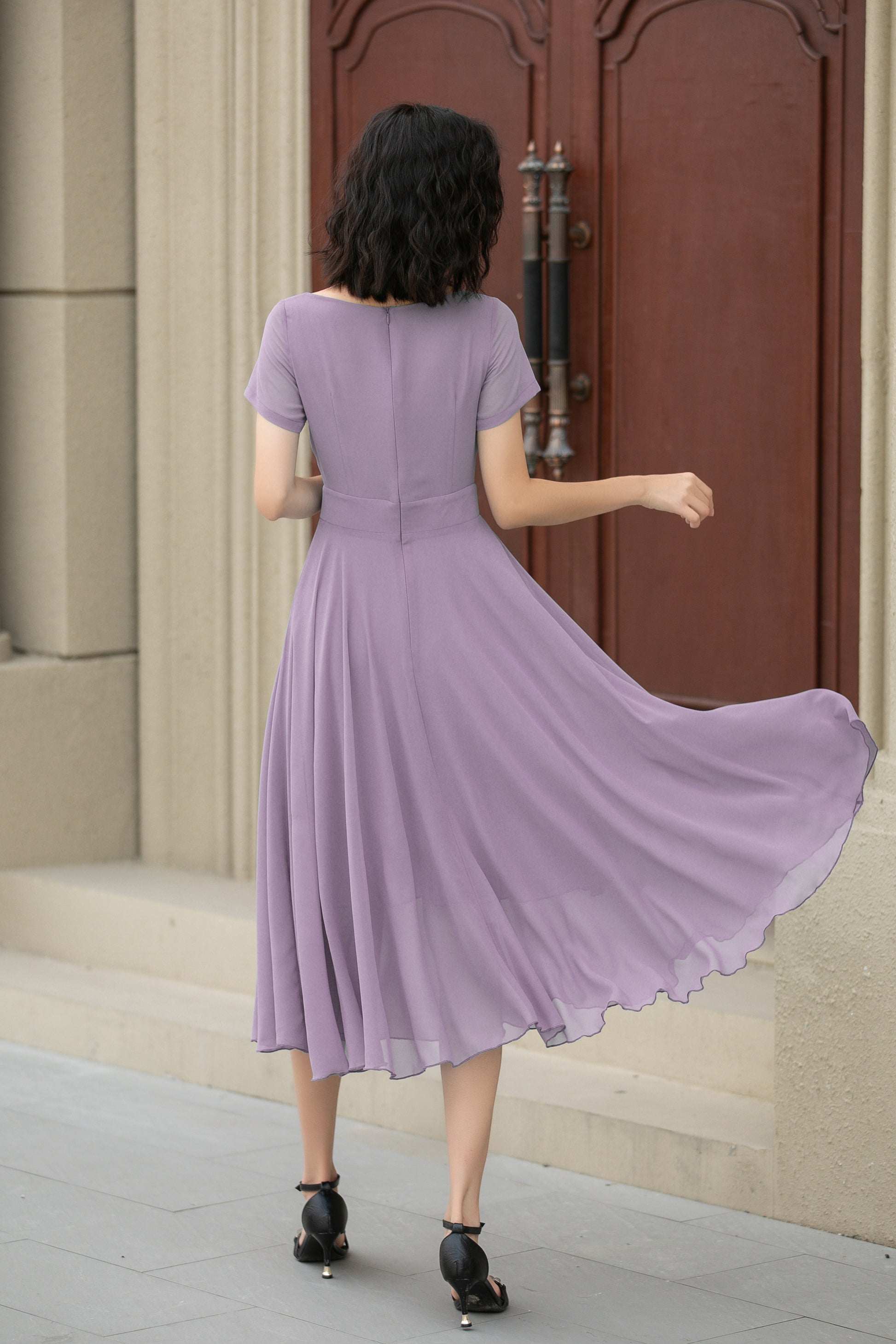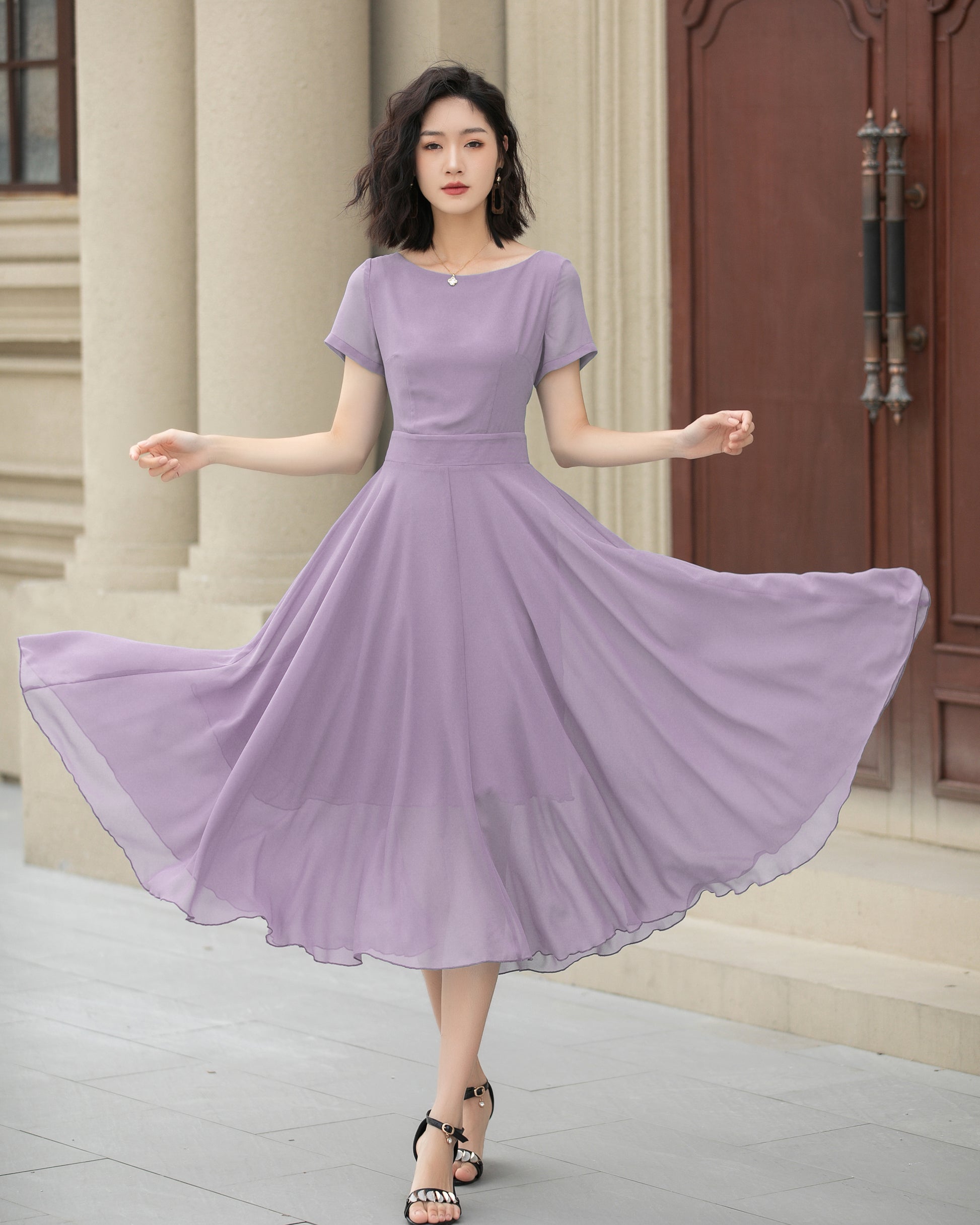 This Beautiful purple swing midi dress is crafted with soft chiffon fabric, Featuring a feminine fit and flare silhouette, perfect for a wedding party, Bridesmaid or prom.