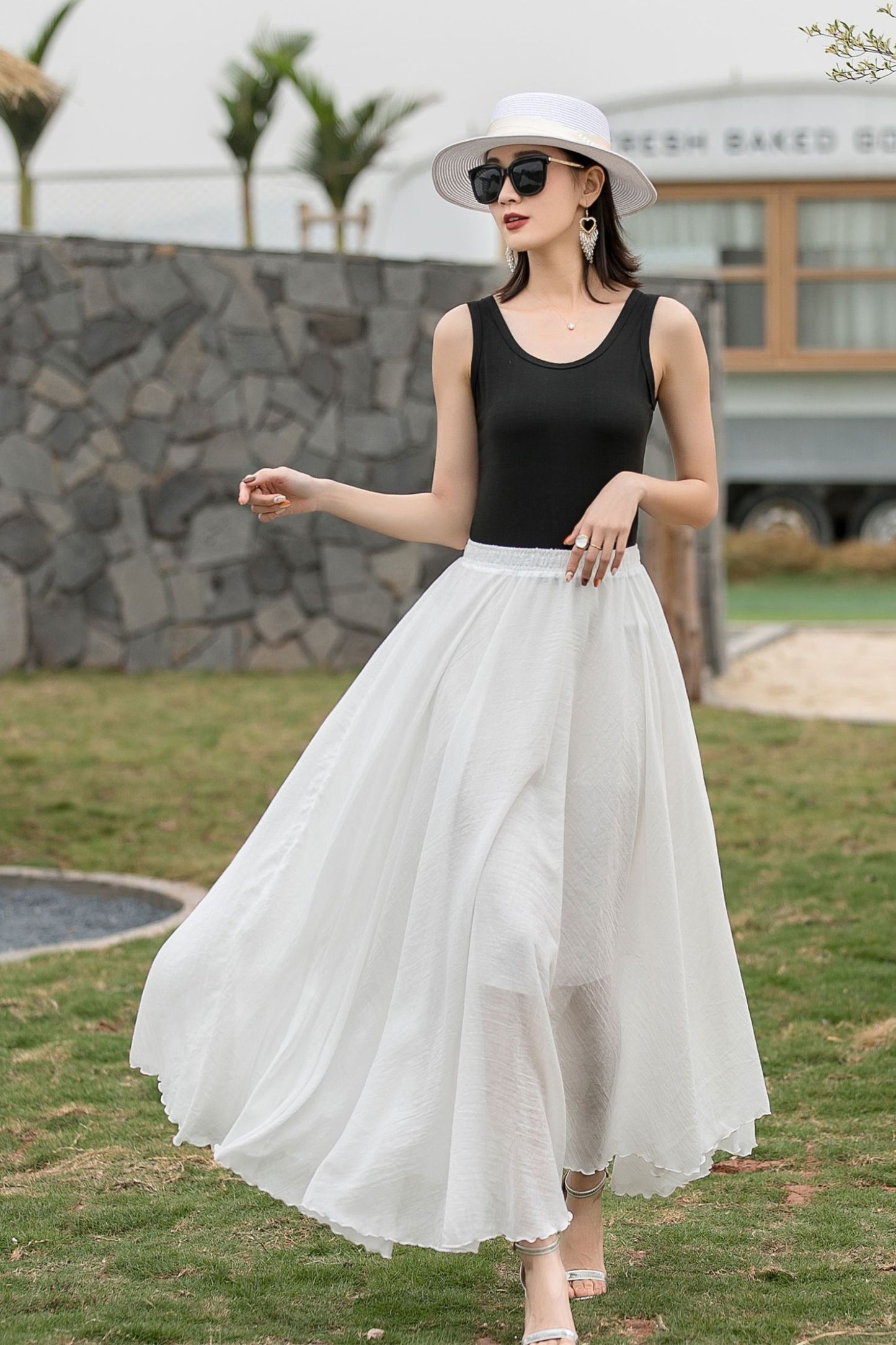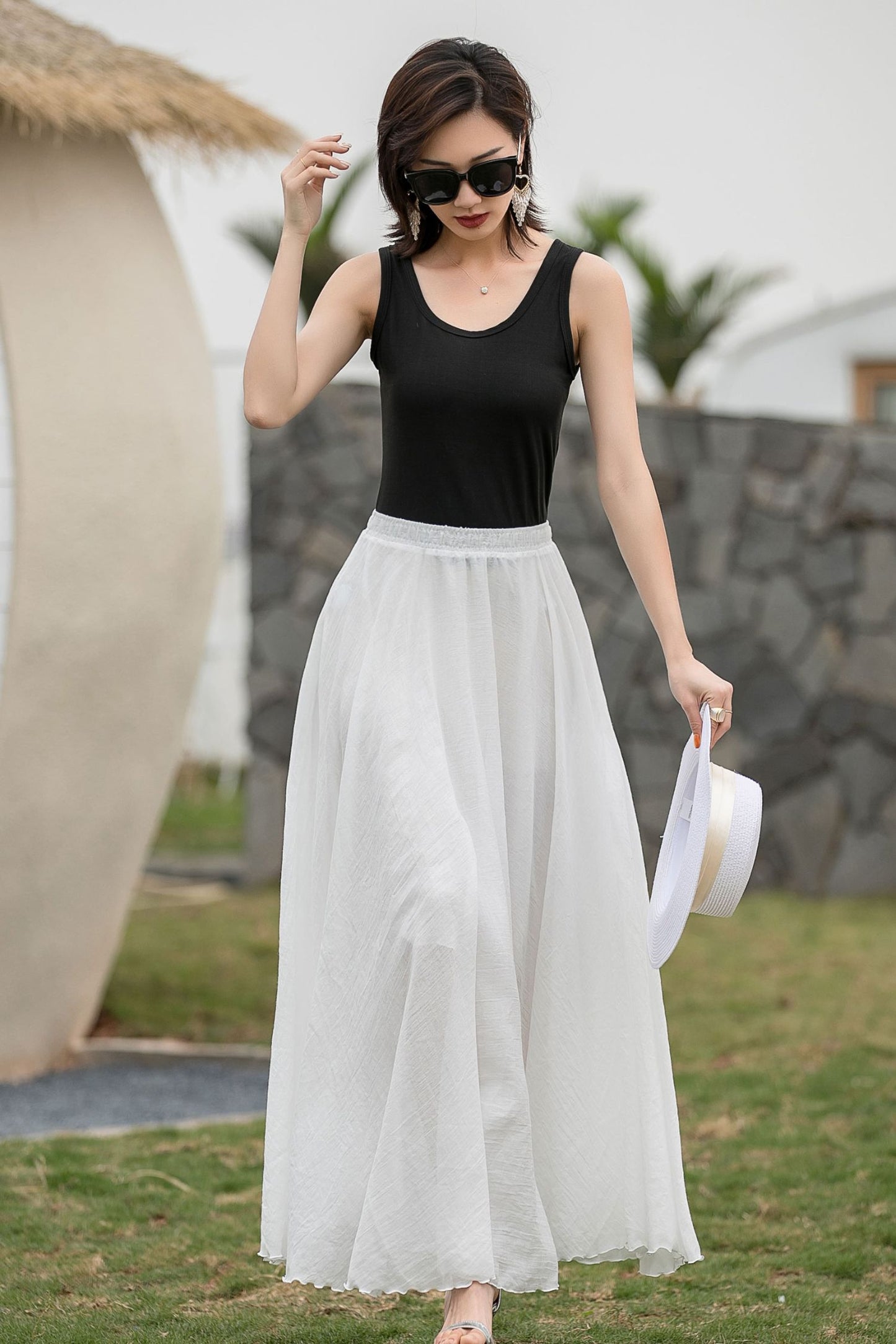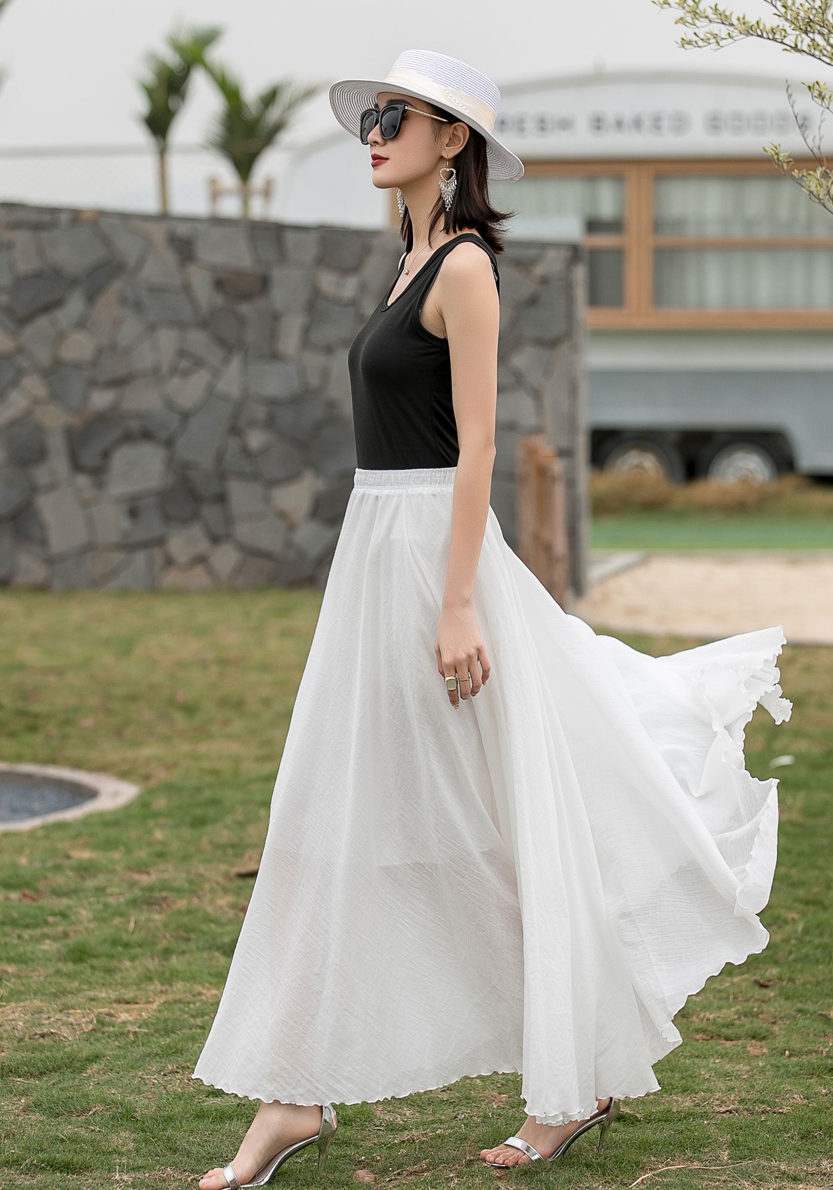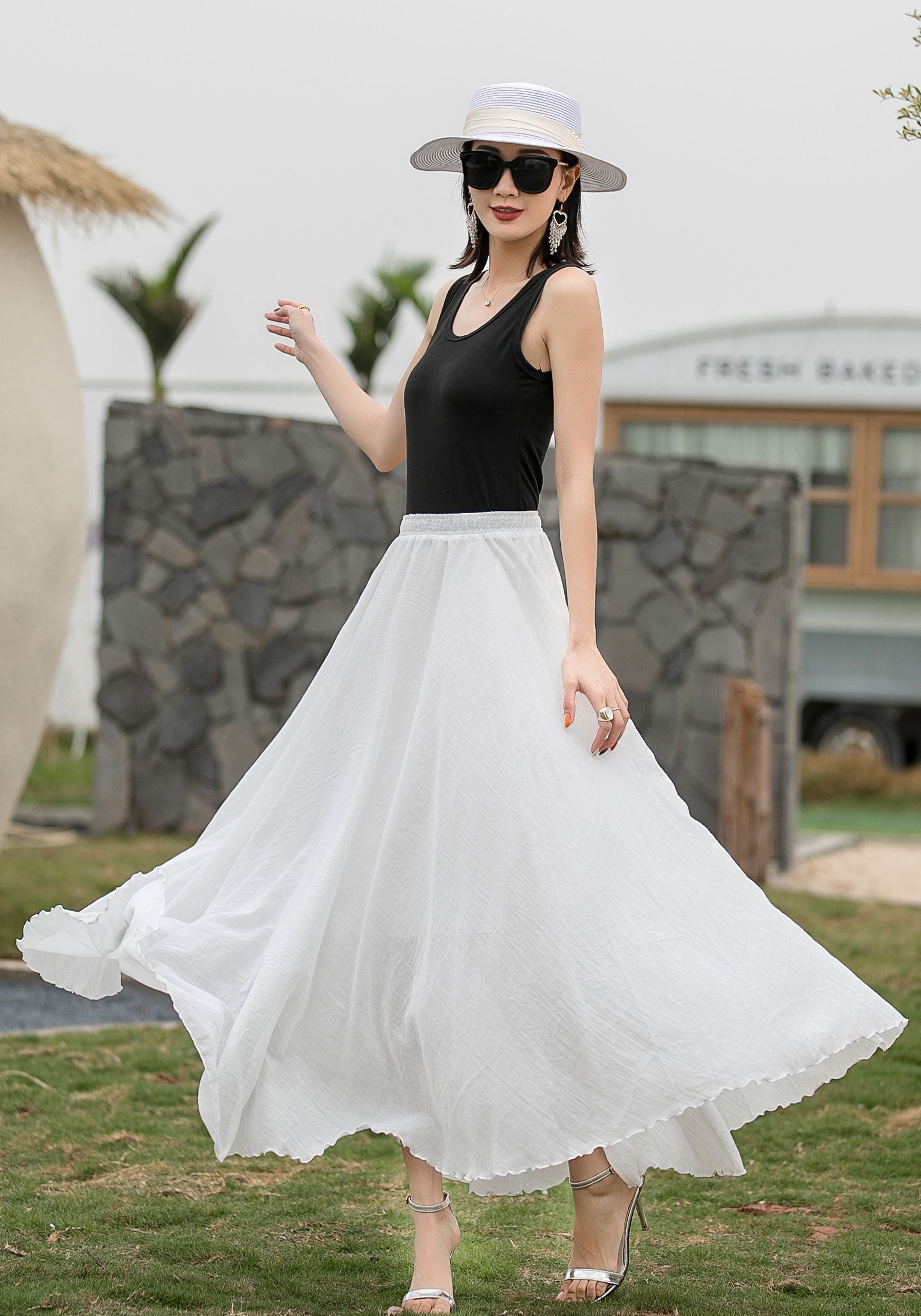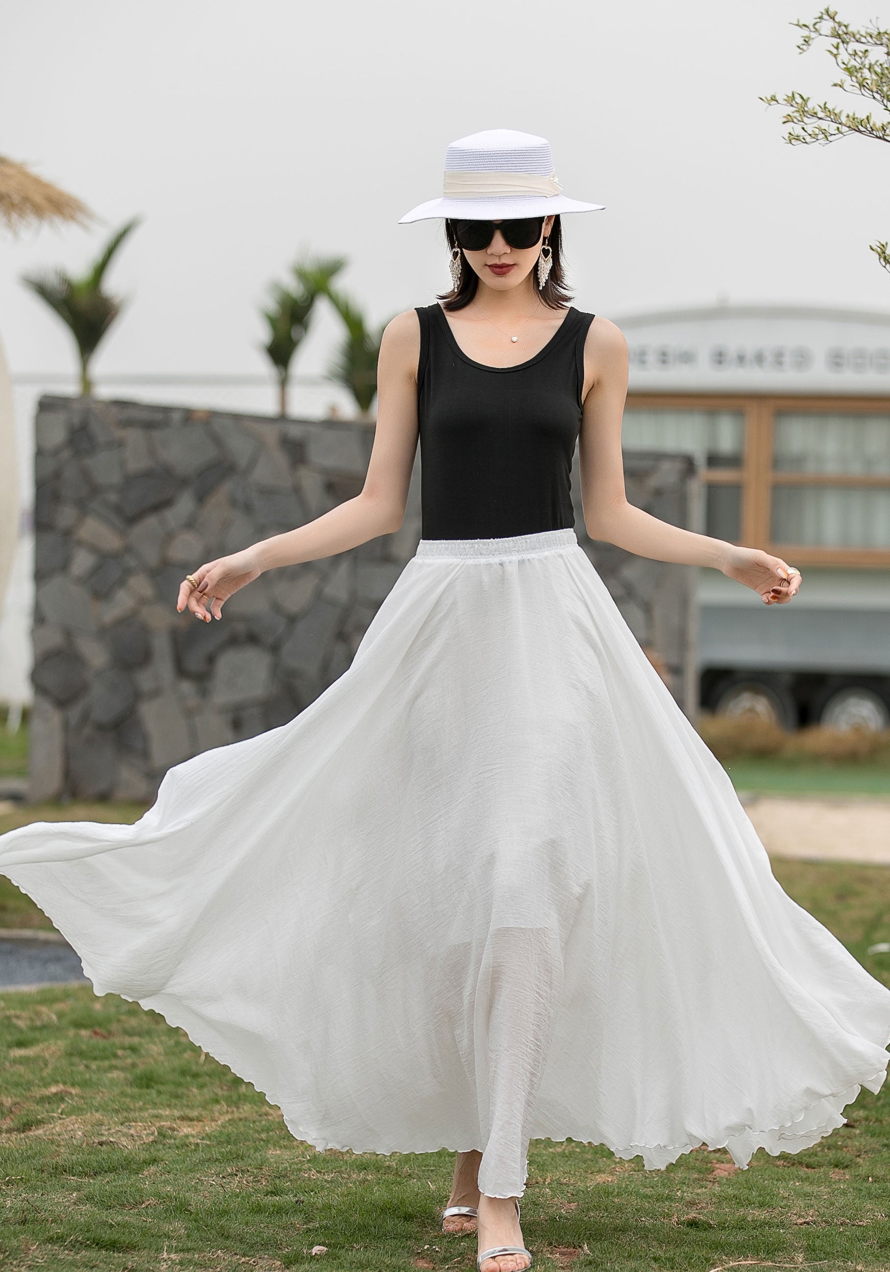 Boho Elastic Waist Pleated Maxi White Skirts 2718