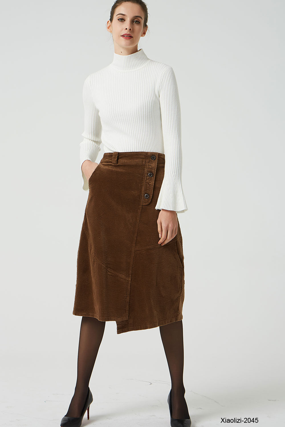 Vintage good looks in this corduroy knee length skirt from Xiaolizi. The autumn skirt made from a soft corduroy in a high-rise, a line silhouette. Topped back elastic waist. Finished with side-entry pockets at the hips + asymmetrical hemline.
