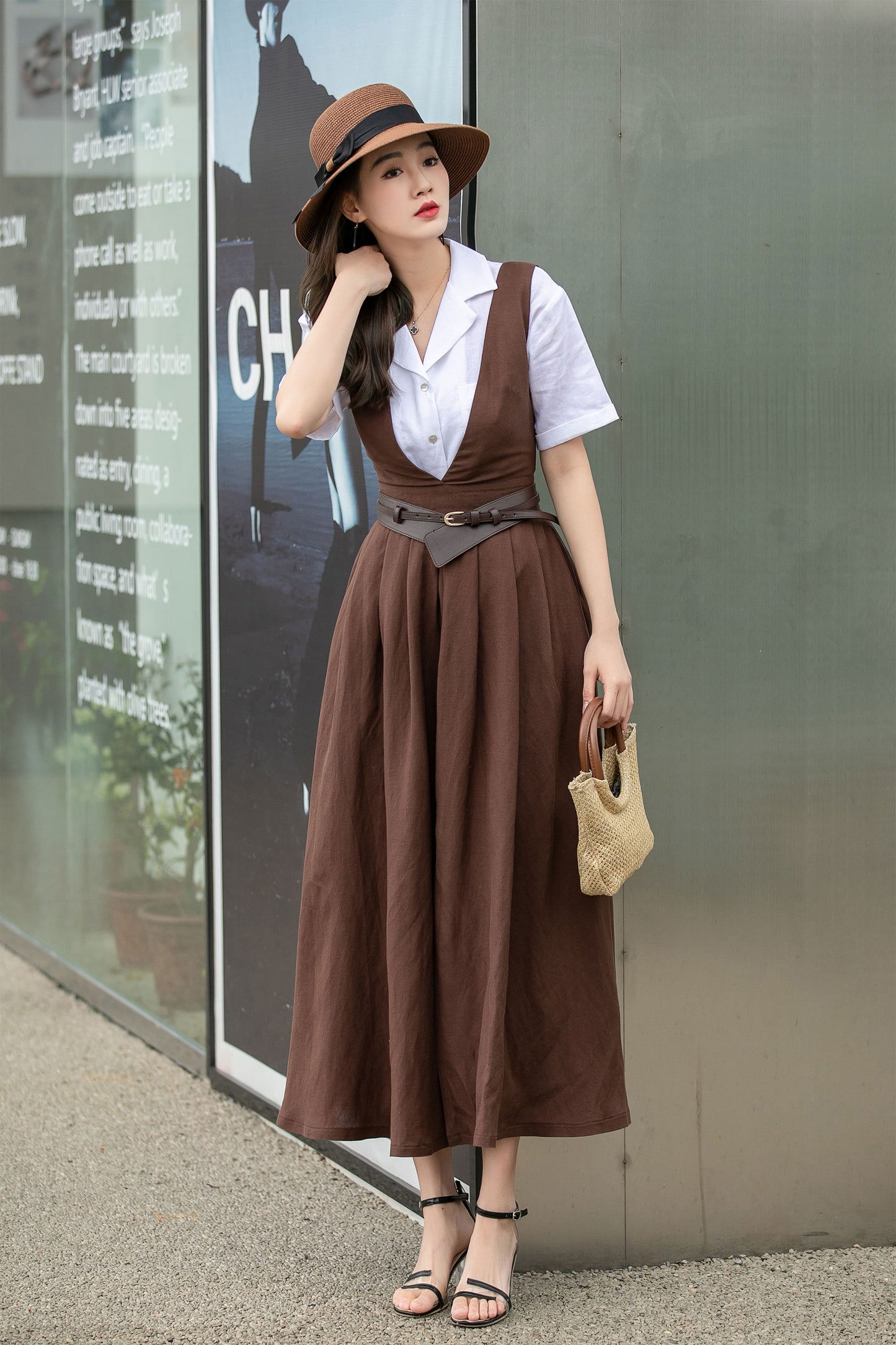 Add a touch of retro to your wardrobe with our brown sleeveless linen dress. Perfect for any occasion, the simple yet elegant design features a flared skirt and a flattering waistline.