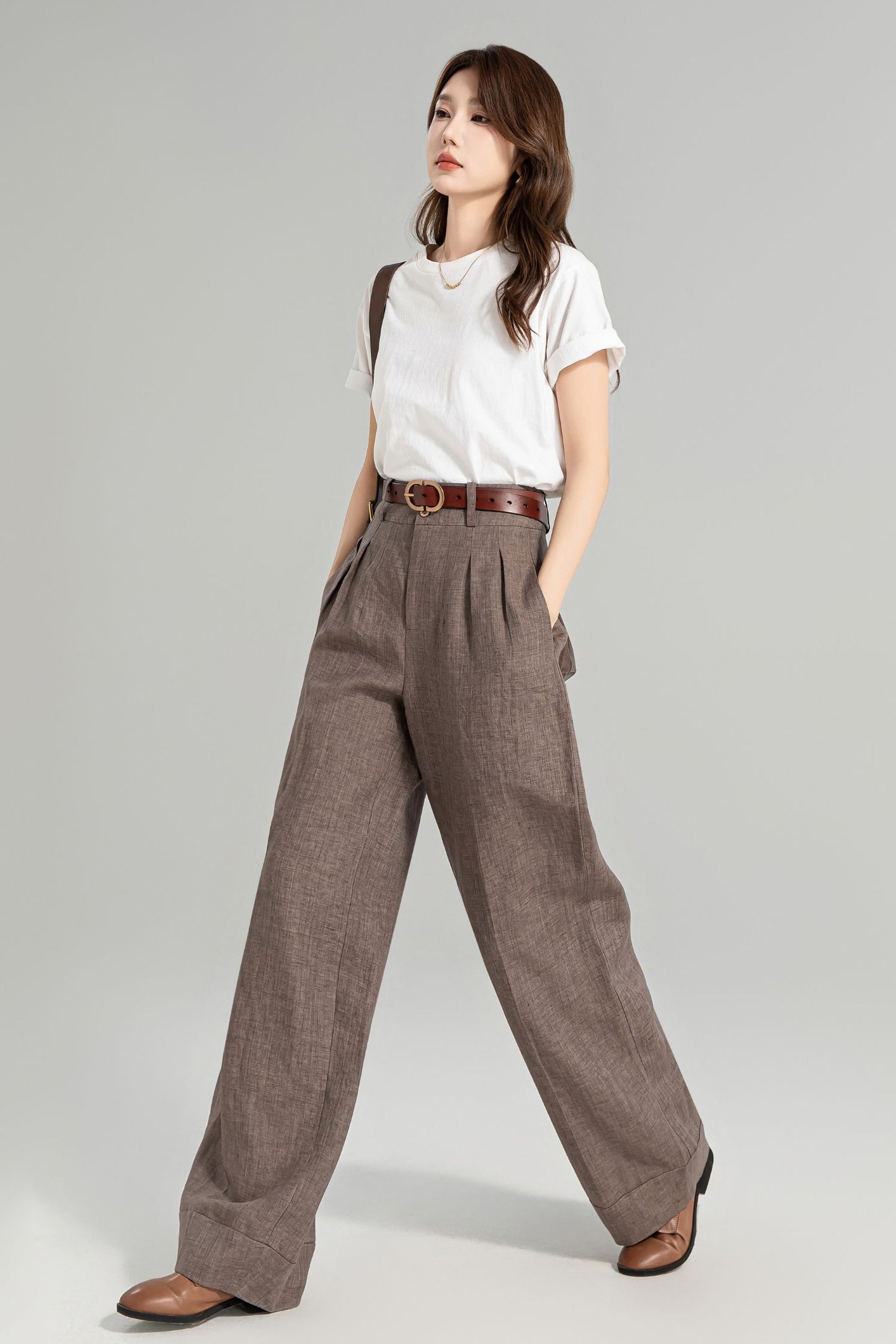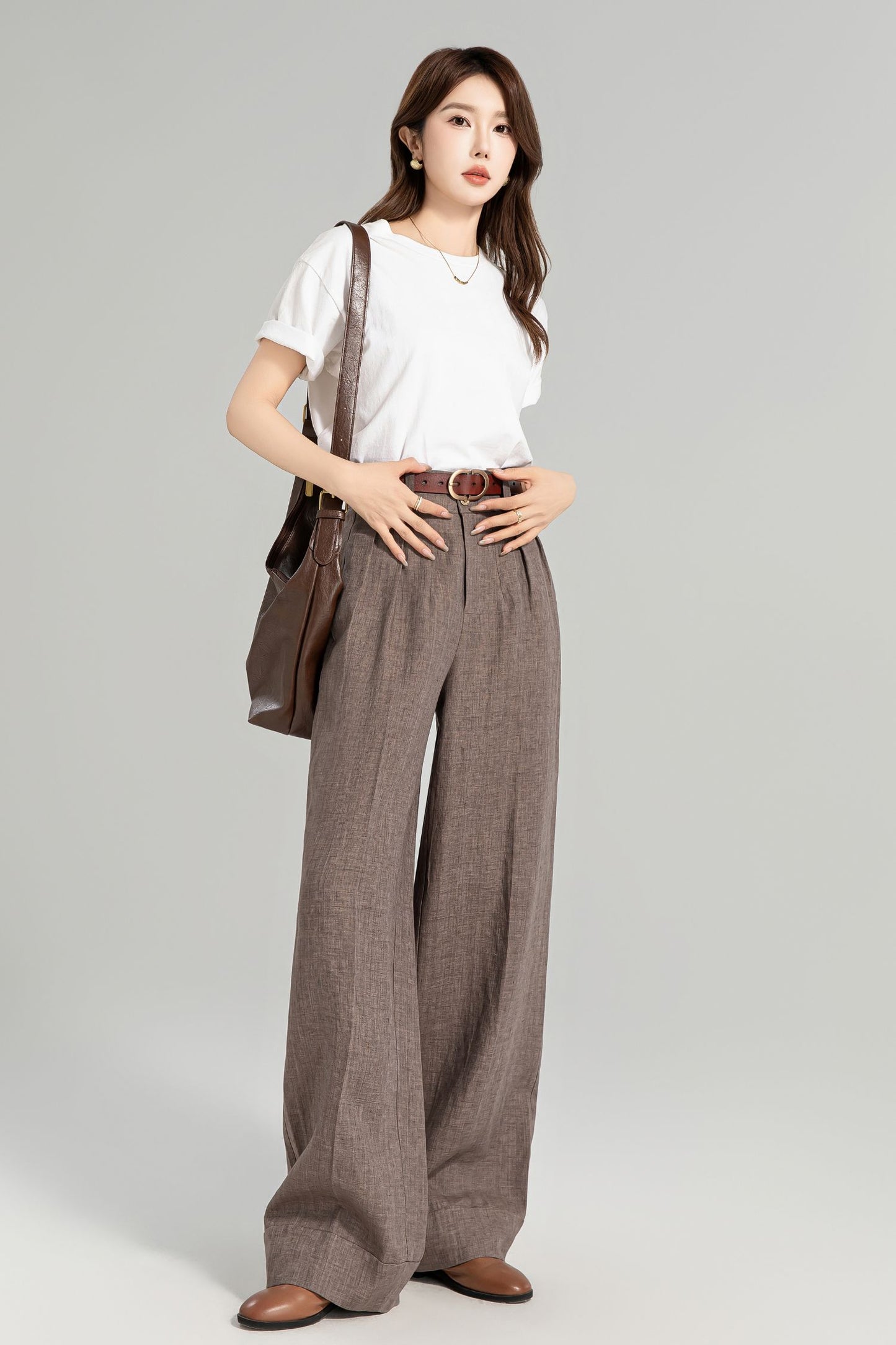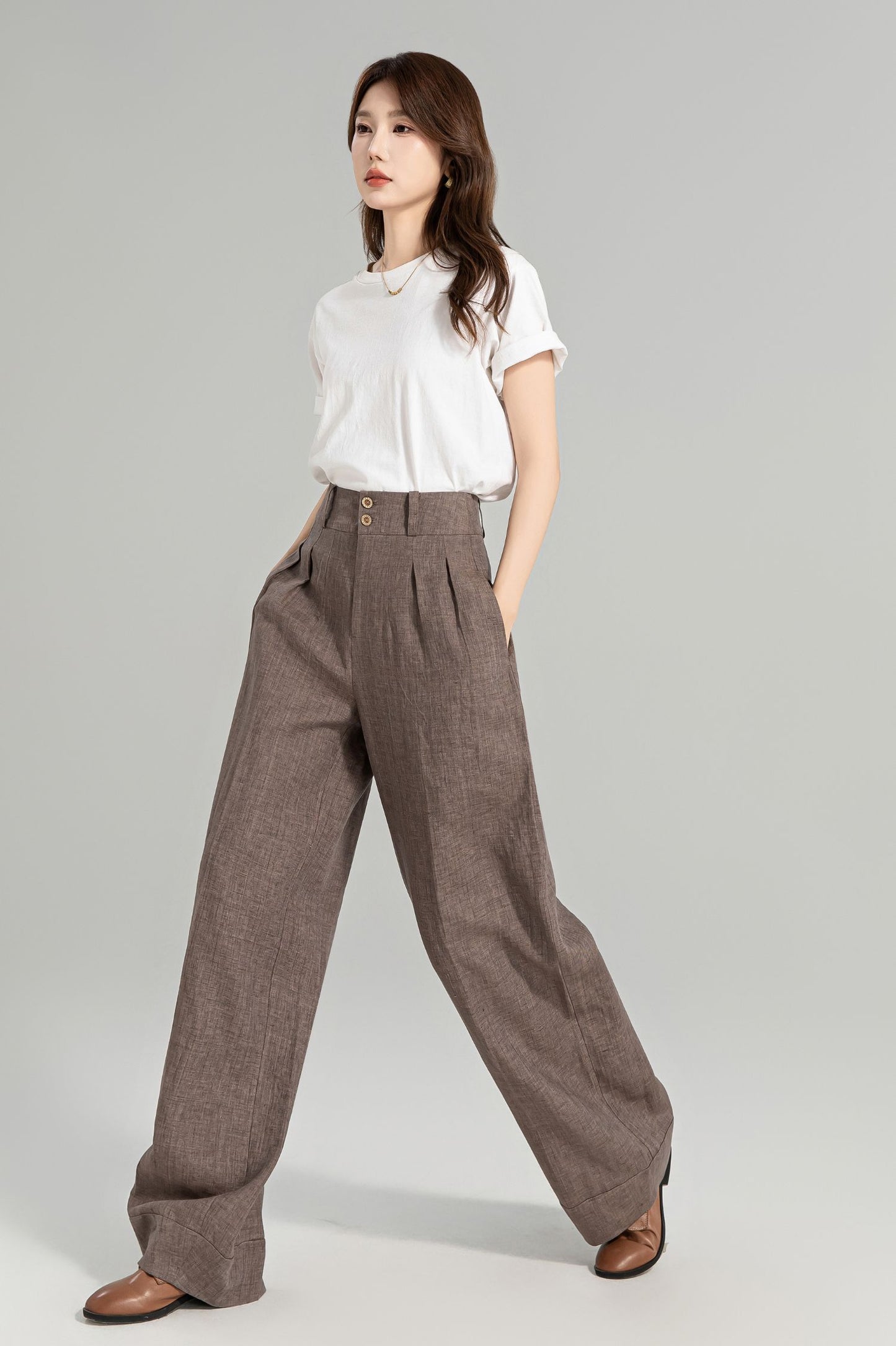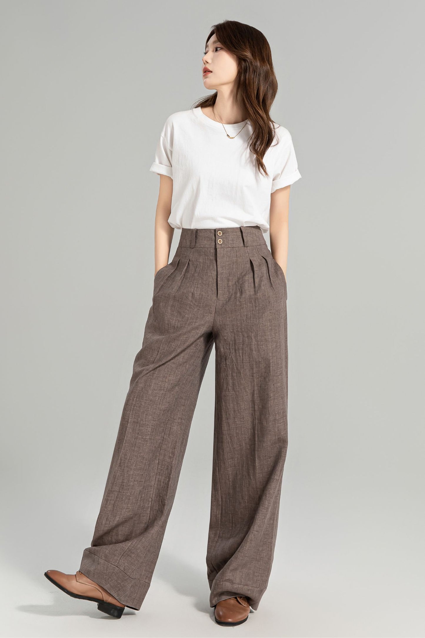 Brown Linen Wide Leg Pants – Handmade Long Relaxed Fit Trousers | Xiaolizi 4965