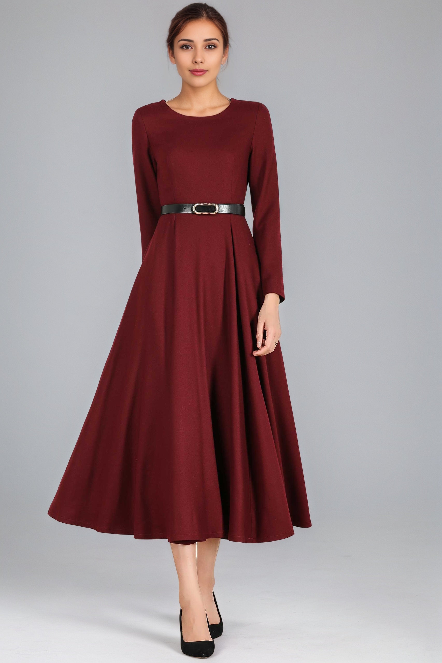 Burgundy Wool Midi Dress – Women’s Long Sleeve Fit and Flare Winter Dress 2429
