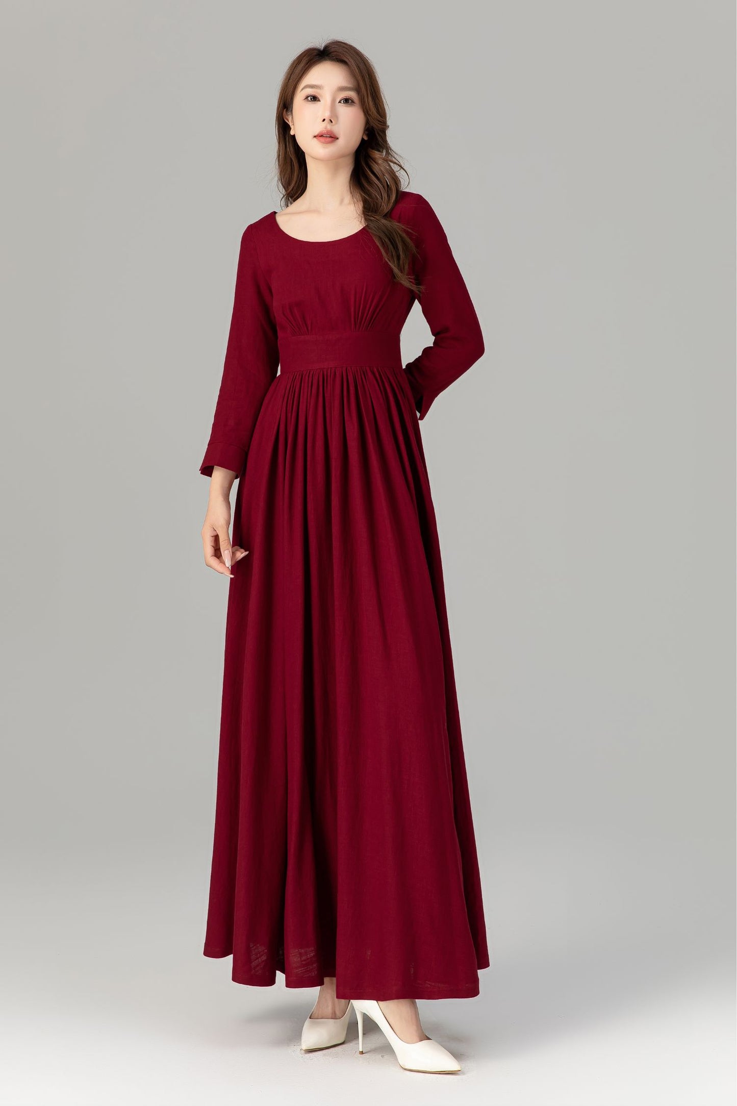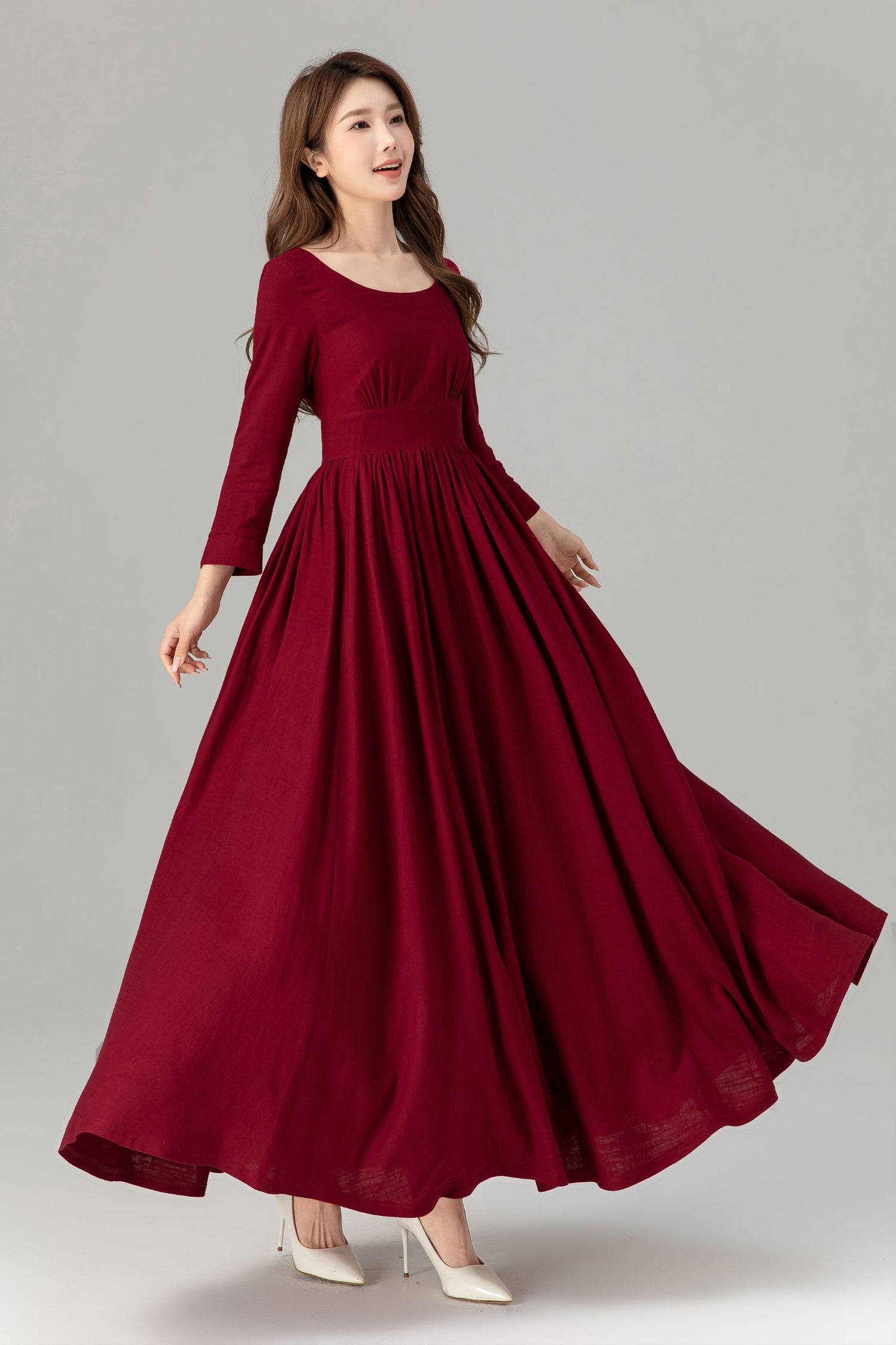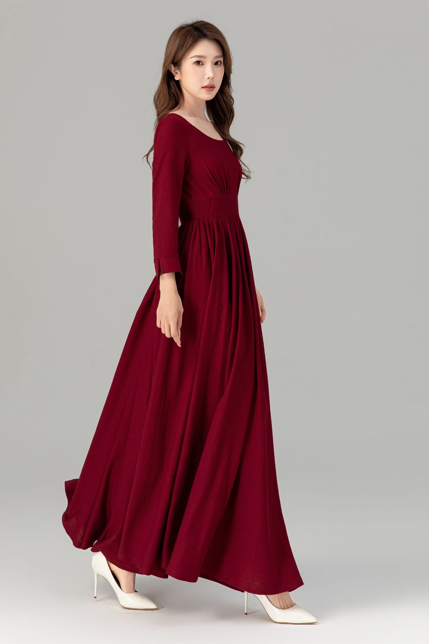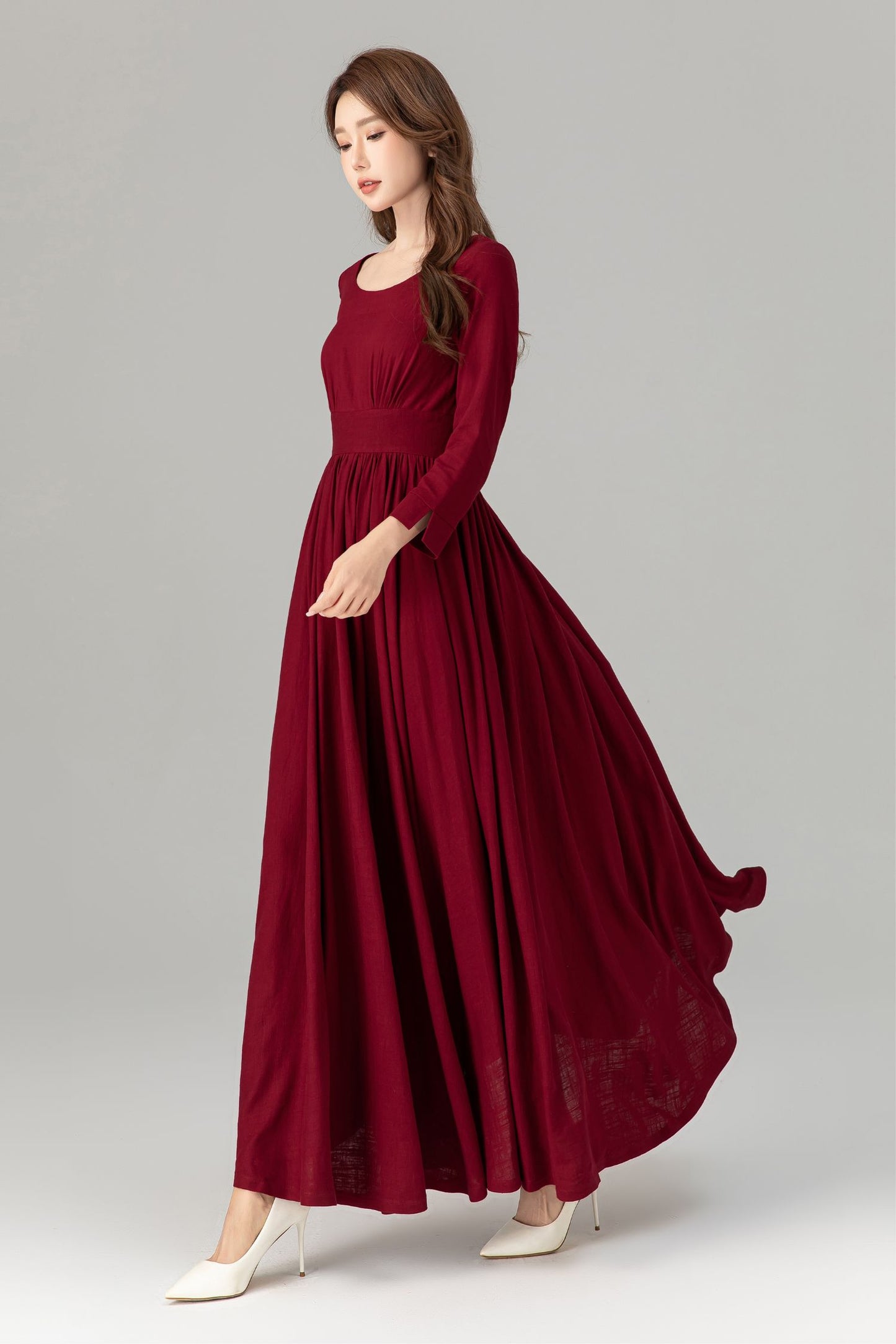 Burgundy prom high waisted spring linen dress 4924