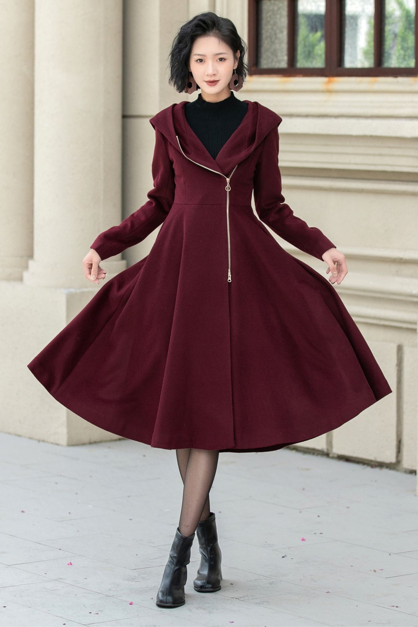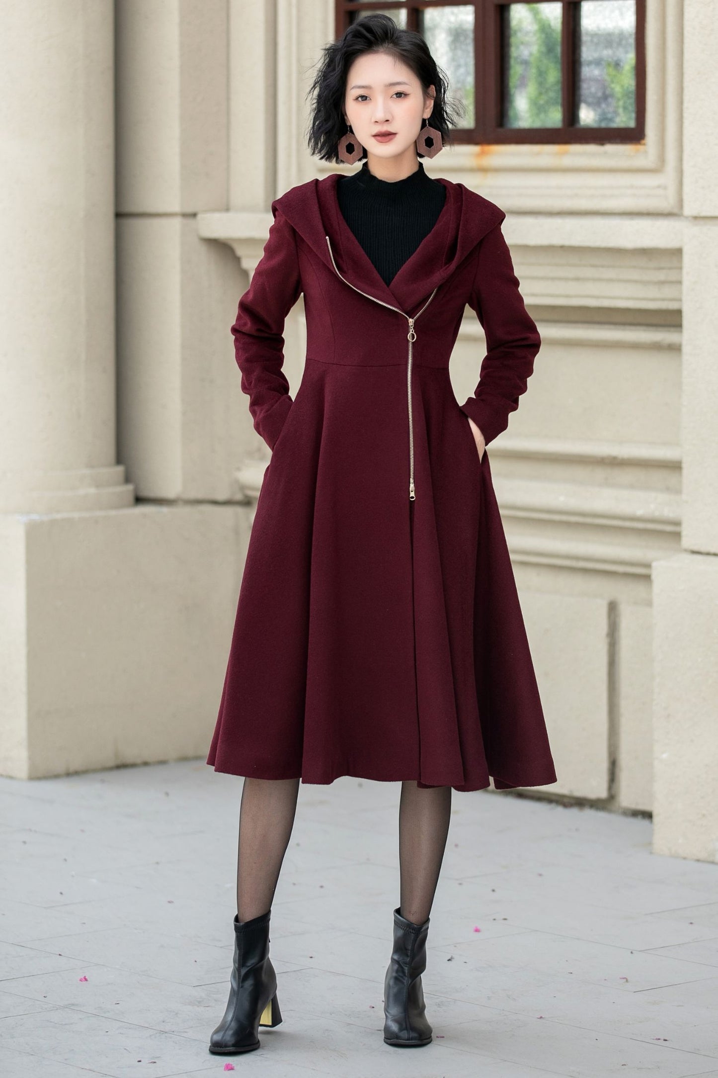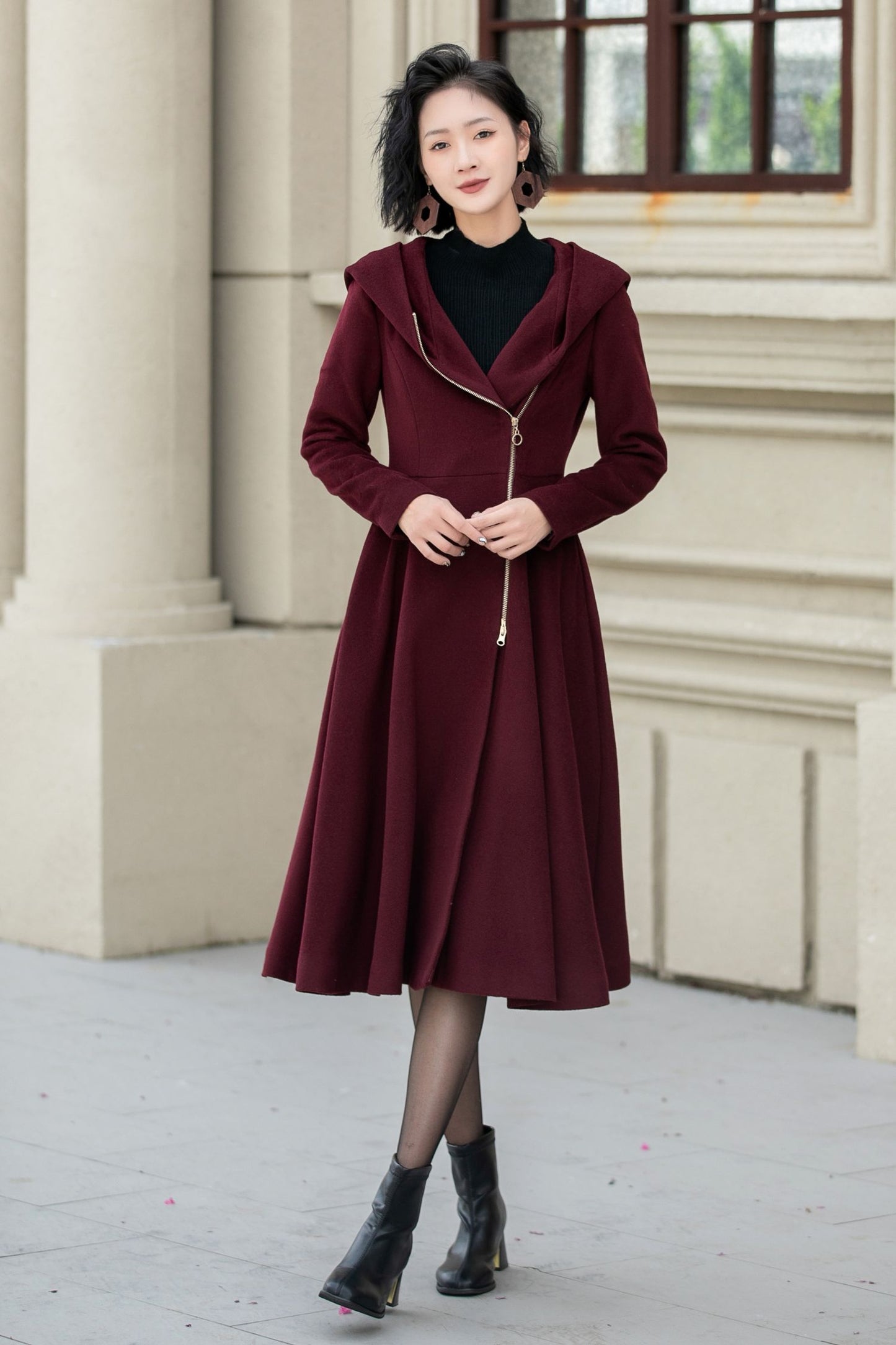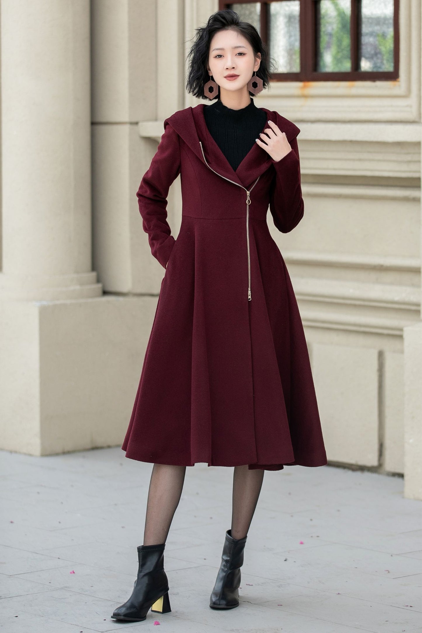 Vintage Hooded Wool Coat – Burgundy Handmade Winter Zip Overcoat 5345