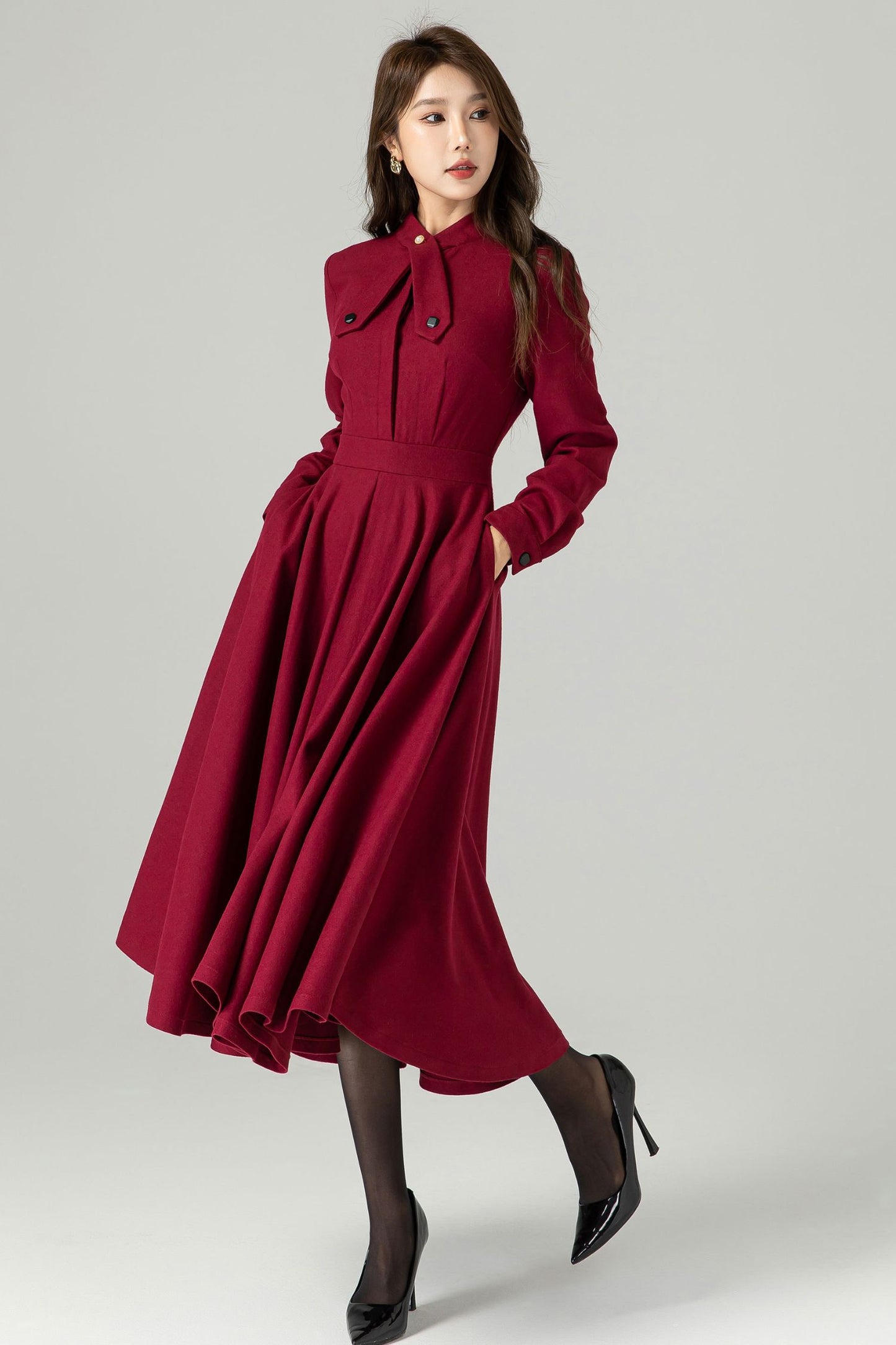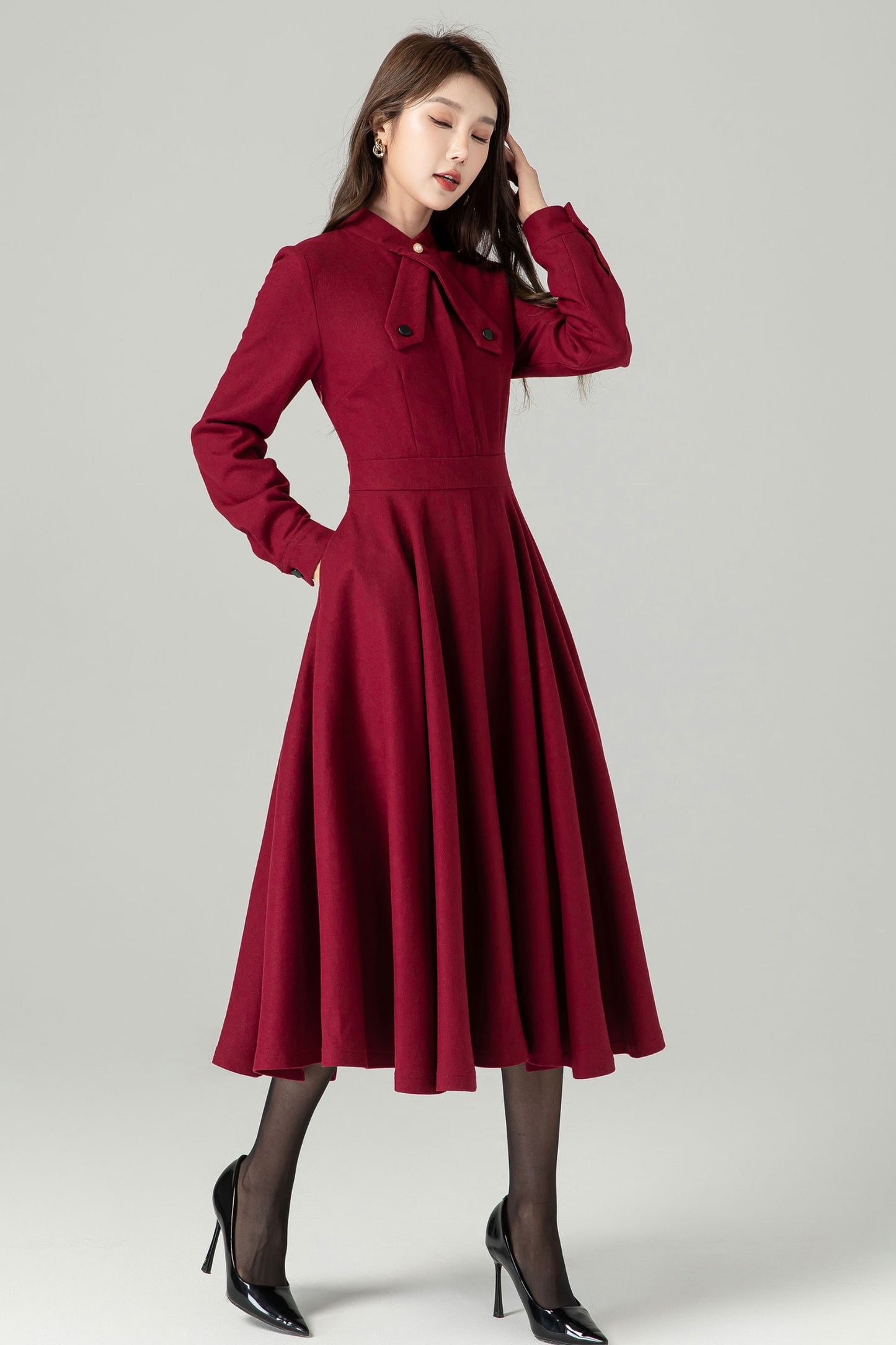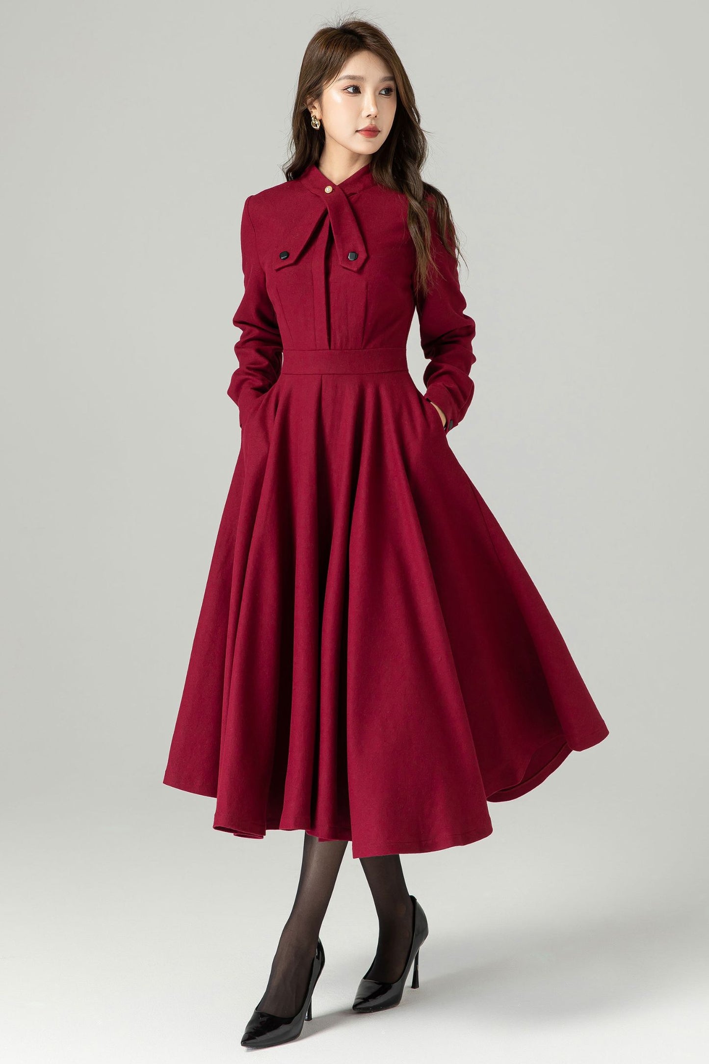 Step into timeless romance with this burgundy vintage-inspired wool dress. Designed with a fitted waist and sweeping flared hem, it captures the graceful femininity of classic 1950s silhouettes. Fully lined with satin for comfort, and finished with delicate tailoring details, this dress is perfect for winter weddings, festive gatherings, or elevating your everyday elegance.