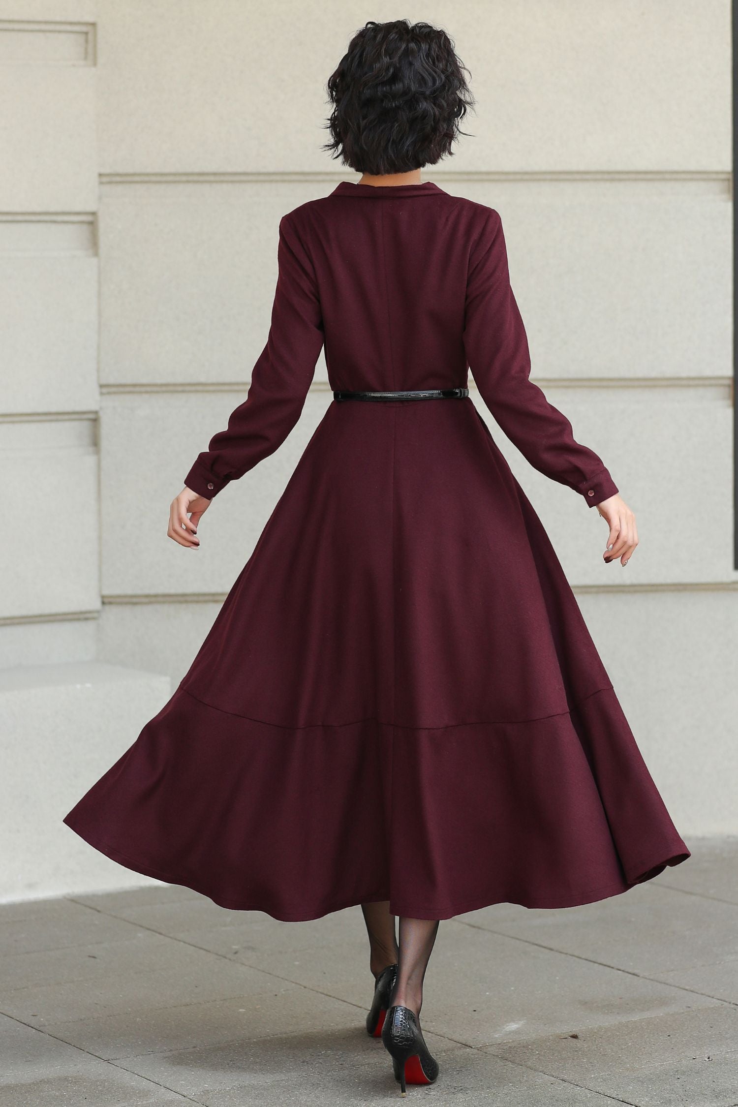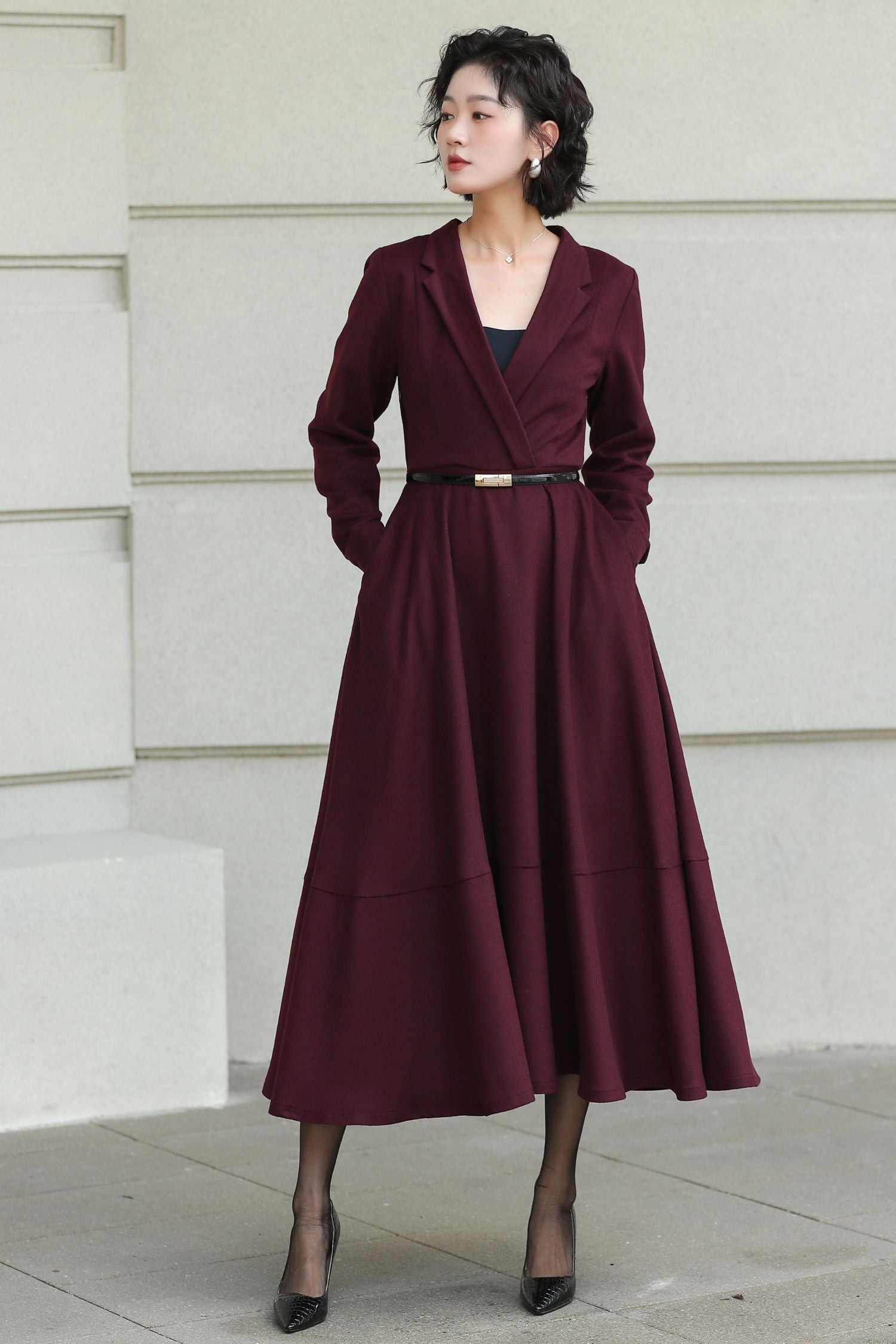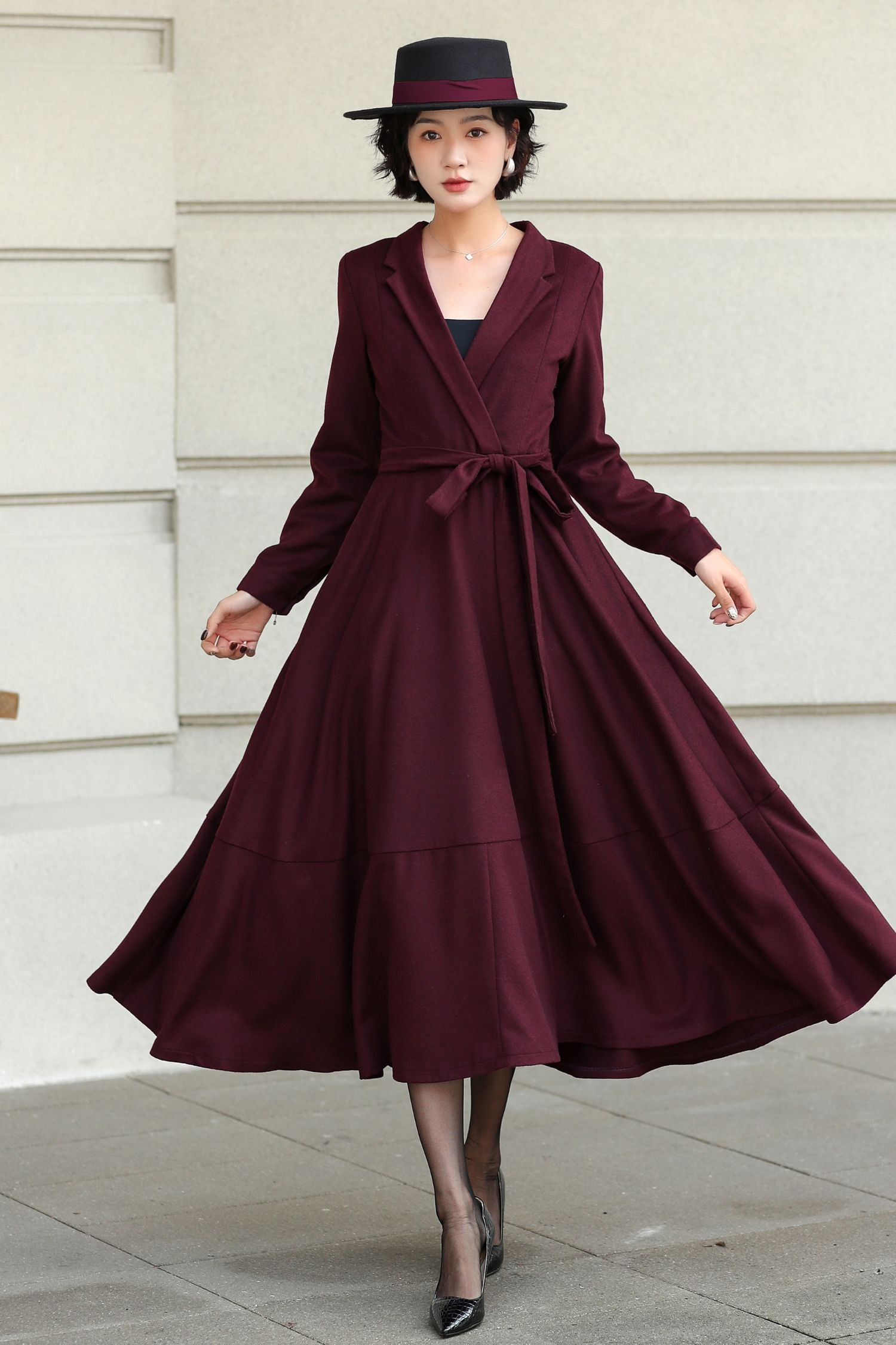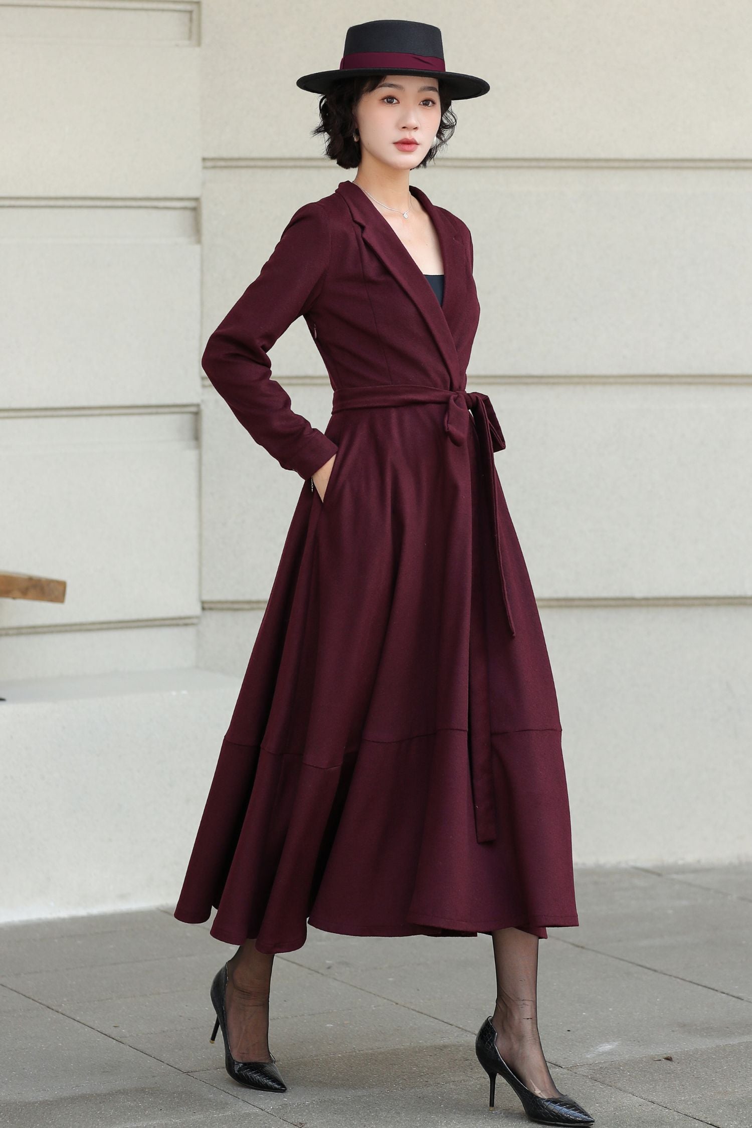 Sophisticated burgundy wool wrap midi with tie-waist A-line silhouette—warm and flattering for winter office days, holiday parties, and evening events. Layer with boots and a coat for chic seasonal style.
