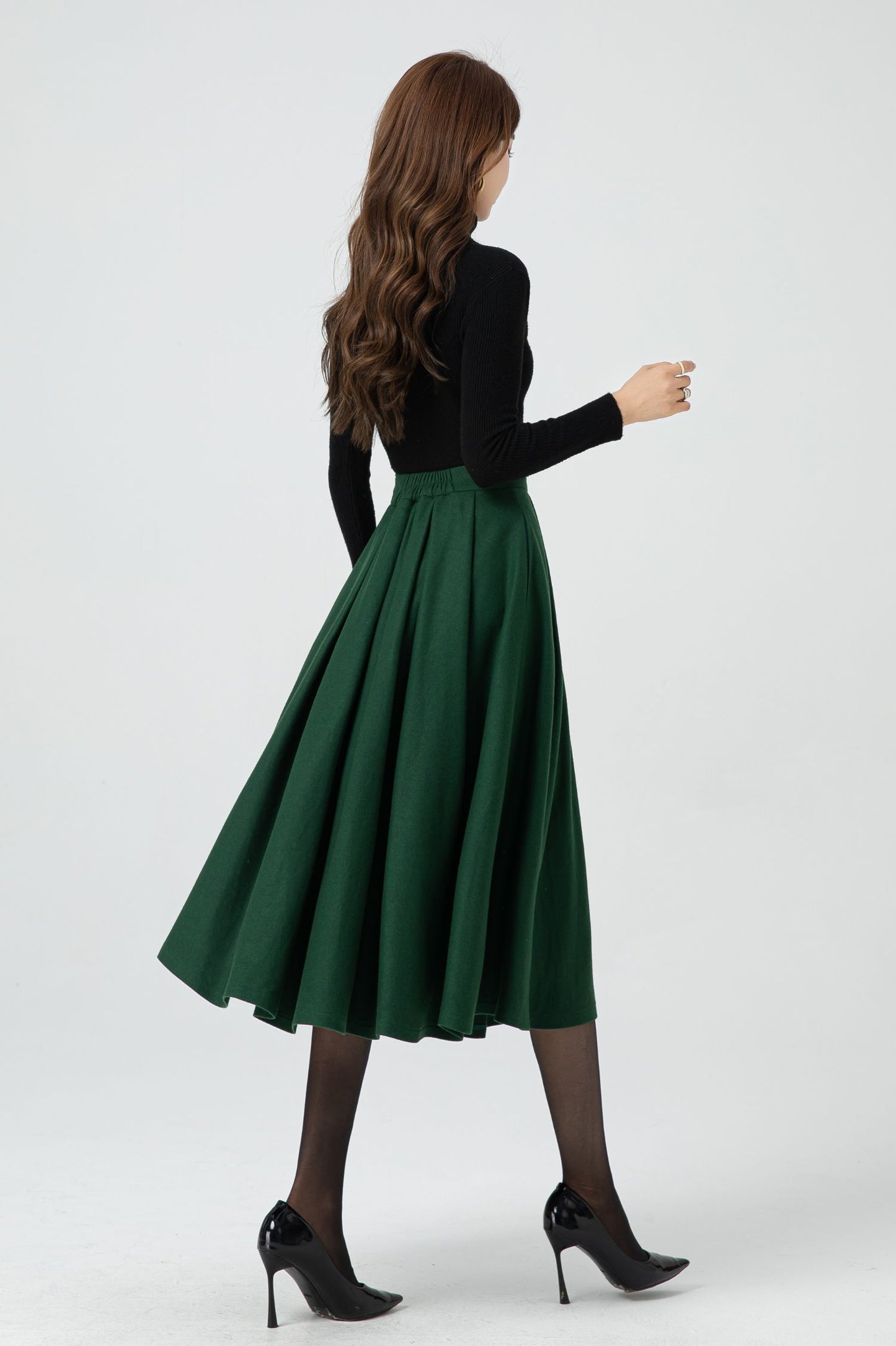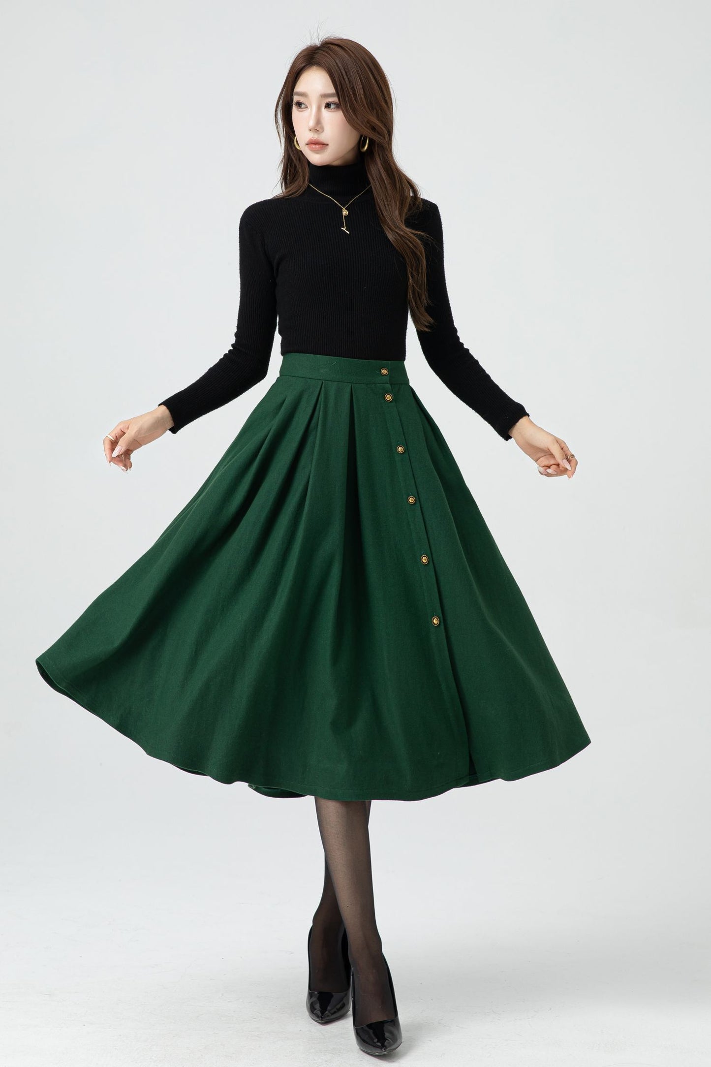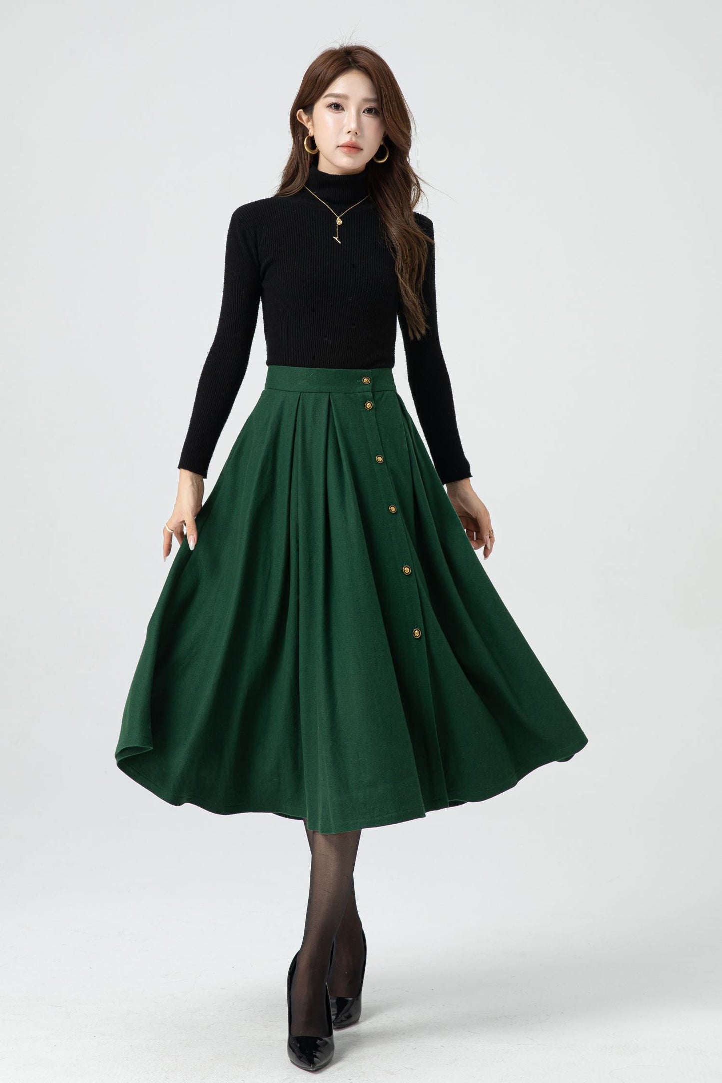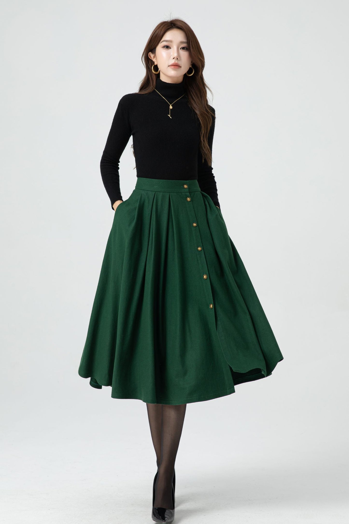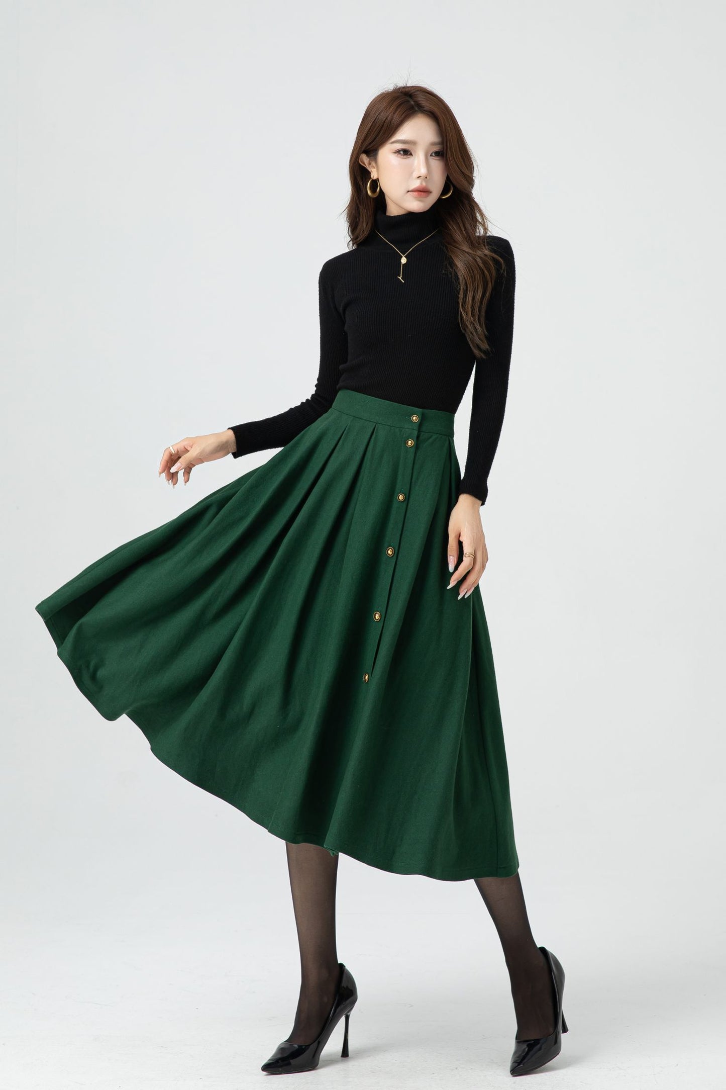 Expertly crafted with wool, this button front green midi skirt is a timeless addition to any wardrobe. The midi length offers versatile styling options while the button front adds a touch of sophistication. Stay warm and stylish with this classic, high-quality piece.