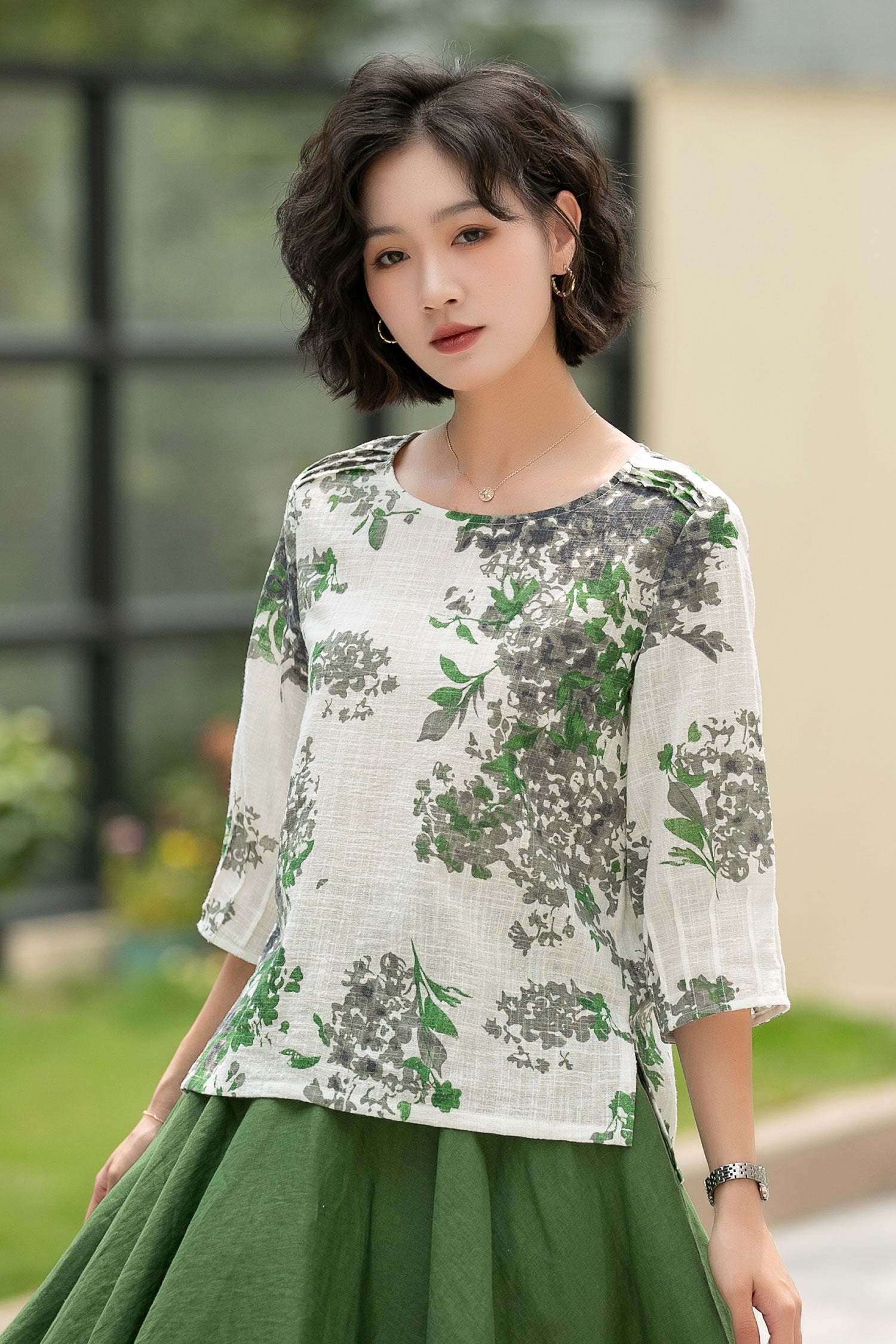 Feminine Floral Linen Top in Off-White – Relaxed Round Neck – 6055