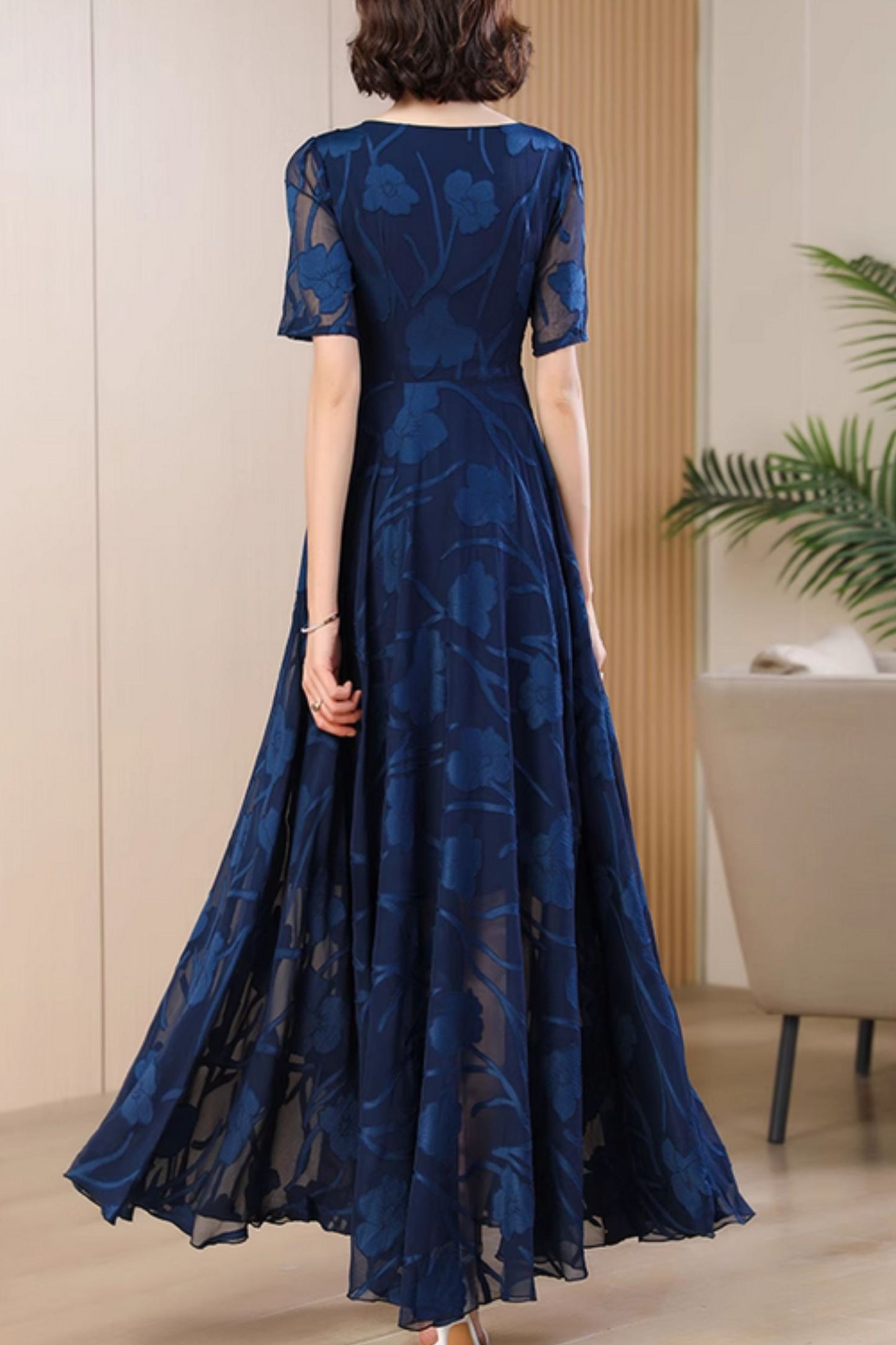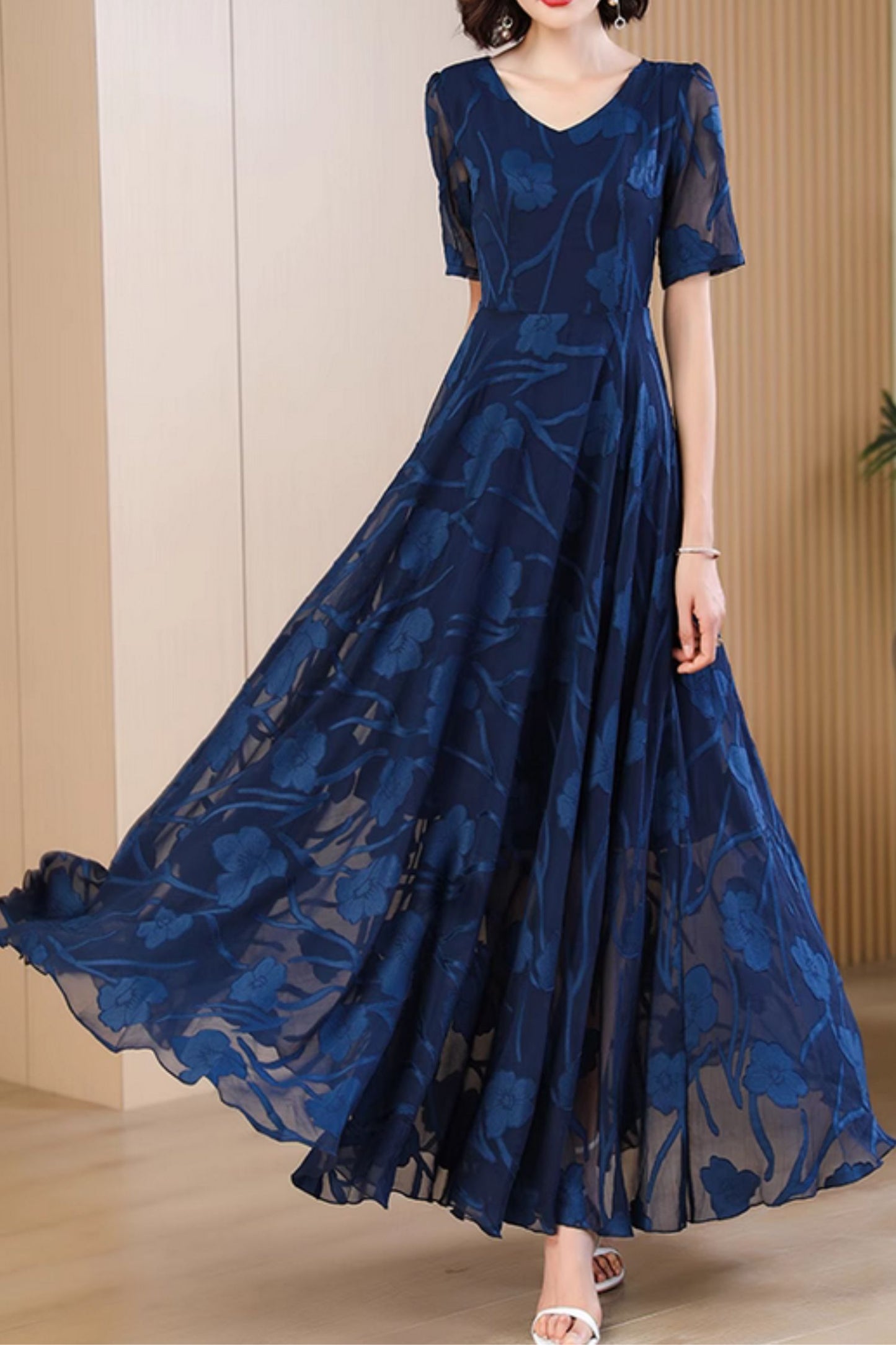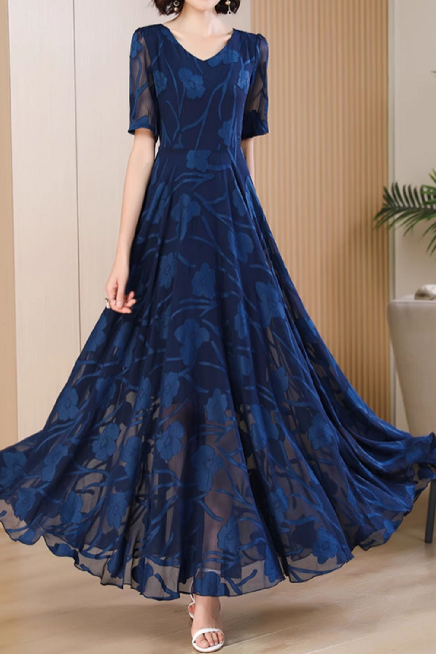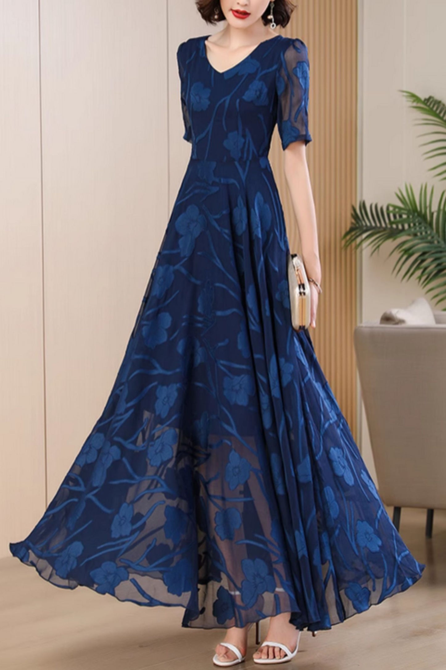 As a product expert in the fashion industry, let me introduce you to our Dark Blue Floral Maxi Prom Summer Chiffon Dress 5051. Made with a beautiful dark blue floral print on chiffon fabric, this dress is perfect for a summer prom or any special occasion. Its maxi length adds elegance and the chiffon material ensures comfort.