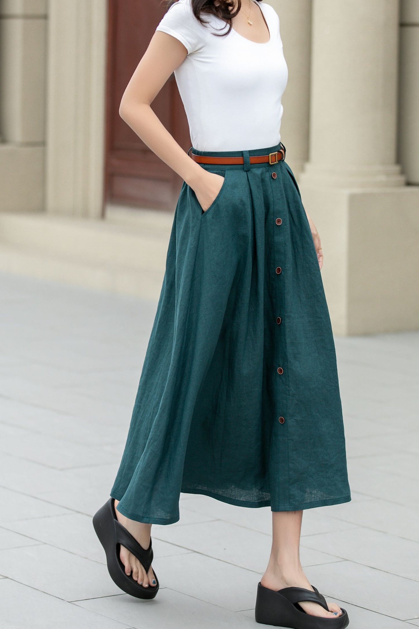Showcase your style in a sophisticated mid-calf A-line skirt, beautifully tailored in a lush shade of green. The skirt features a distinctive button detail that adds a unique touch. Ideal for the blooming season of spring, this skirt is a perfect addition to any plus size wardrobe.