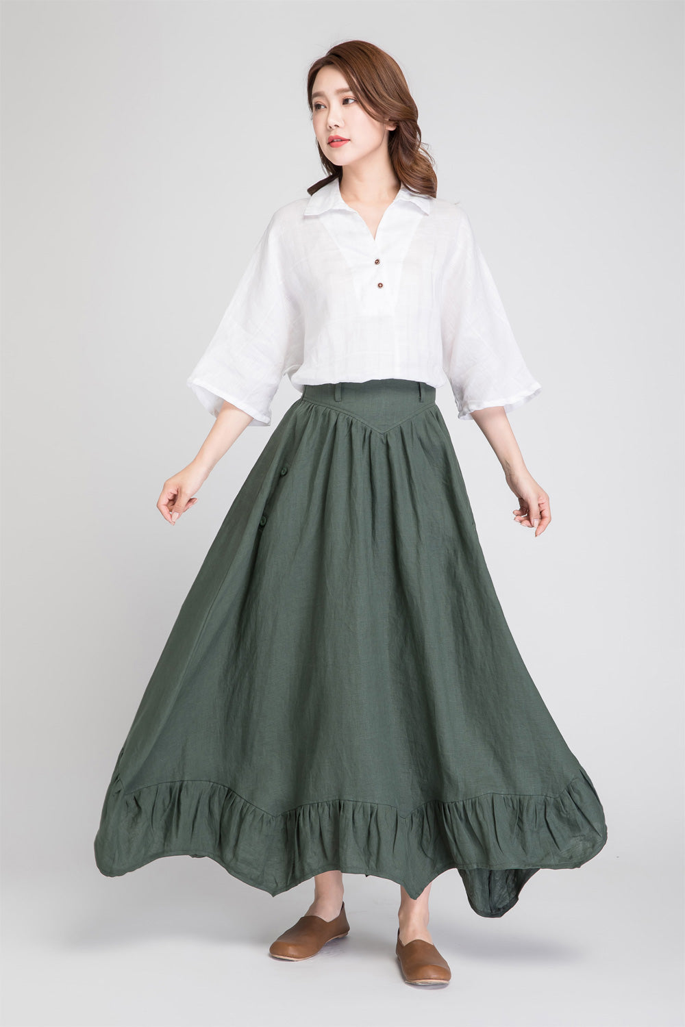 Feminine Dark Green Linen Maxi Skirt – Irregular Ruffle Hem – 1889