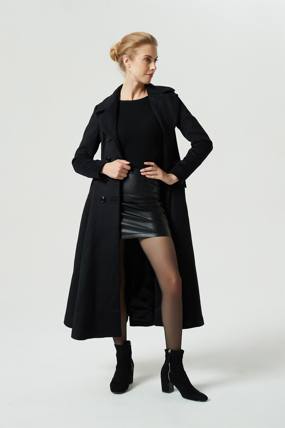 Step into timeless elegance with this black double-breasted wool coat. Tailored with a structured bodice and flared A-line skirt, it flatters the figure while keeping you warm. Made from a premium wool blend and fully lined for comfort, this versatile coat pairs effortlessly with both casual and formal looks, making it a winter wardrobe essential.