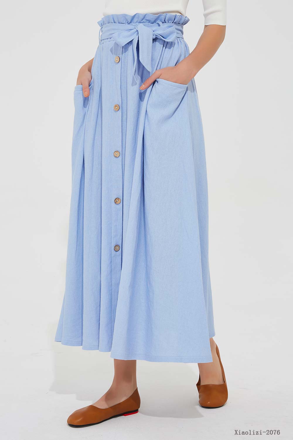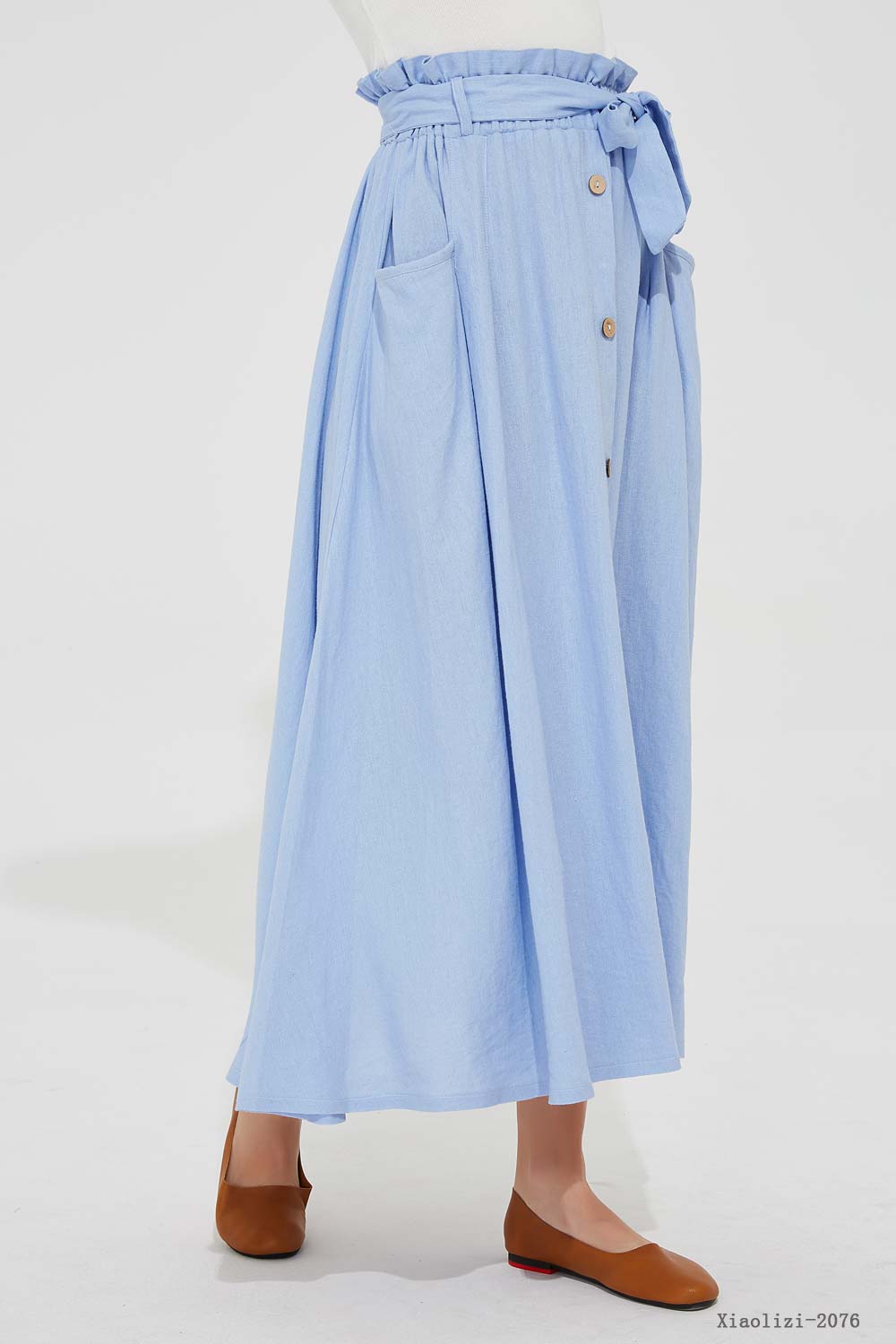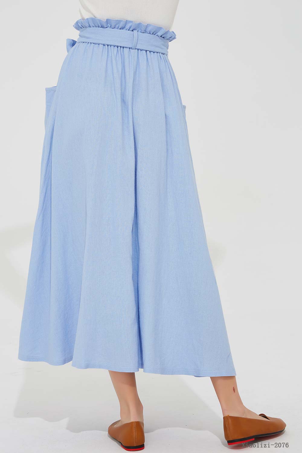 Soft blue color lend a feminine touch to our ruched pleat full skirt fashioned with a paperbag high elastic waist looped through with a drapey self sash tie belt.