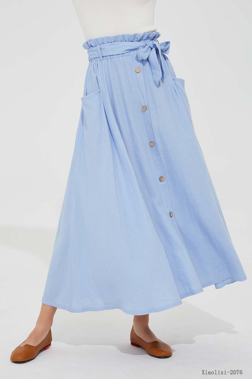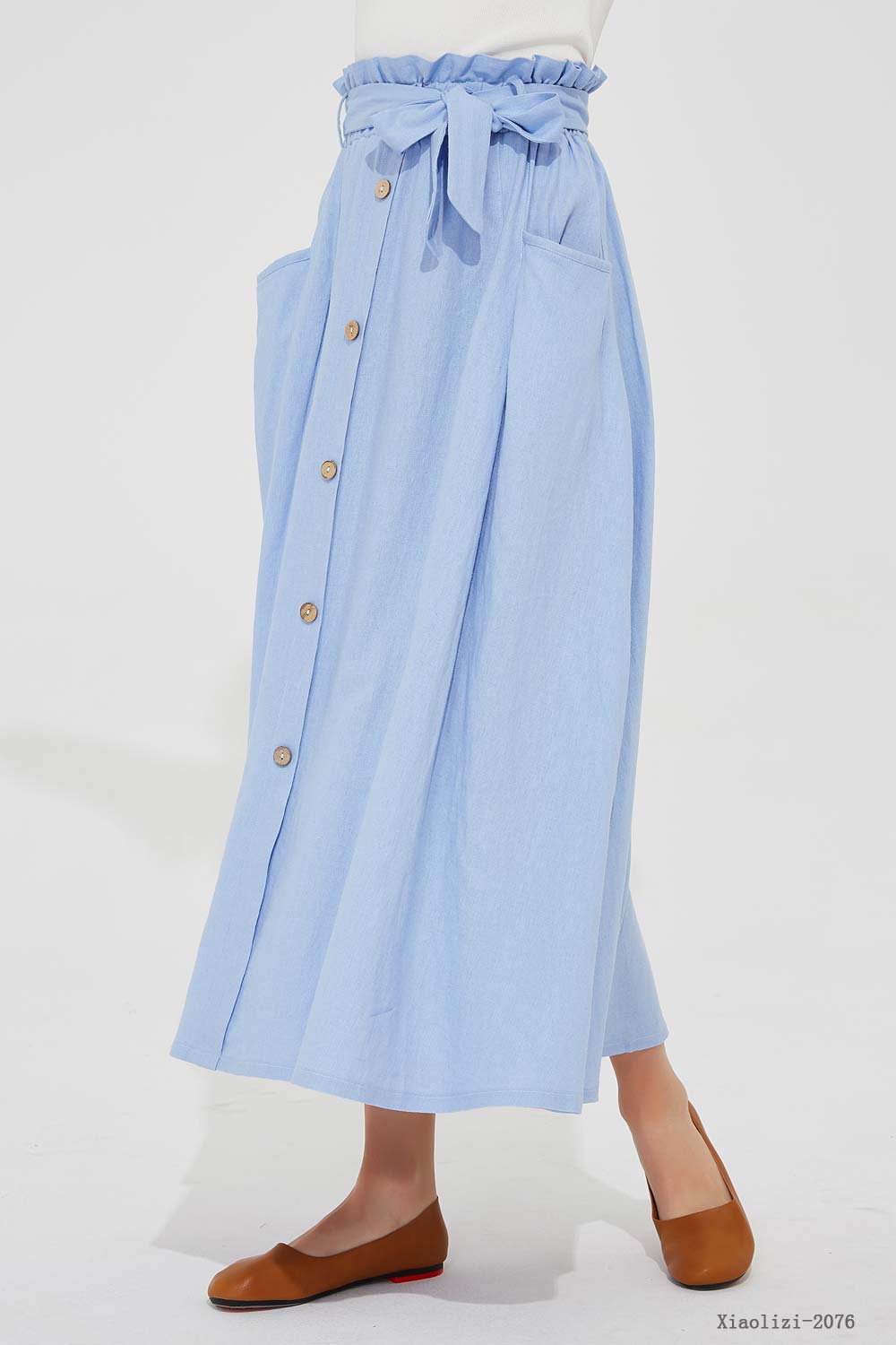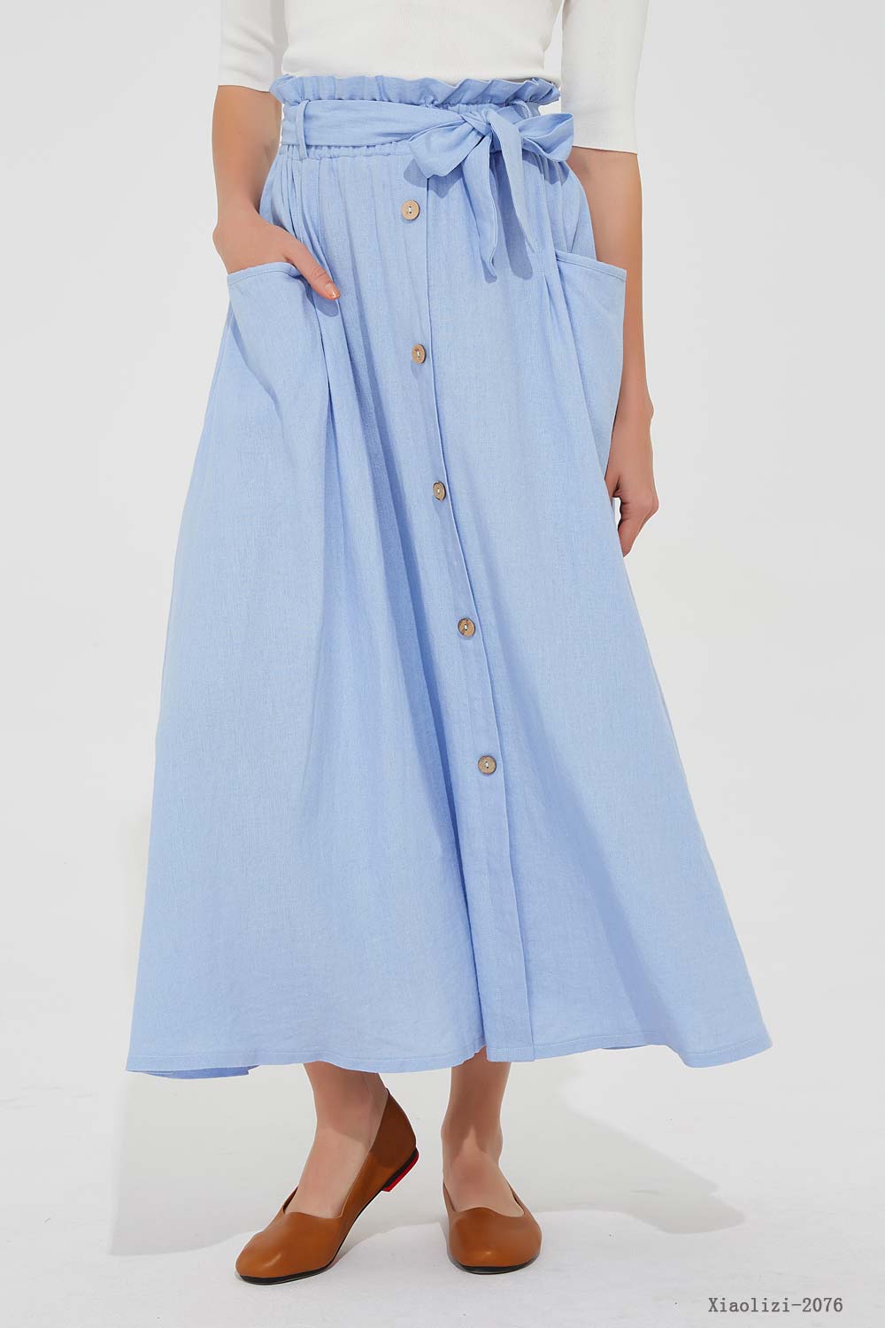 Soft blue color lend a feminine touch to our ruched pleat full skirt fashioned with a paperbag high elastic waist looped through with a drapey self sash tie belt.