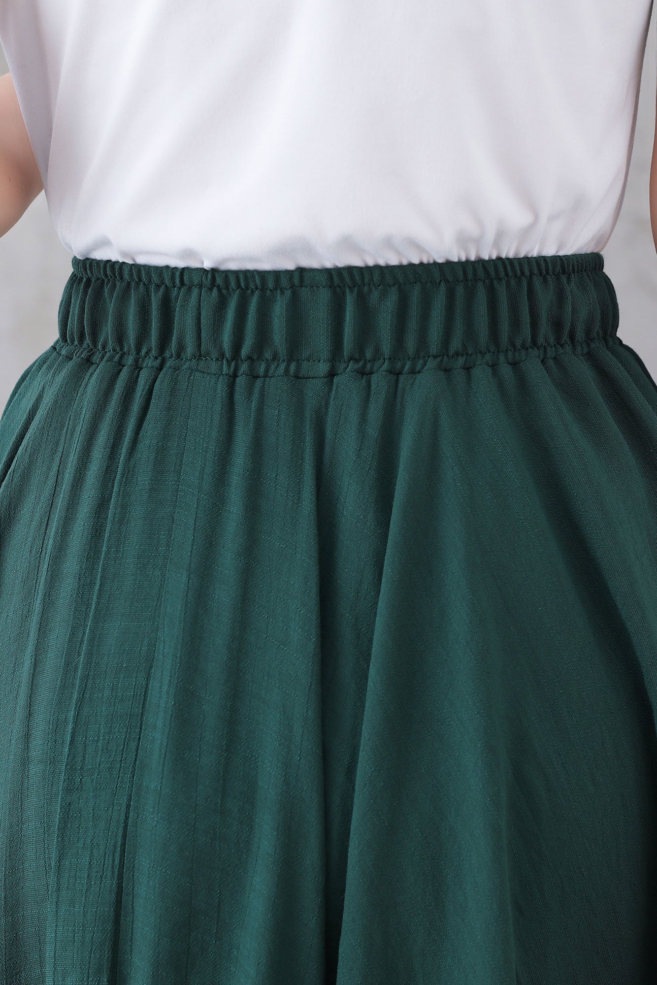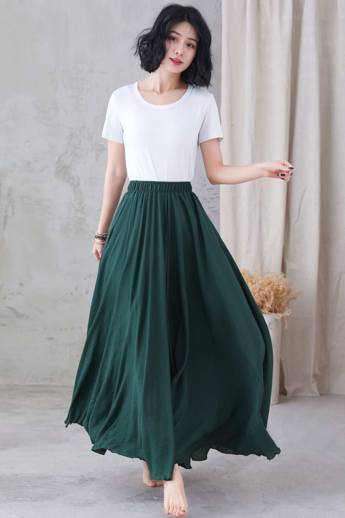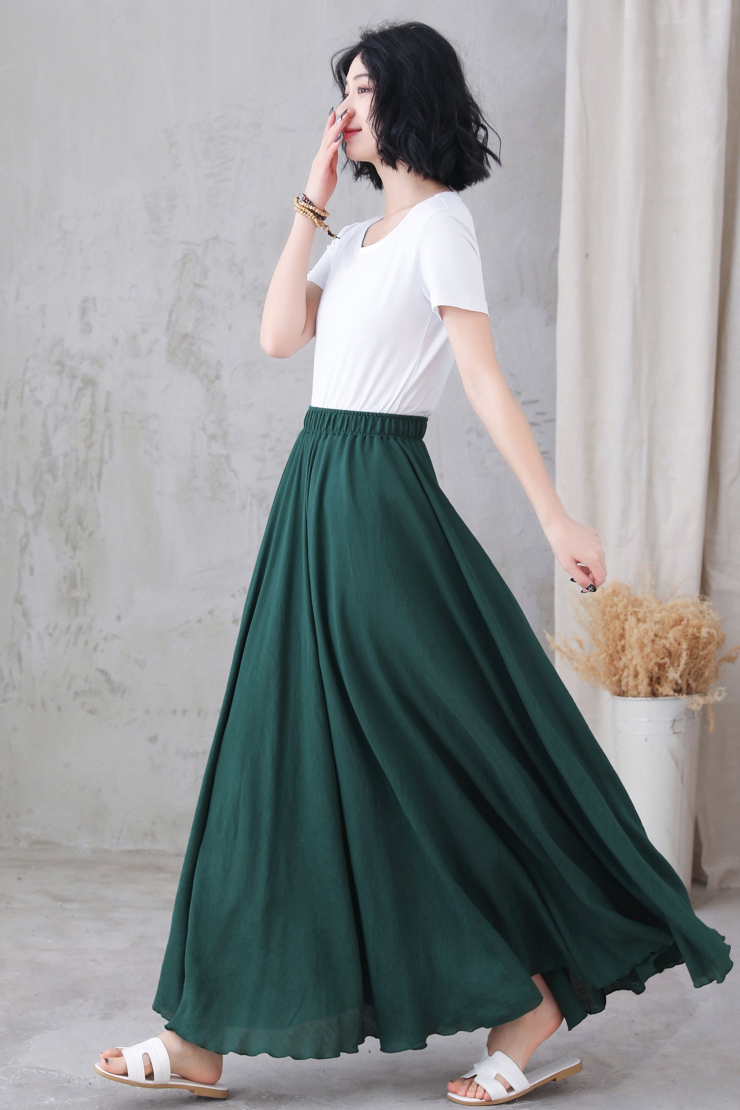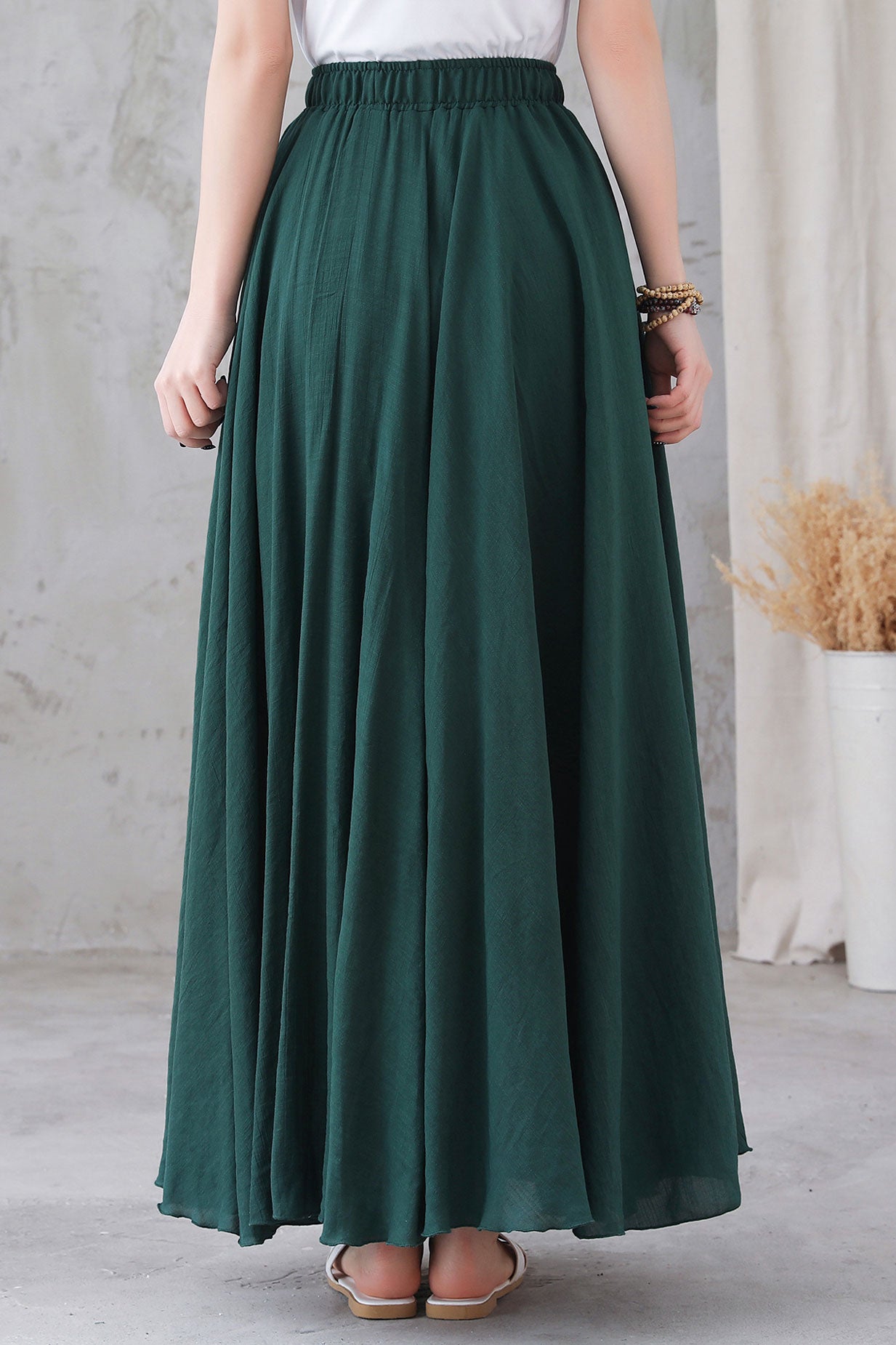 This green linen long skirt features a comfortable elastic waistband for a flexible fit. Crafted from breathable linen, it offers lightweight wear ideal for warm weather. Its flowing silhouette provides elegant movement, making it a versatile addition to your wardrobe for both casual and refined occasions.