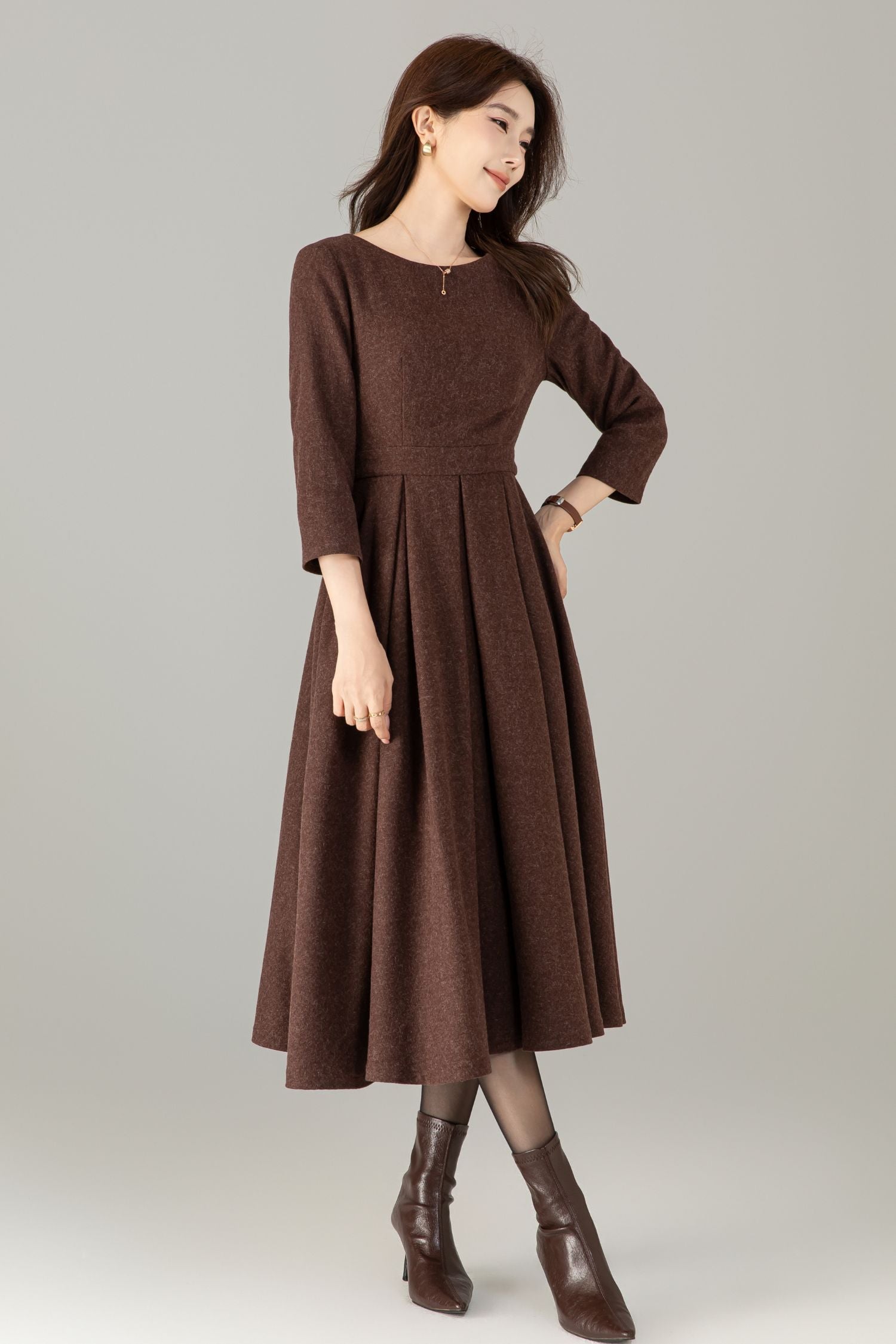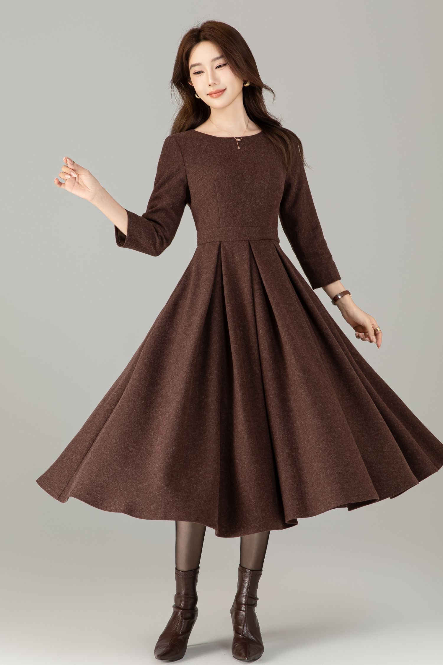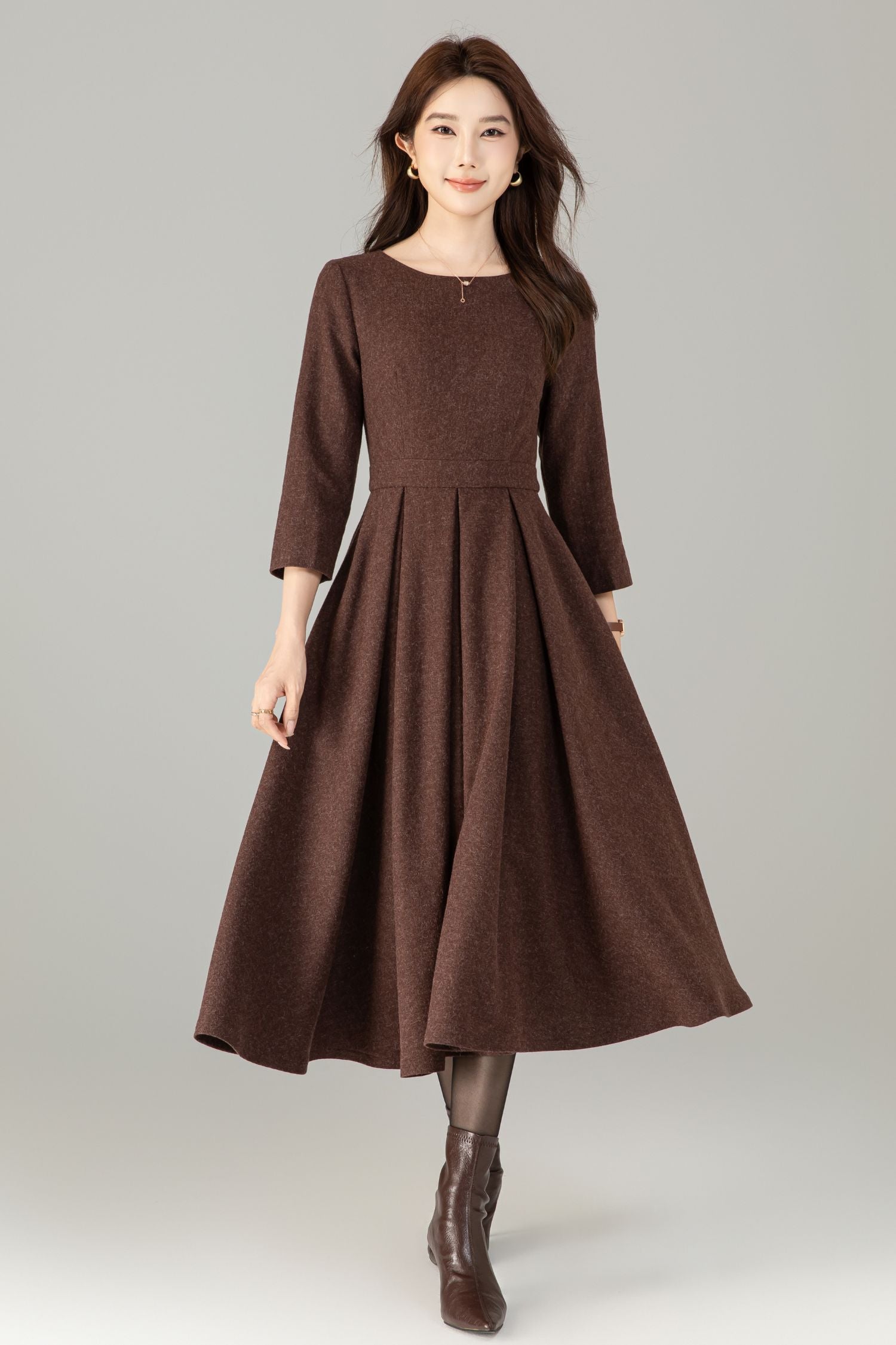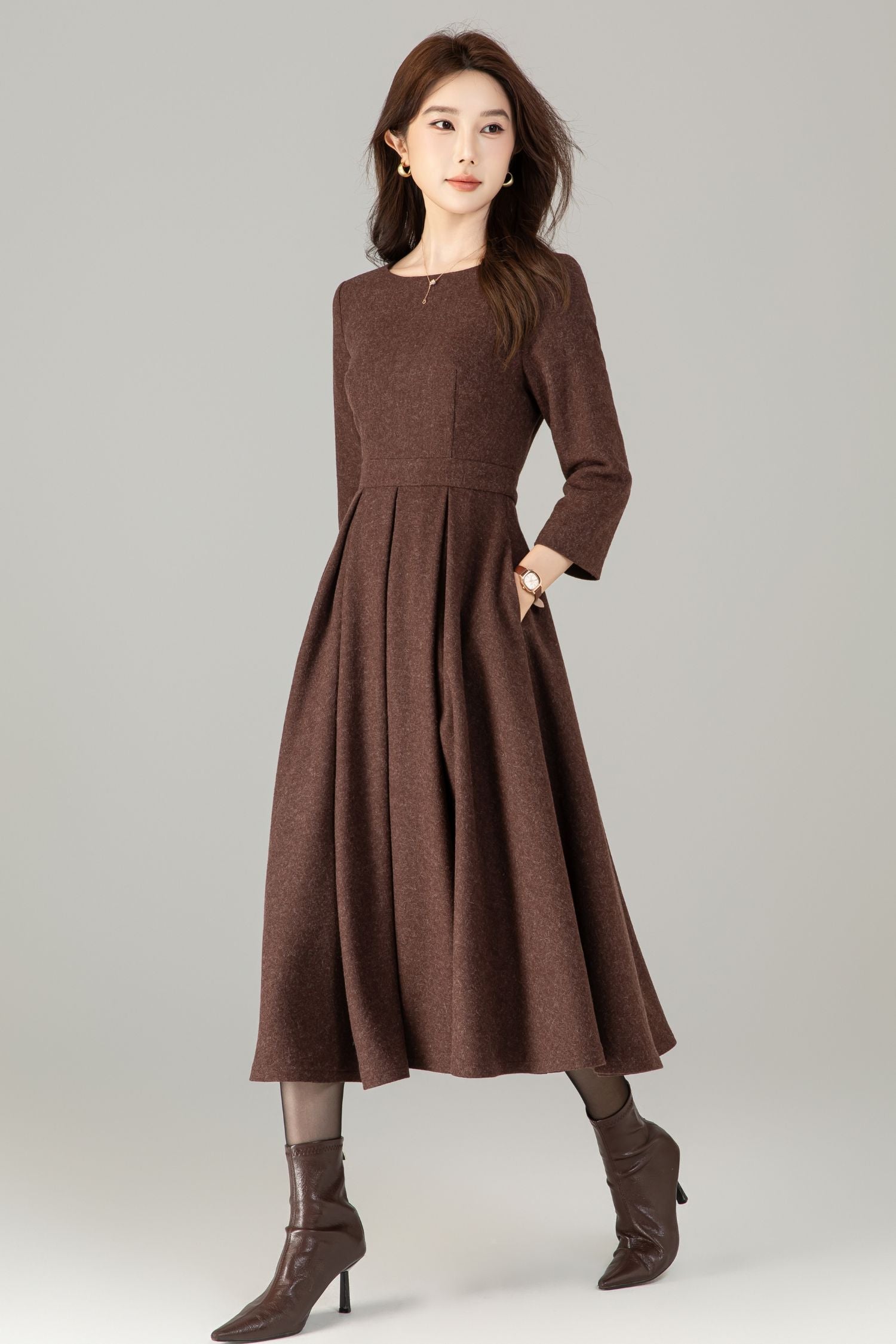 Vintage Wool Blend Midi Dress – Handmade Fit and Flare Winter Dress with Pockets | Xiaolizi 6495