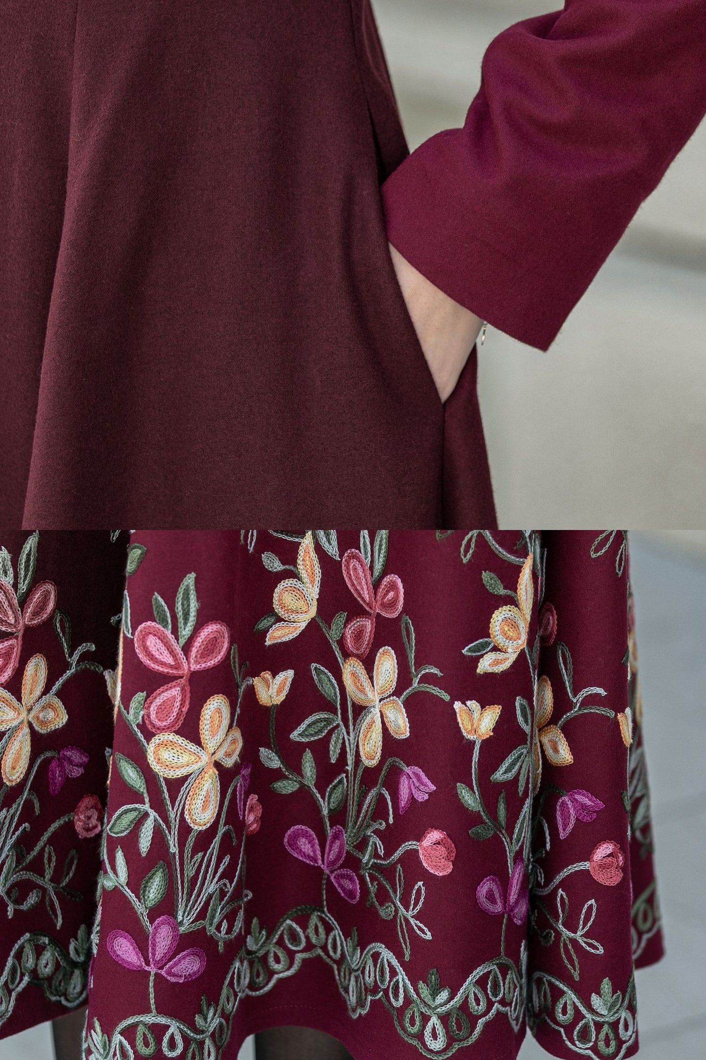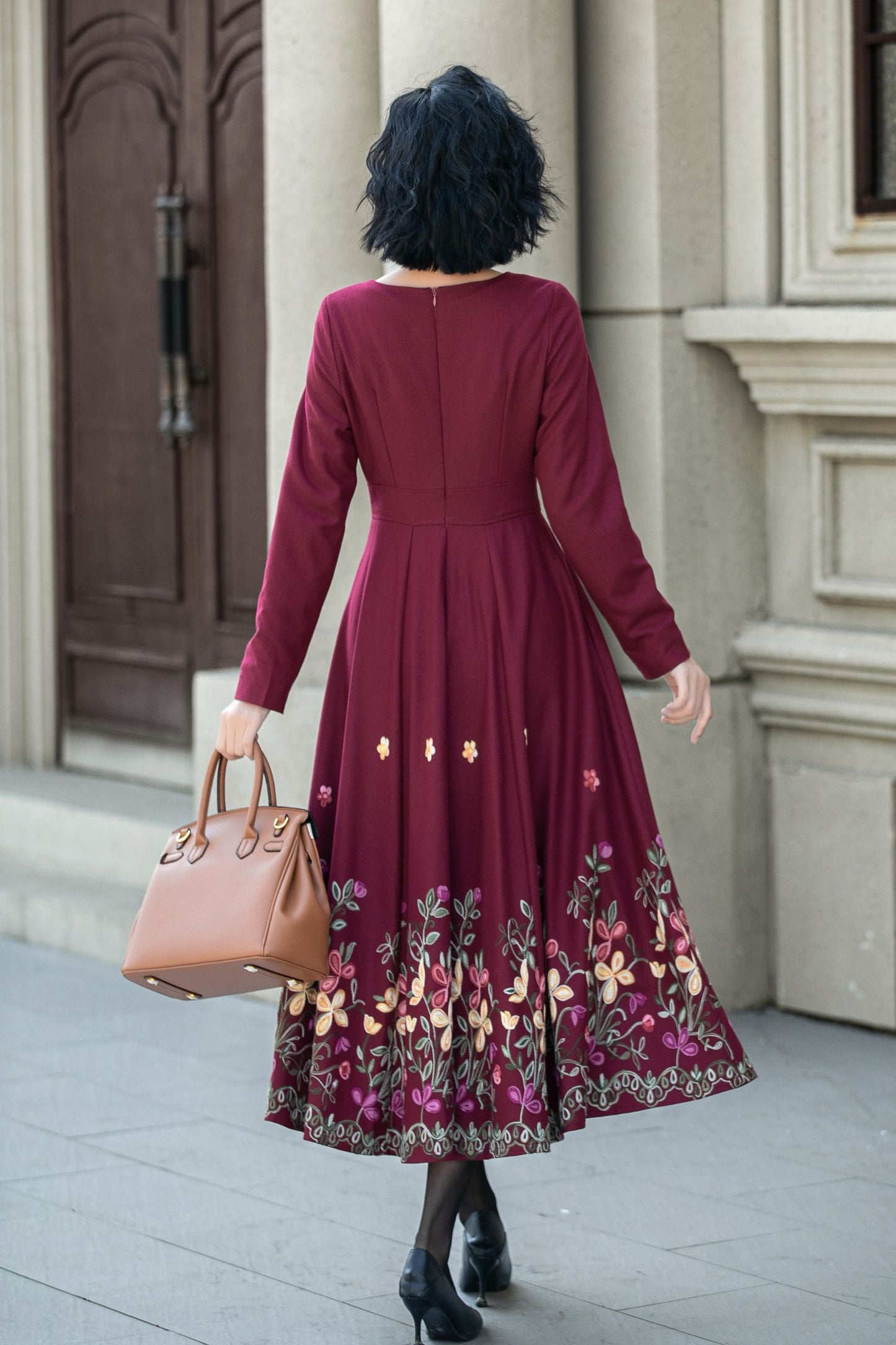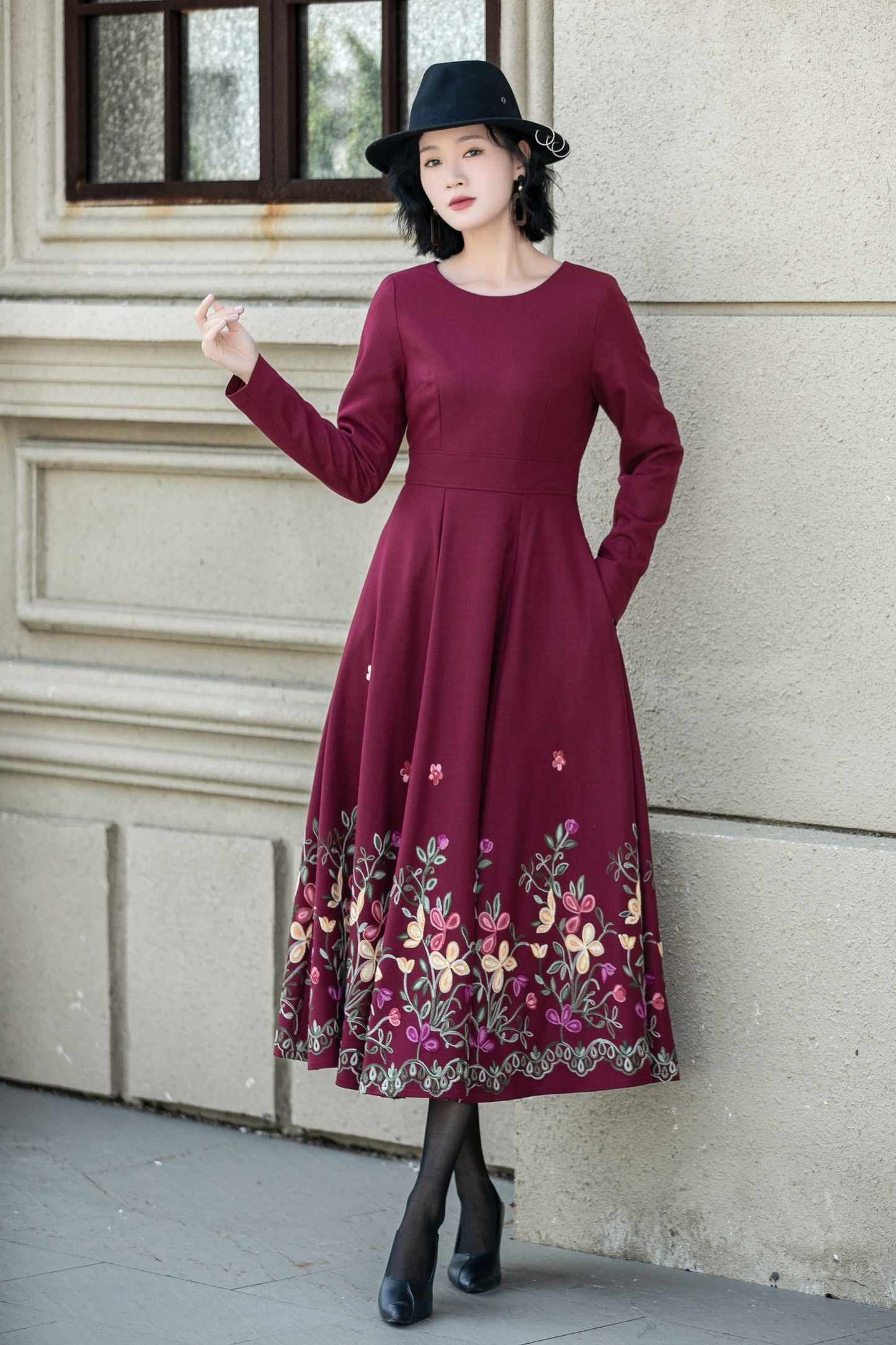 The burgundy long wool dress, its premium wool fabric provides unparalleled warmth and comfort, making it the ideal choice for staying cozy and chic during the colder months.