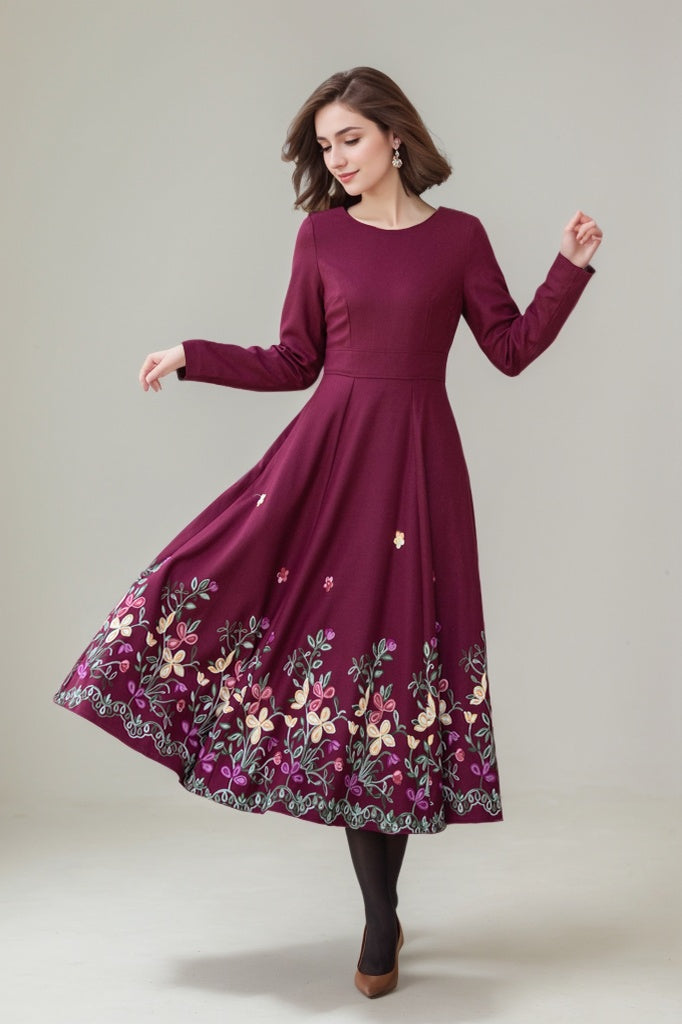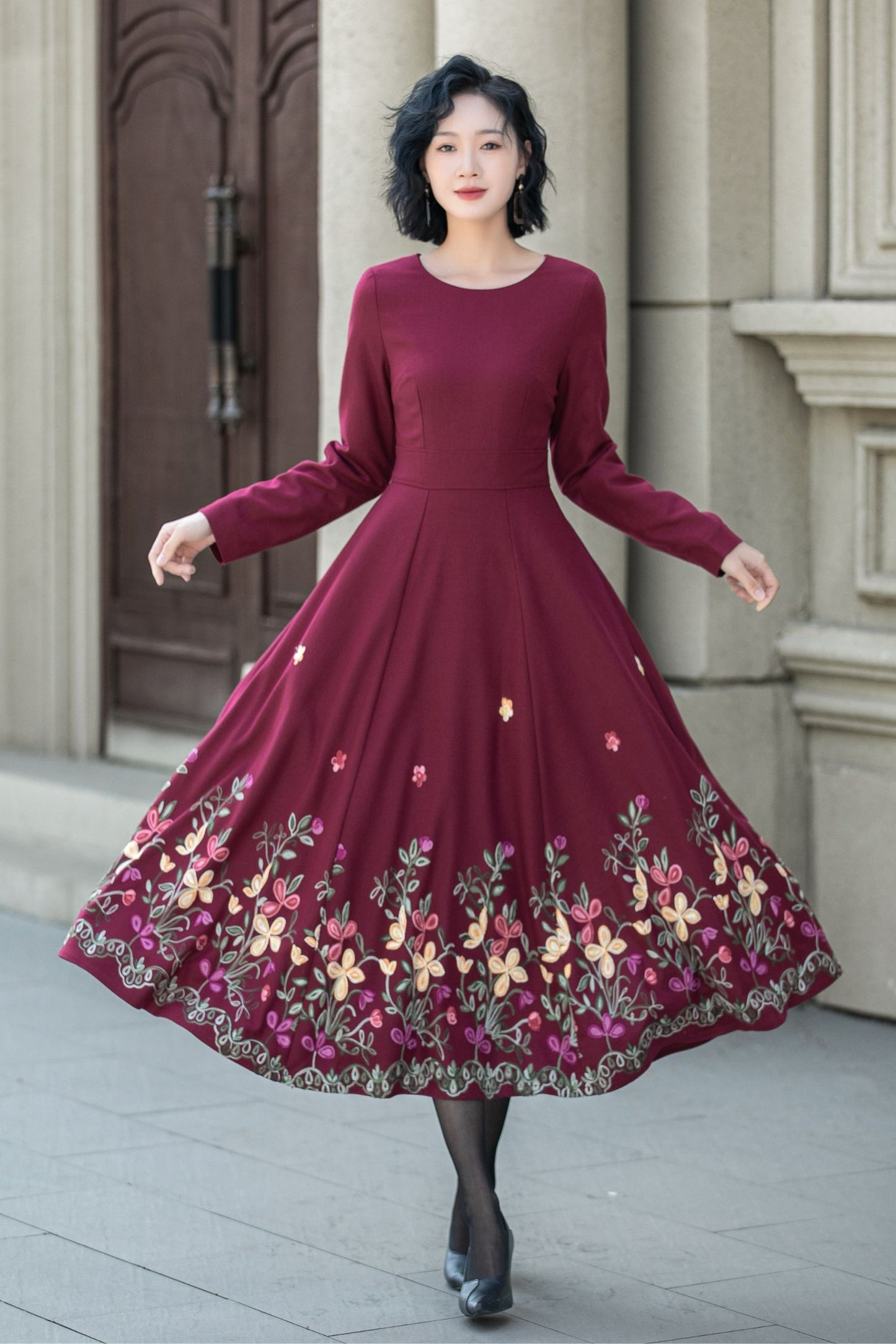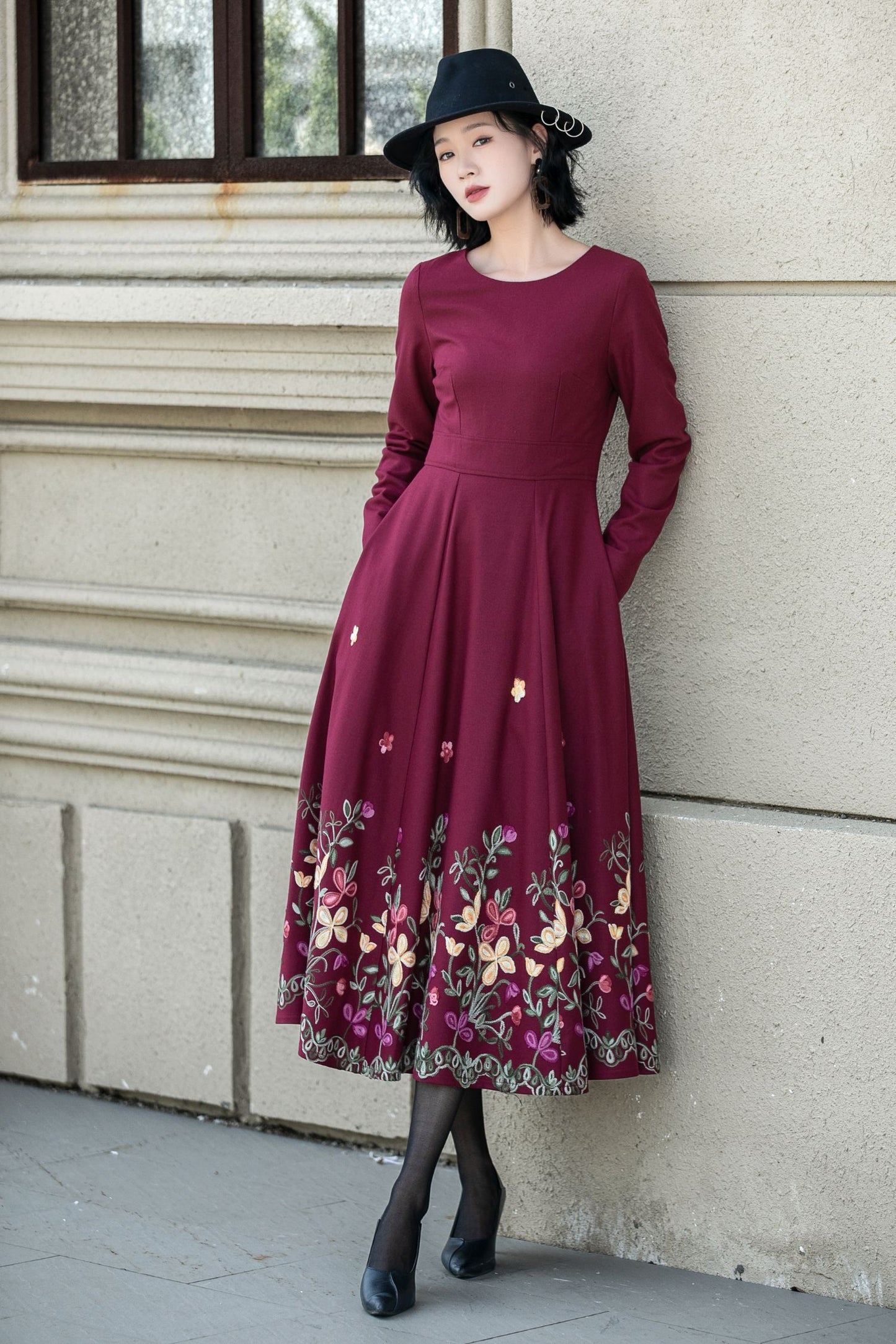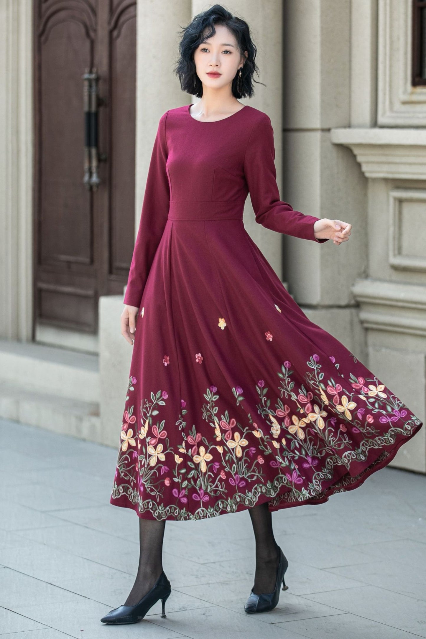 The burgundy long wool dress, its premium wool fabric provides unparalleled warmth and comfort, making it the ideal choice for staying cozy and chic during the colder months.