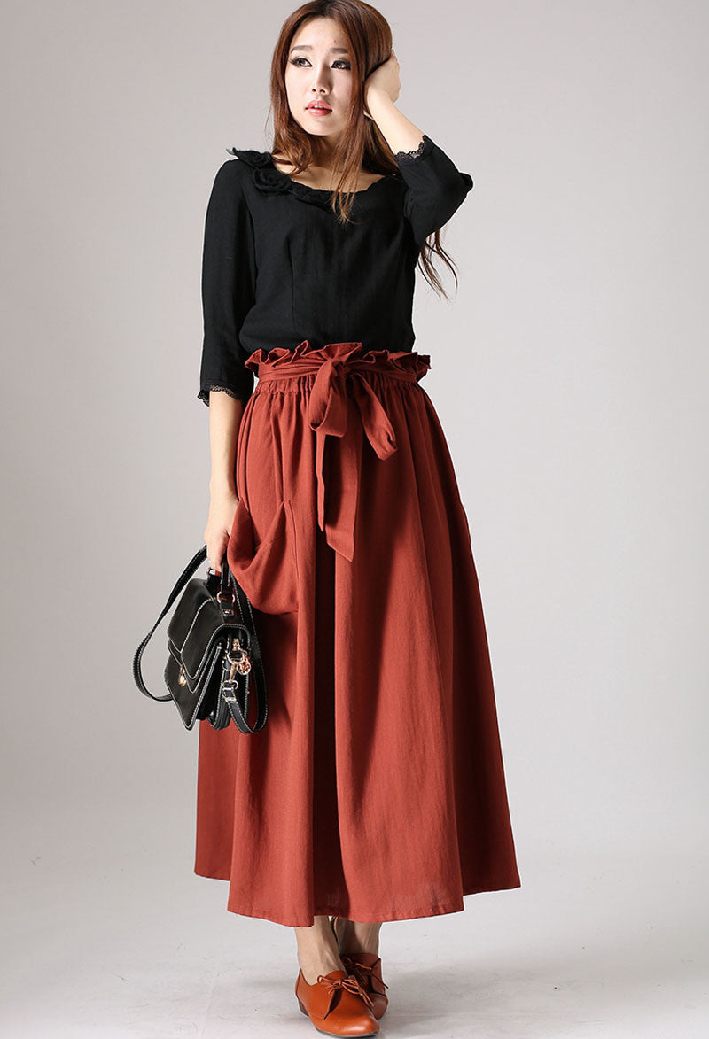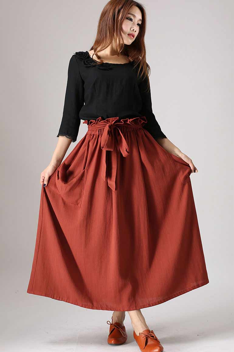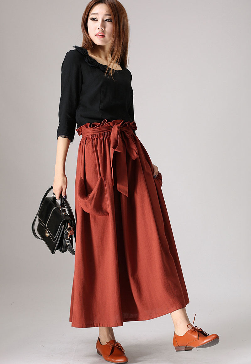 Rust red long swing skirt with elastic wasit and ruff detail 0848#