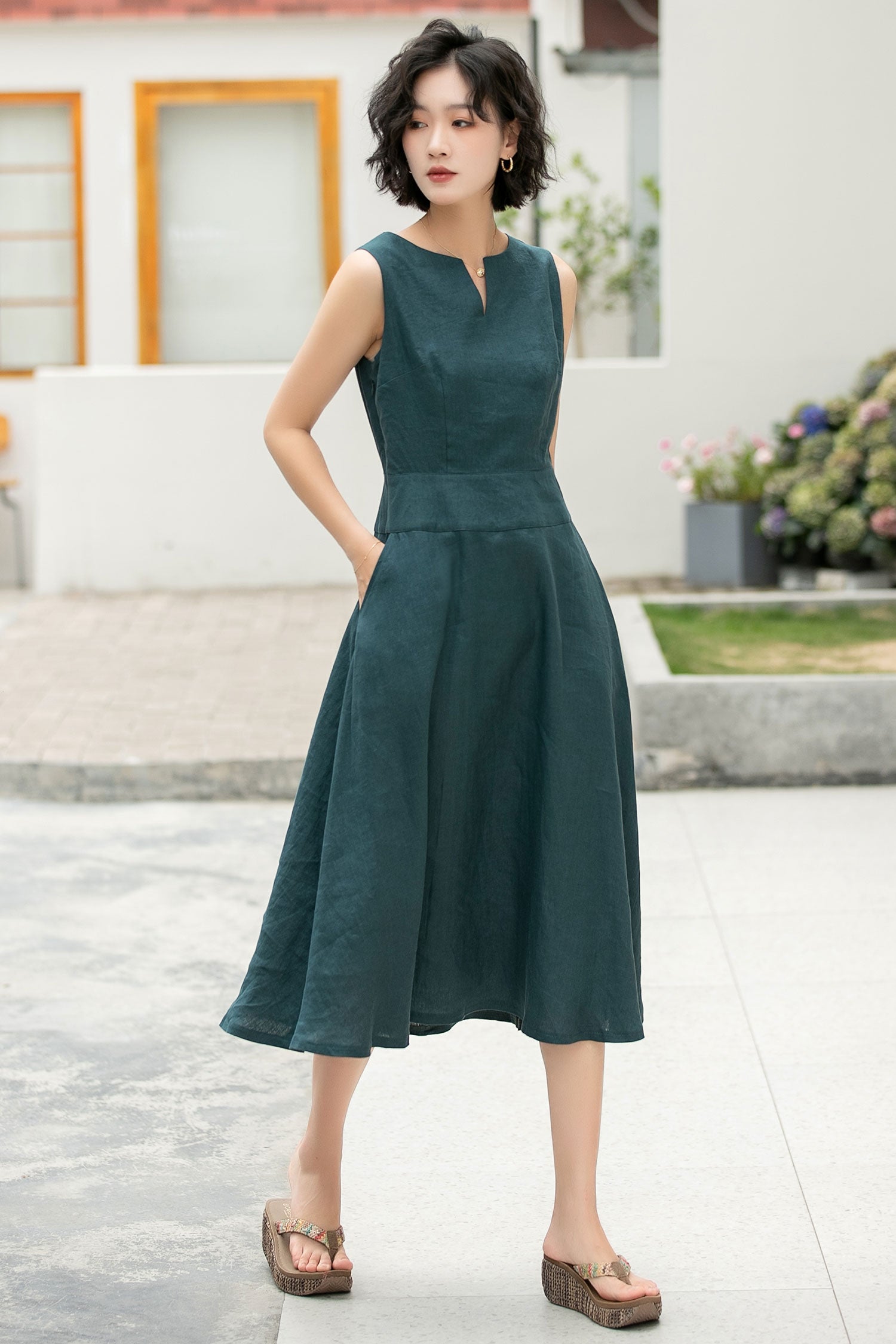 This teal linen midi dress is a breathable, easy-wearing sleeveless style that keeps you cool and comfortable while moving with a soft A-line flow. The waist-defining cut creates a flattering line, and the V-notch neckline adds a clean, classic finish for everyday wear or work.