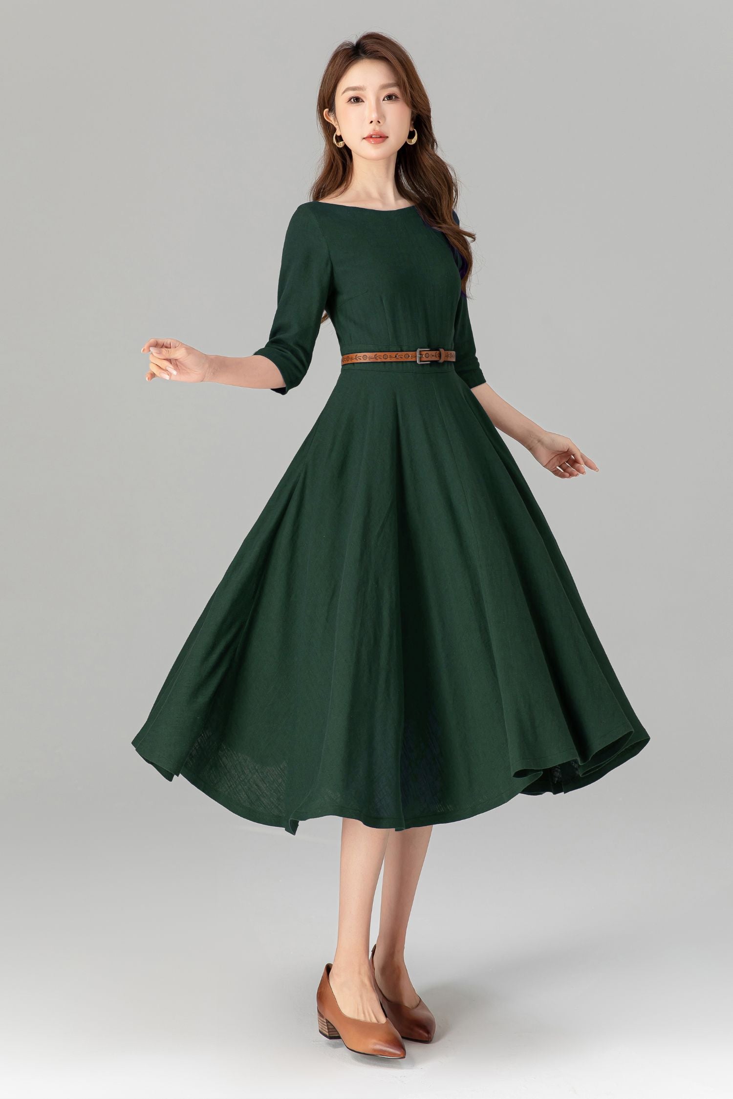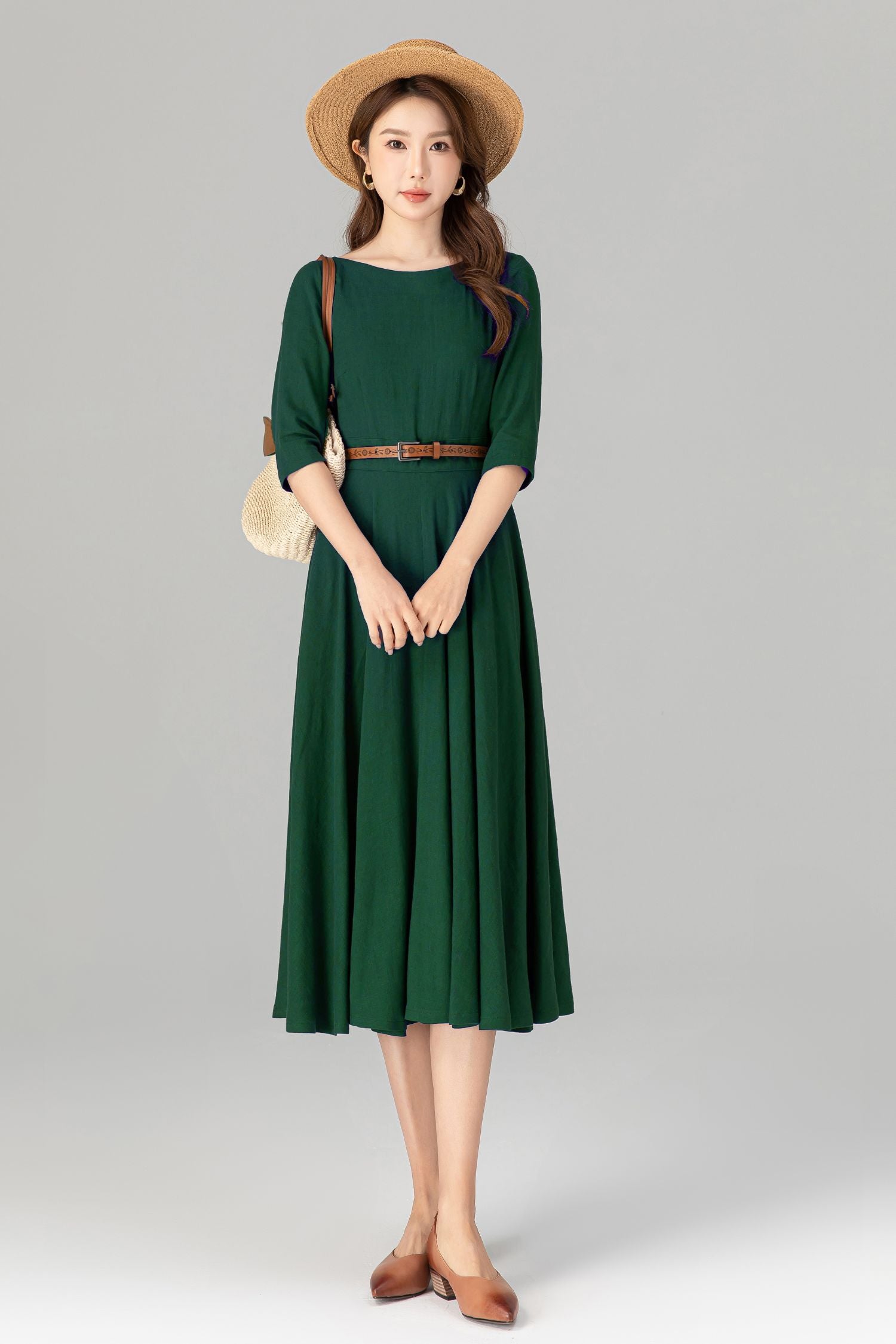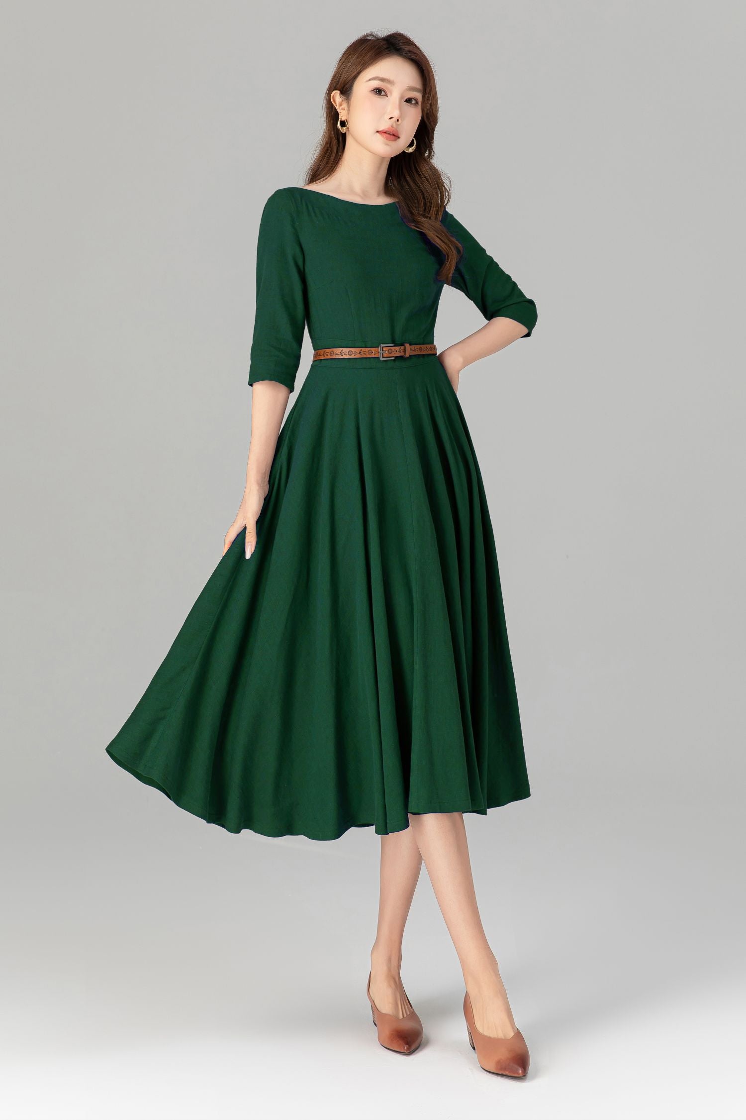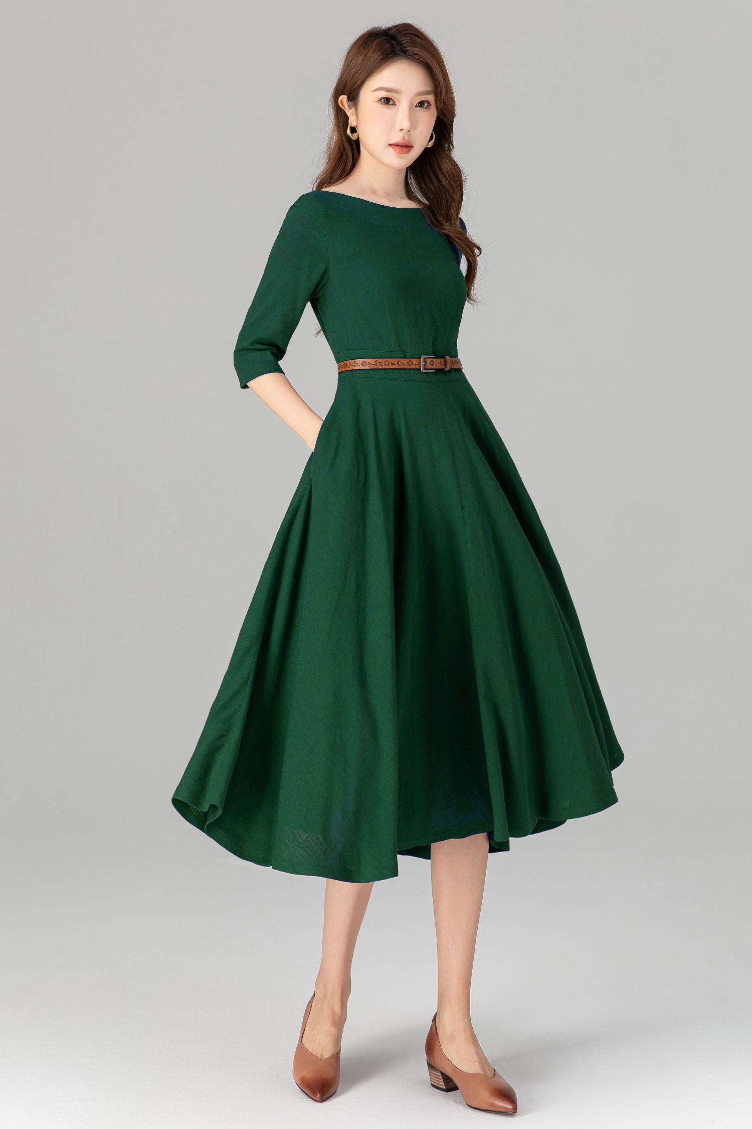 Handmade Green Linen Cotton Midi Dress – Classic Fit & Flare with Pockets 5580