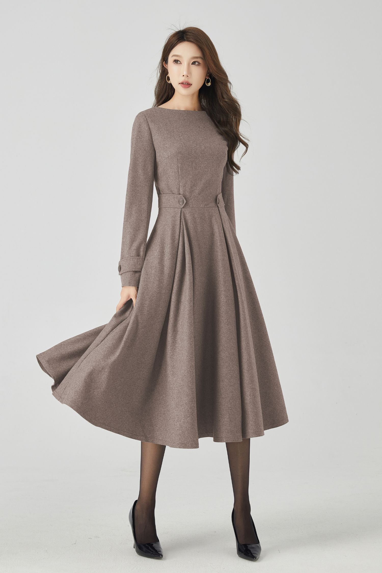 Brown Wool Dress – Handmade Fit & Flare Long Sleeve Midi | Xiaolizi 5444