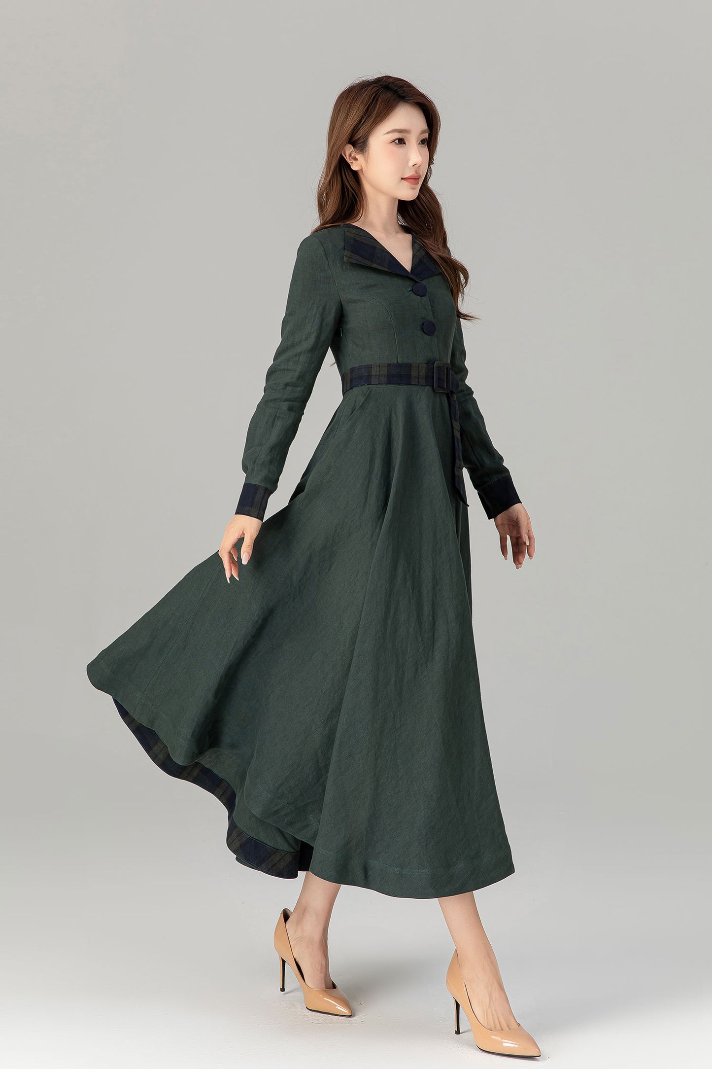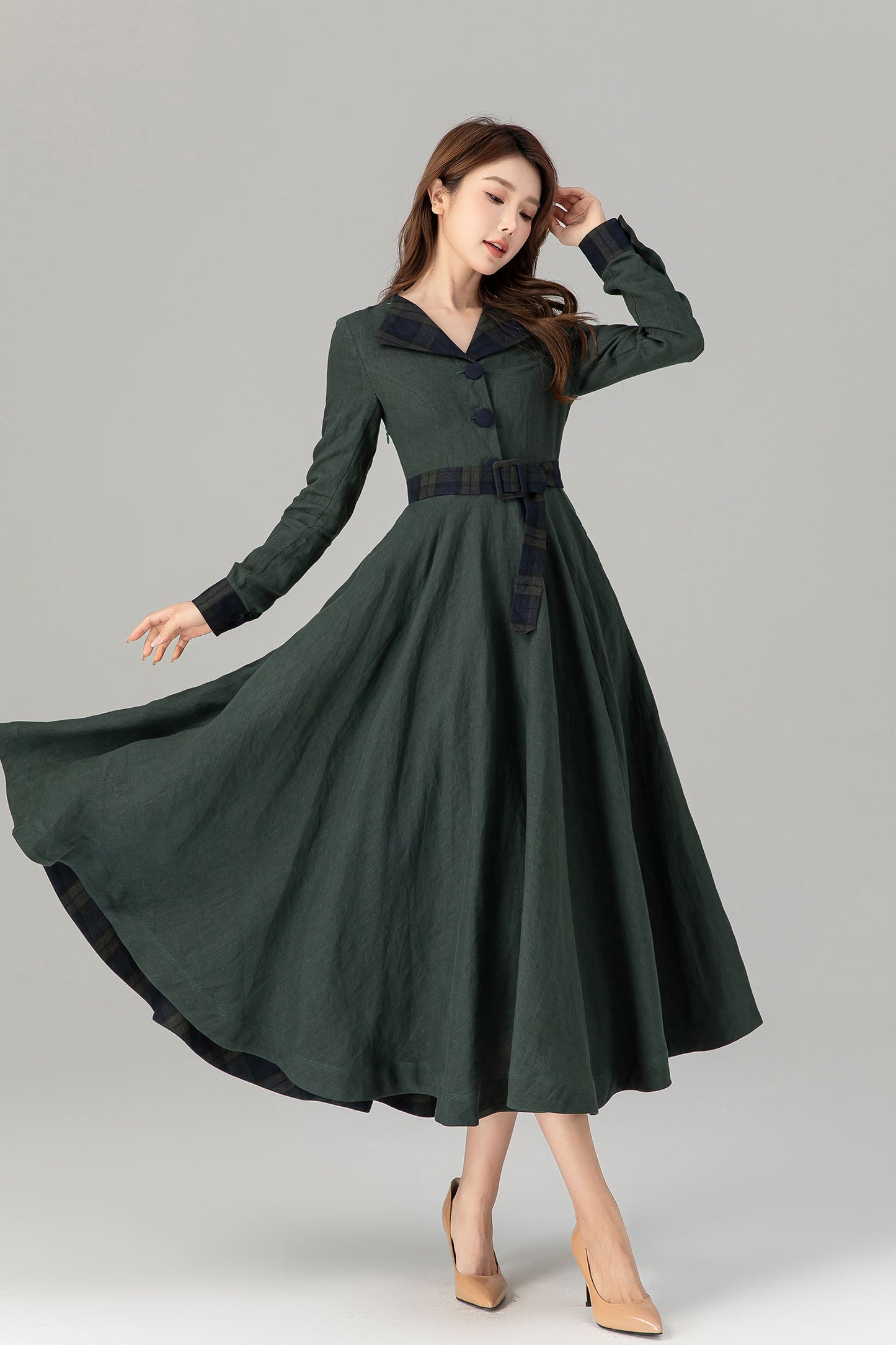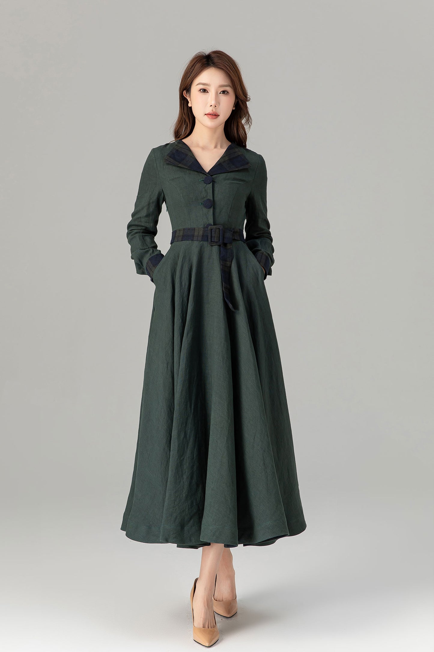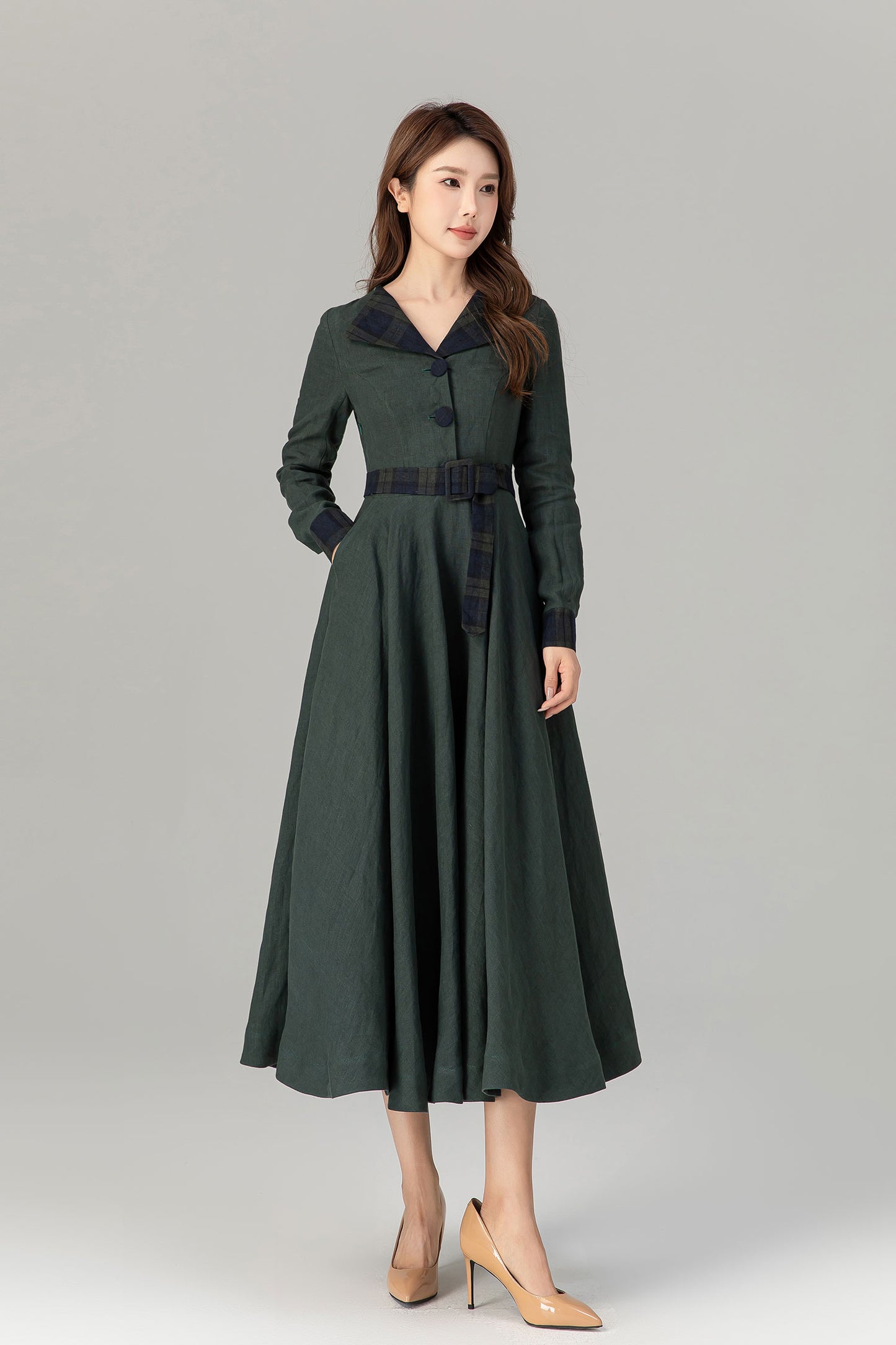 * 100% green linen with plaid belt, collar and sleeve hem